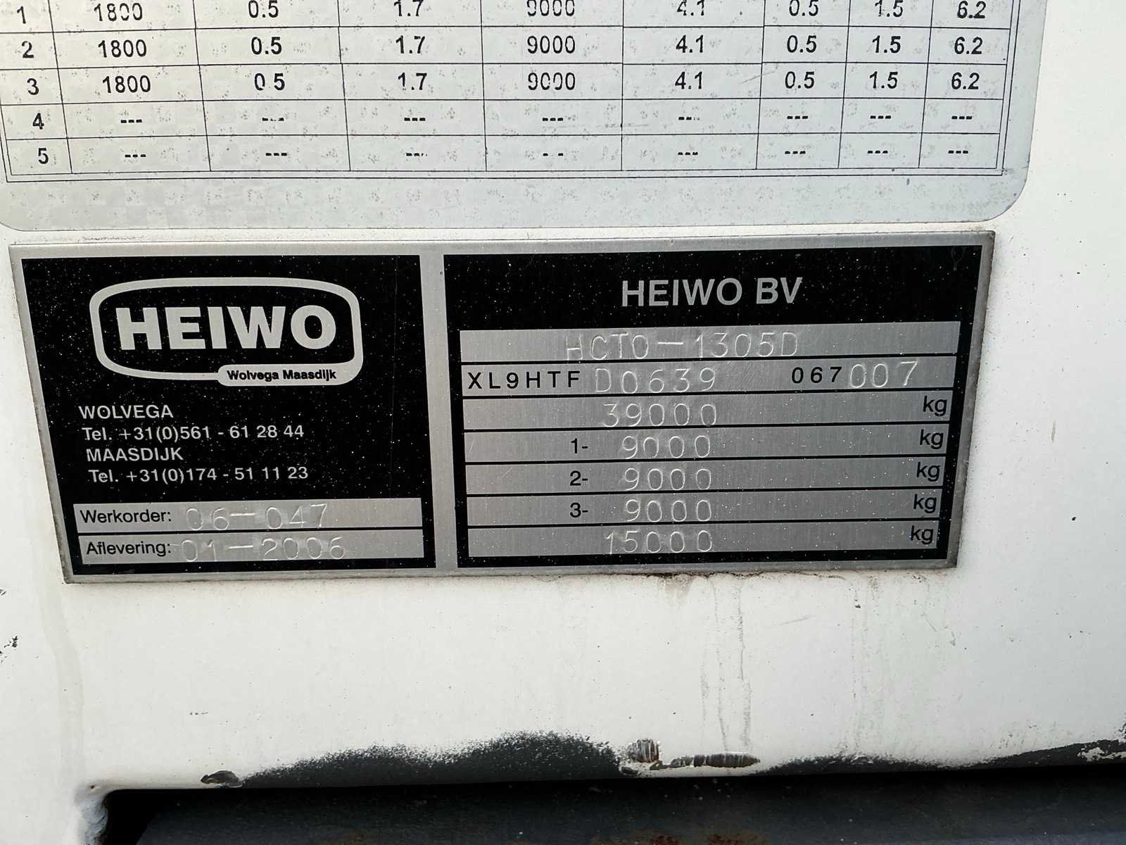 3e as is meesturende as, Laadklep Merk: HEIWO Type: HCTO-1305D Bouwjaar: 2006 Aantal assen: 3 Ledig gewicht: 10640kg Laadvermogen: 28360kg Datum eerste toelating: 2006-01-19 Datum eerste toelating (NL): 2006-01-19 APK vervaldatum: 2025-01-23 Kenteken: OJ-83-FF Hoogte: 400cm Lengte: 1360cm Breedte: 248cm Nationaliteit documenten: Nederland Zelf rijdend exporteren: Mogelijk