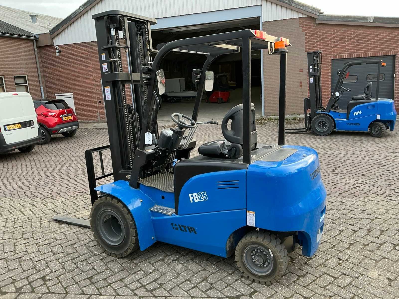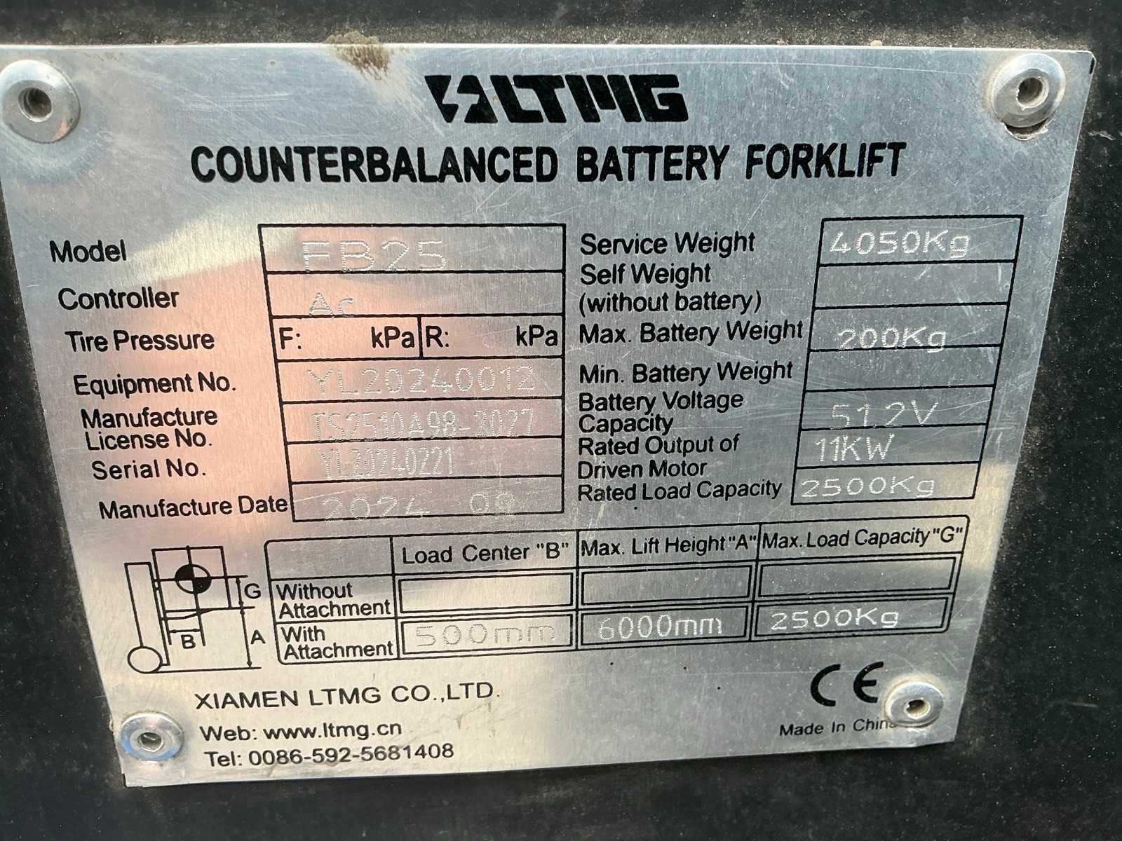 11Kw- 51.2V Merk: LTMG Type: FB25 Bouwjaar: 2024 Serienummer: YL20240221 Soort band: Volrubber banden Aantal wielen: 4 Accu lader: true Side-shift: true Triple mast: true Eigen gewicht: 4300kg Hefvermogen: 2500kg Lepellengte: 1070mm Max. hefhoogte: 6030mm Vol rubber banden: true Minimale doorrijhoogte: 2550mm Totale afmeting Breedte: 1600mm Totale afmeting Hoogte: 2550mm