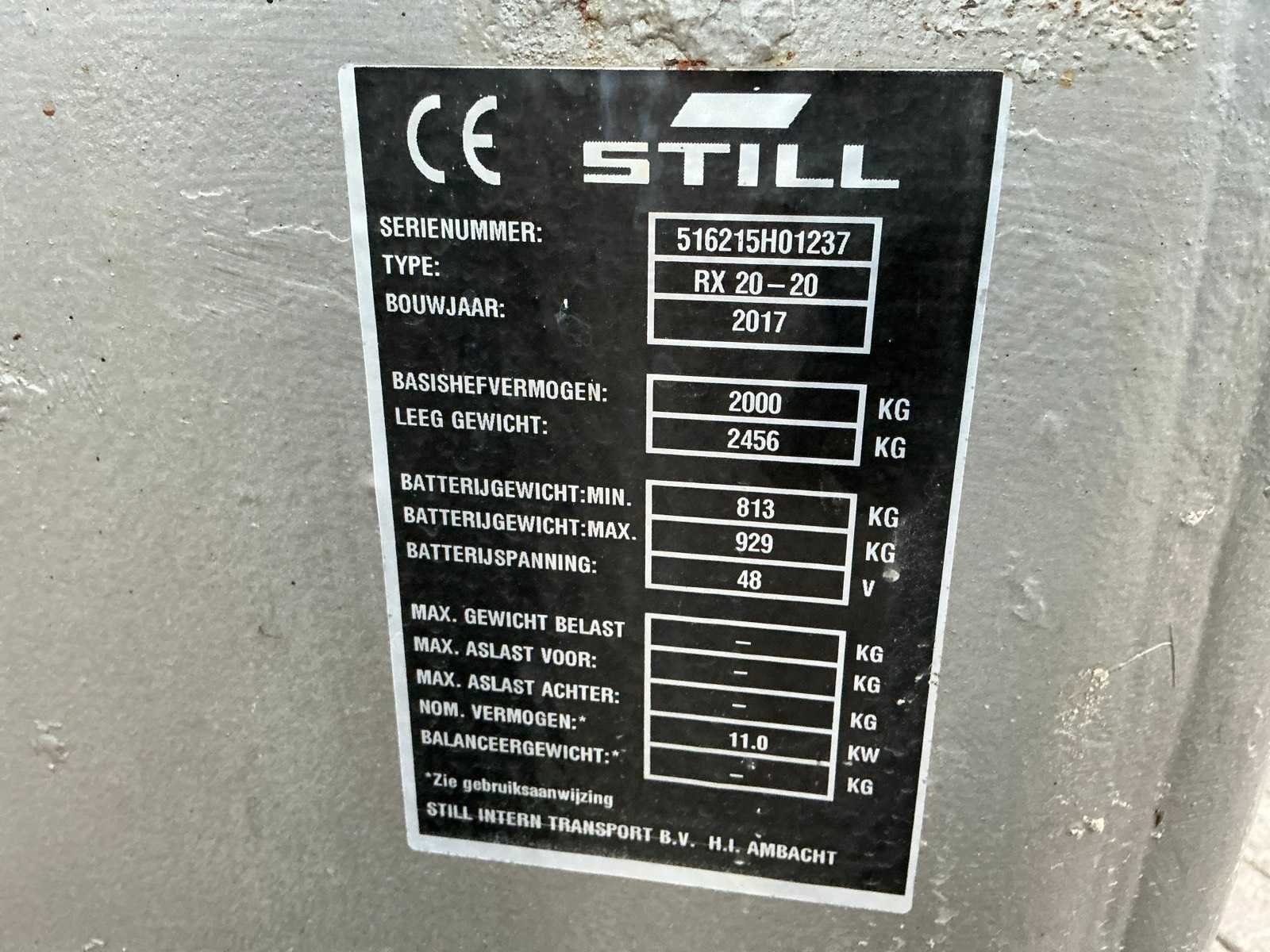 24V, incl lader Merk: STILL Type: RX-20-20 Bouwjaar: 1991 Serienummer: 516215H01237 Soort band: Volrubber banden Aantal wielen: 3 Afgelezen urenstand: 19647 Accu lader: true Hydraulisch verstelbare lepels: true Duplex mast: true Hefvermogen: 1500kg Lepellengte: 900mm Max. hefhoogte: 3160mm Vol rubber banden: true Minimale doorrijhoogte: 2100mm Totale afmeting Hoogte: 2100mm