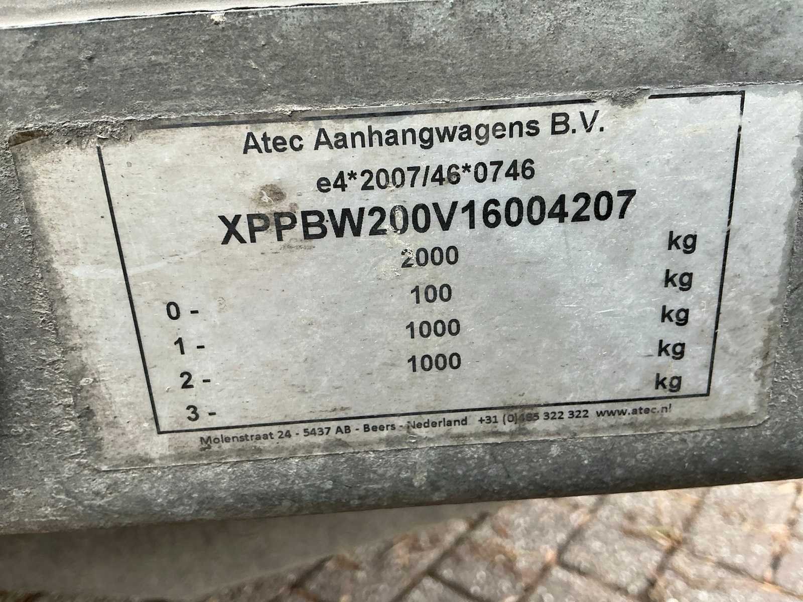 Merk: Atec Bouwjaar: 2016 Chassisnummer: XPPBW200V16004207 Aantal assen: 2 Laadbak afmeting l: 300cm Laadbak afmeting b: 128cm Ledig gewicht: 460kg Laadvermogen: 1540kg Datum eerste toelating: 2016-10-31 Datum eerste toelating (NL): 2016-10-31 Kenteken: 46-WP-KN Hoogte: 145cm Lengte: 460cm Breedte: 180cm Nationaliteit documenten: Nederland Zelf rijdend exporteren: Mogelijk