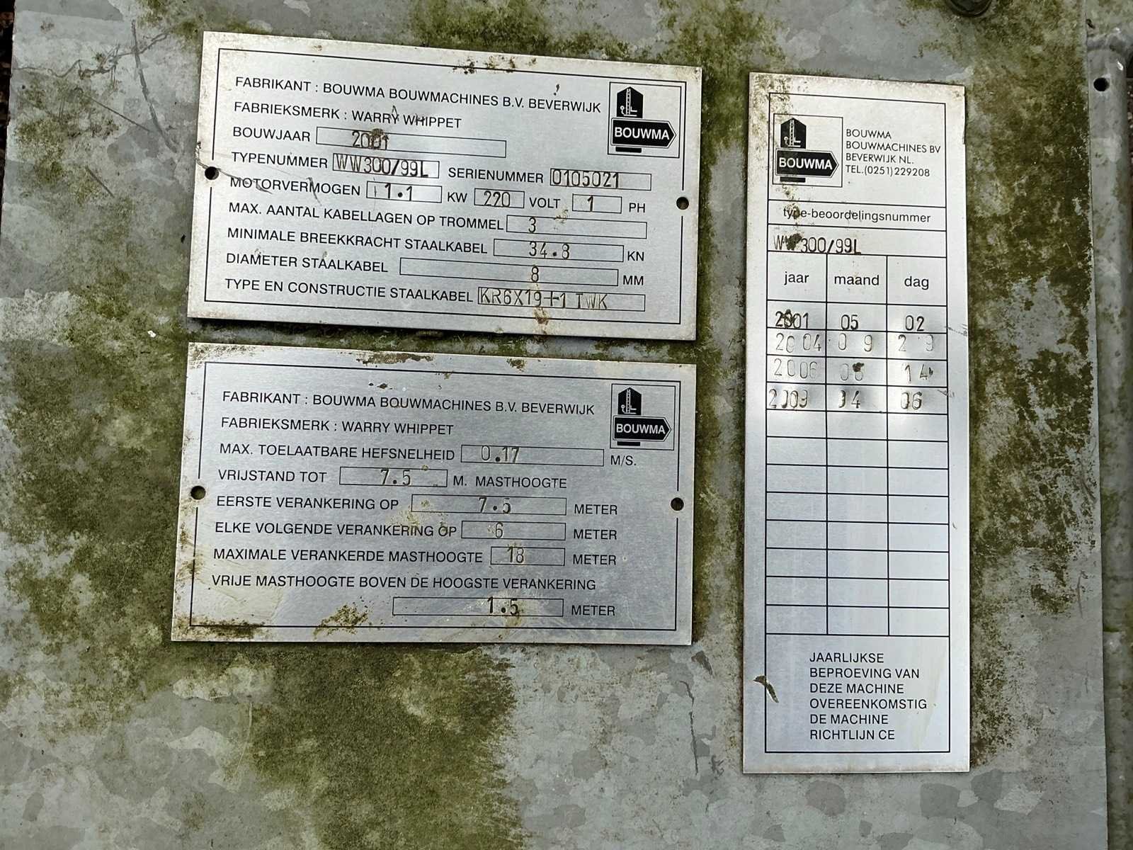 Merk: BOUWMA Type: WW300/99L Bouwjaar: 2001 Serienummer: 0105021 Staalkabel: true Hefhoogte: 7.5m Max. masthoogte: 9m Plateau afm. l: 1400mm Plateau afm. b: 1400mm Aantal mastdelen: 6 Aansluiting: 220V Motorvermogen (kW): 1.1kW Totale afmeting L: 10000mm Totale afmeting Breedte: 1570mm Totale afmeting Hoogte: 3100mm