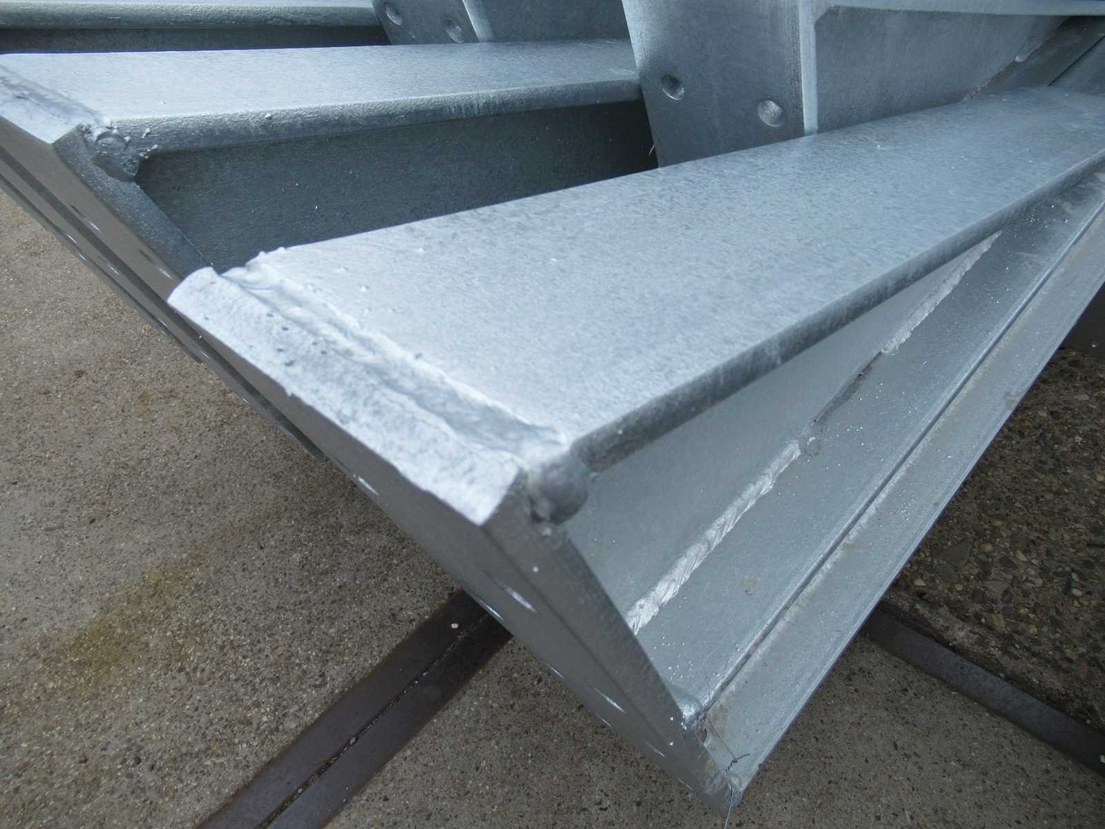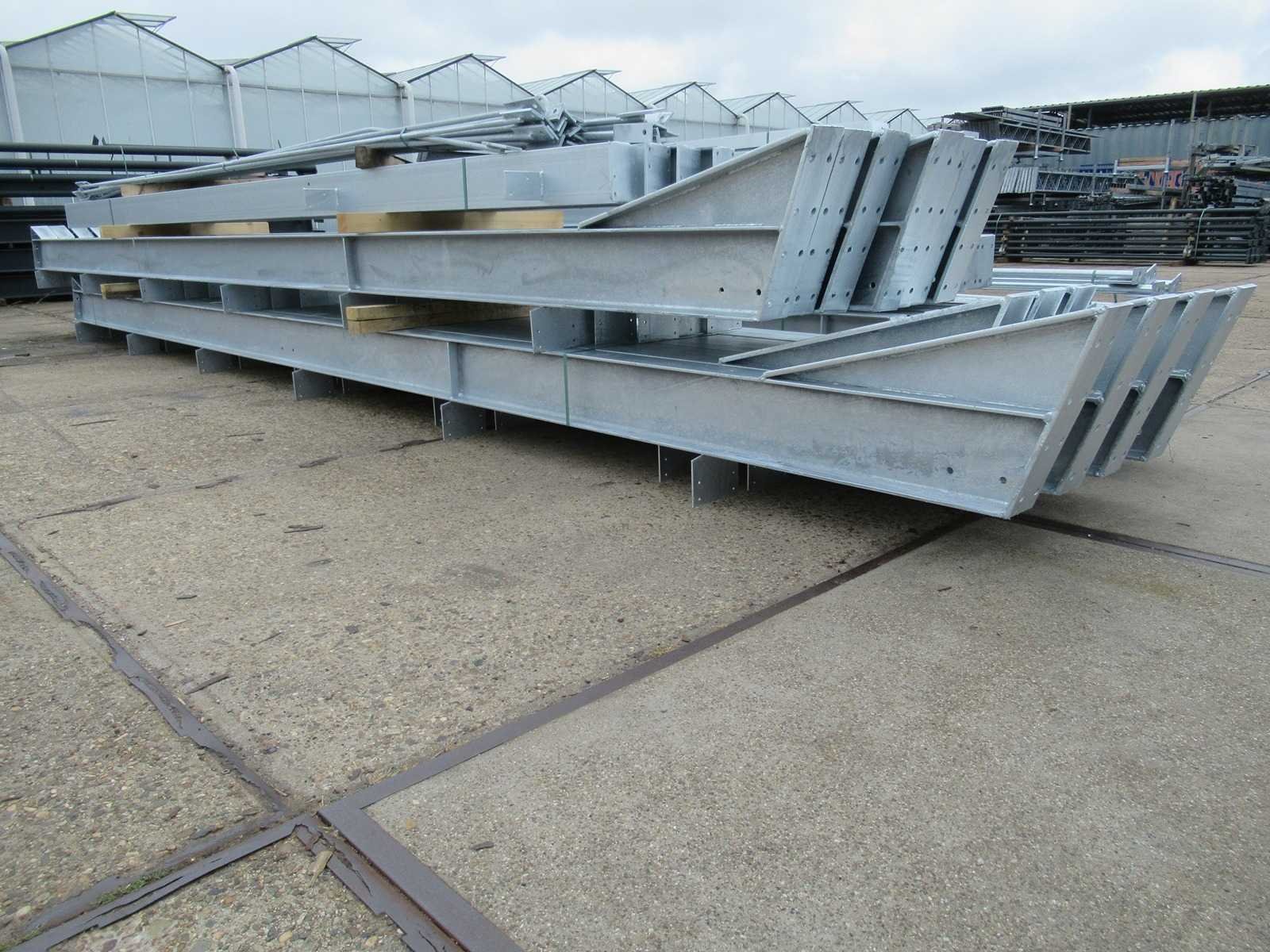 Nederlandse productie; vrije overspanning; spanten h.o.h. 5000mm; staalberekeningen; staaltekeningen; montagetekeningen; ankerplan; staal genummerd volgens montageplan; dakhelling 20 graden; 7 sets tussenspanten IPE 270/240; 2 sets eindspanten IPE 200/180 met windstijlen waarvan 1 set voorzien is van een deursparing; voorzien van drukkokers; windverbanden; gordinglippen; bouten en moeren; meestort ankers; staalconstructie volgens productnorm EN1090 (Certificaat na aankoop verkrijgbaar); kavel ligt netjes transportklaar en dient met 1 trailer opgehaald te worden; kavel wordt gratis met een heftruck geladen Materiaal: Thermisch verzinkt staal Bouwjaar: 2025 Totaal oppervlakte: 600m² Nok hoogte: 7230mm Goot hoogte: 4500mm Totale afmeting L: 40000mm Totale afmeting Breedte: 15000mm