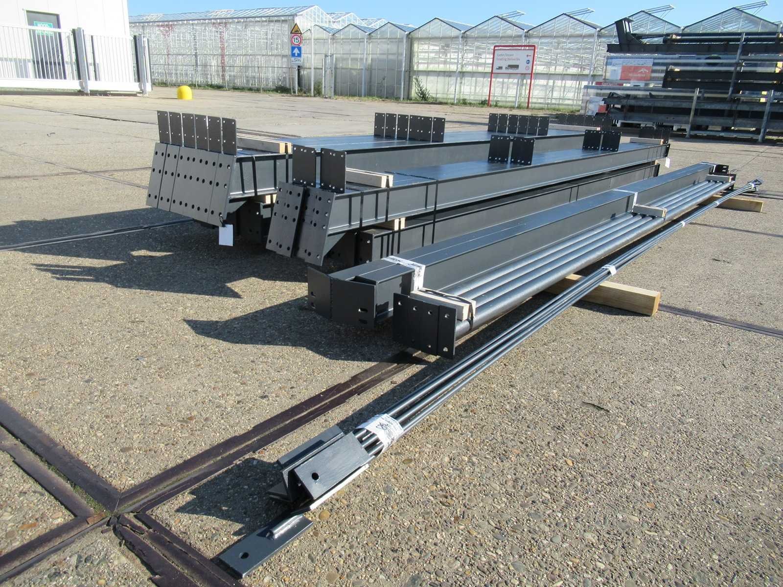 Vrije overspanning; spanten h.o.h. 5000mm; dakhelling 15 graden; 3 sets tussenspanten IPE180; 2 sets eindspanten met windstijlen IPE140; staaltekening; 3D-tekening; voorzien van drukkokers; windverbanden; gordinglippen op de spanten; kavel ligt netjes transportklaar en dient met 1 trailers opgehaald te worden; kavel wordt gratis met een heftruck geladen Materiaal: Geschilderd staal kleur blauw Totaal oppervlakte: 200m² Nok hoogte: 5850mm Goot hoogte: 4500mm Totale afmeting L: 20000mm Totale afmeting Breedte: 10000mm