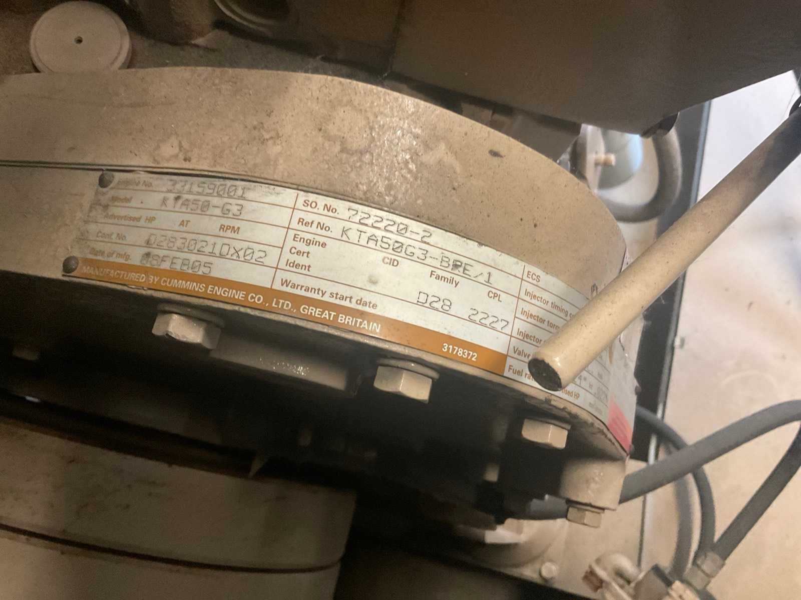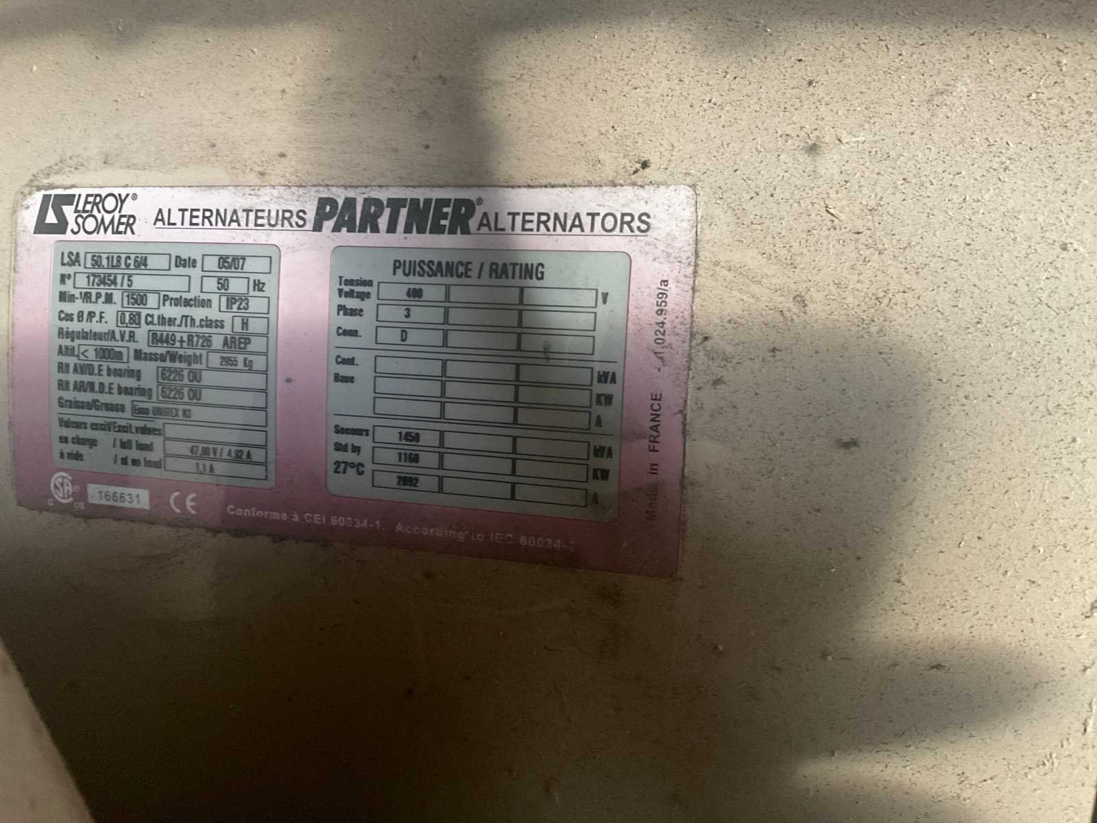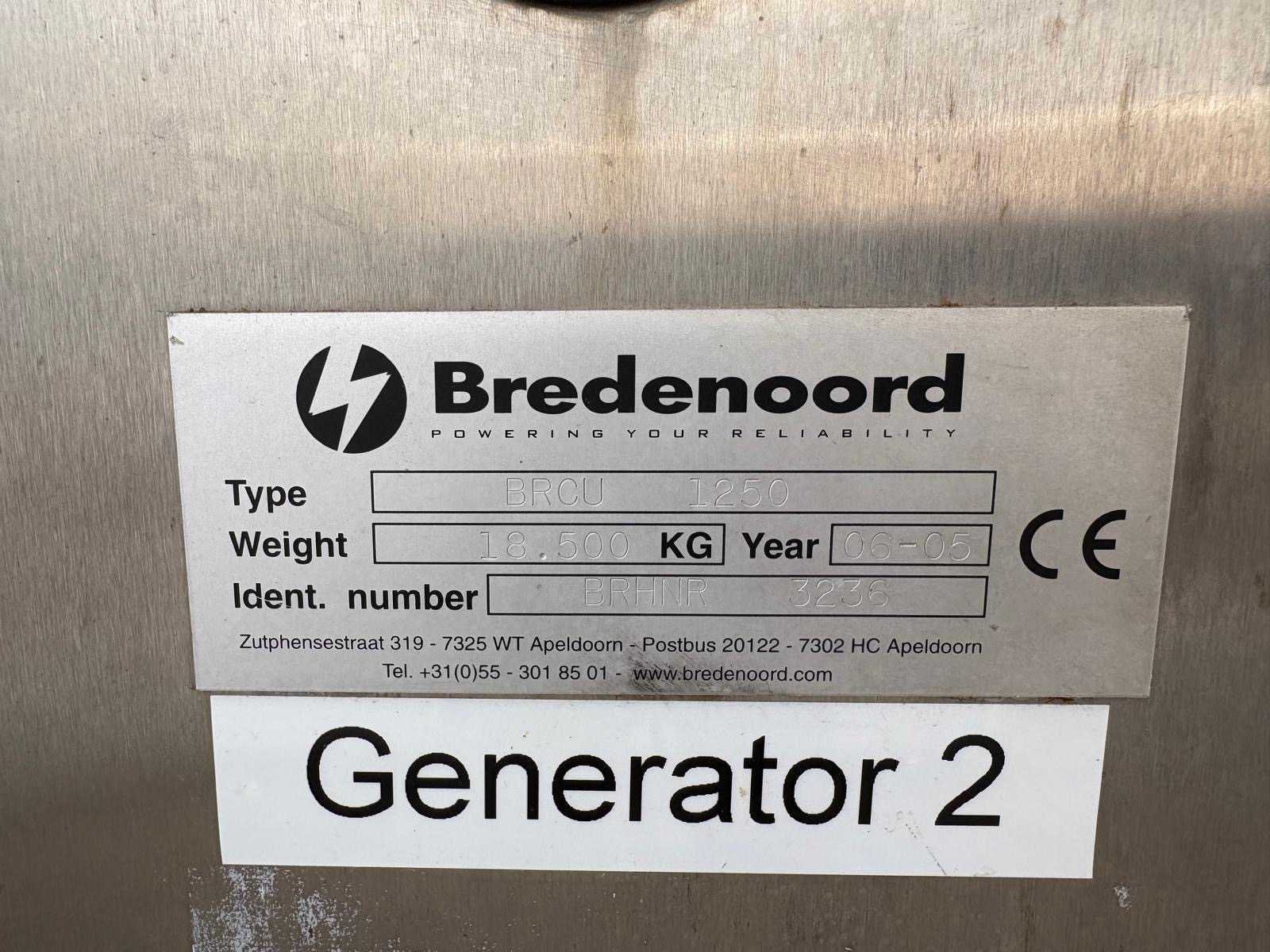 Afhalen i.o.m. OG medio eind januari. Merk: Bredenoord Type: GG30N Bouwjaar: 2005 Serienummer: 33159001 Capaciteit.: 1450kVA Aansluiting: 400V Motor merk: Cummins Motorcapaciteit: 1160kW Generator merk: Leroy somer Machinegewicht: 18500kg Totale afmeting L: 8300mm Totale afmeting Breedte: 2450mm Totale afmeting Hoogte: 2900mm Leveringsvoorwaarden: Niet gefundeerd - onverpakt