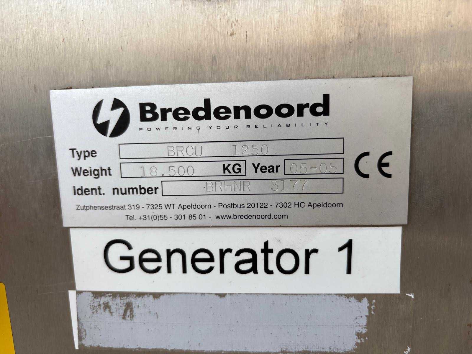 Afhalen i.o.m. OG medio eind januari. Merk: Bredenoord Type: GG30N Bouwjaar: 2005 Serienummer: 33159222 Capaciteit.: 1450kVA Aansluiting: 400V Motor merk: Cummins Motorcapaciteit: 1160kW Generator merk: Leroy somer Machinegewicht: 18500kg Totale afmeting L: 8300mm Totale afmeting Breedte: 2450mm Totale afmeting Hoogte: 2900mm Leveringsvoorwaarden: Niet gefundeerd - onverpakt