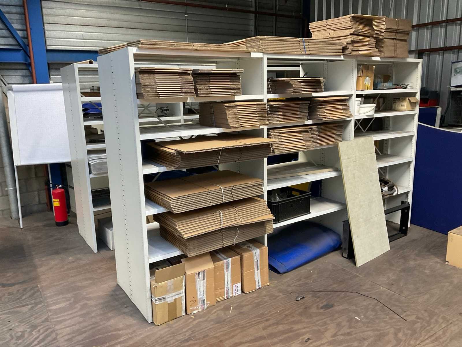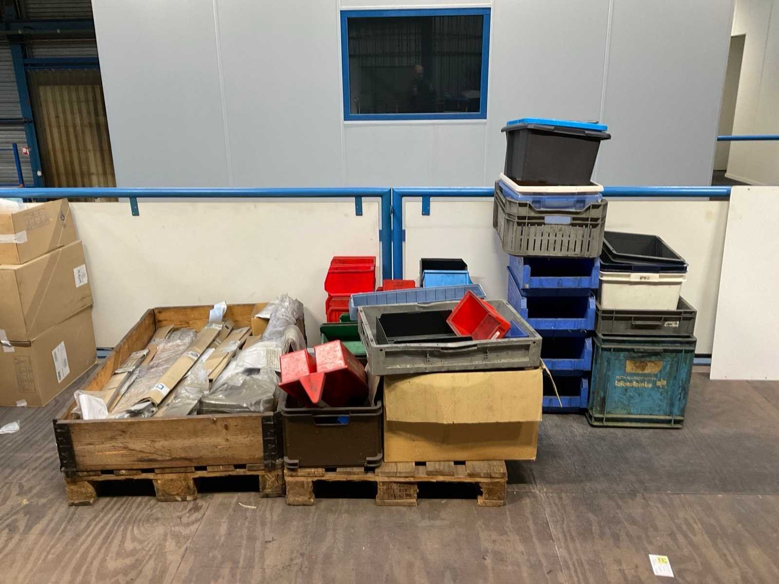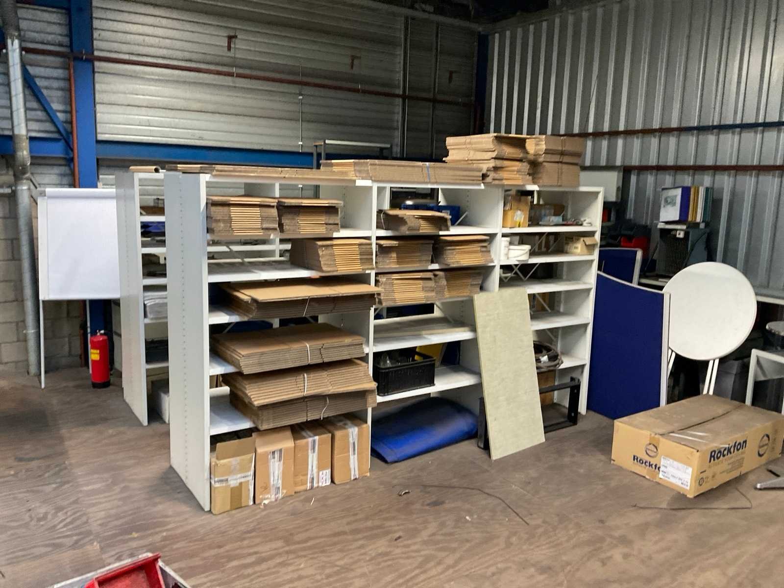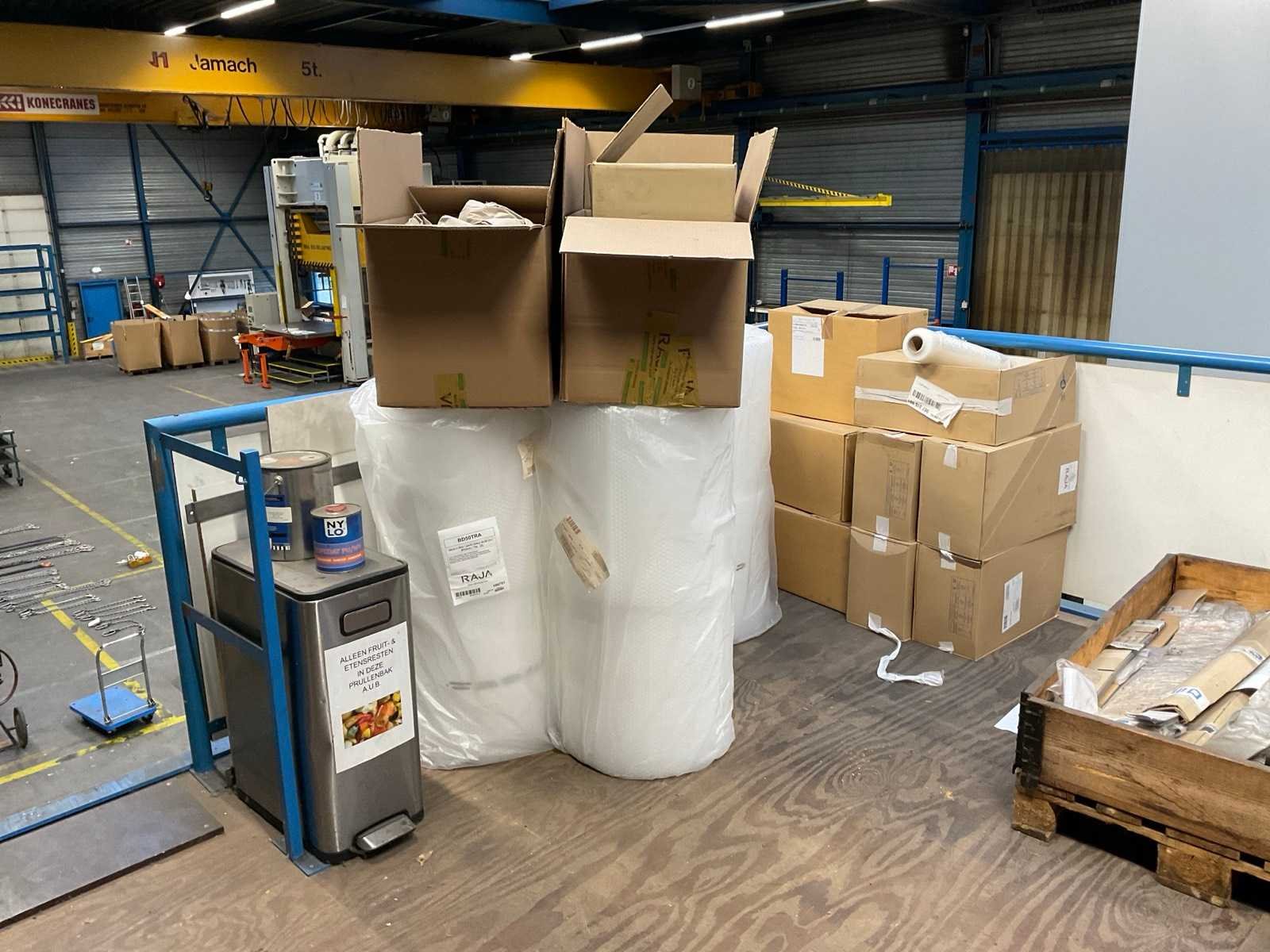 Bestaande uit: (2x) geschakelde stelling 335x74x196cm, (1x) Archiefkast, (1x) tafels, (4x) statafels, vouwdozen, (4x) rollen bubbelfolie, diverse onderdelen, kunststof bakken, room dividers, haspels, afvalbakken, (2x) pallets met onderdelen. Let op! Entresolvloer dient bezemschoon opgeleverd te worden. Zonder aard en nagelvast materialen behorende tot het pand.