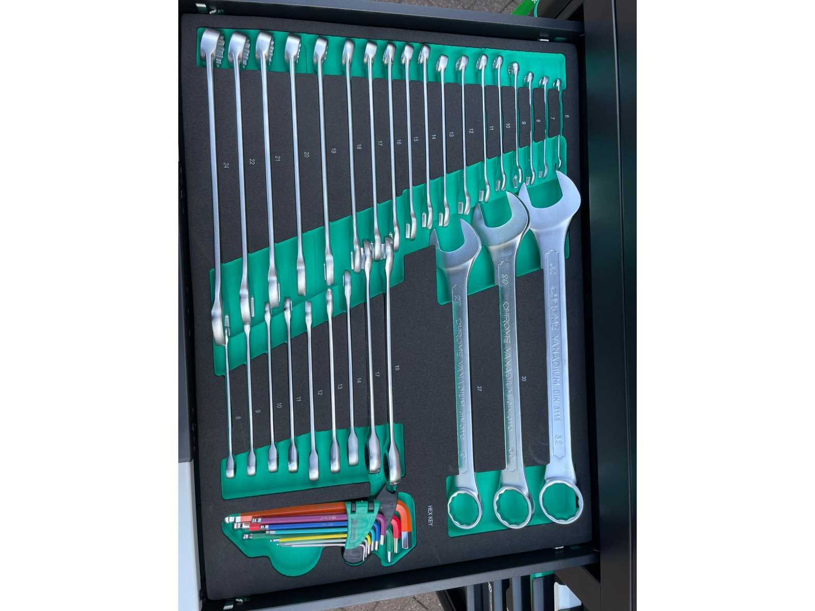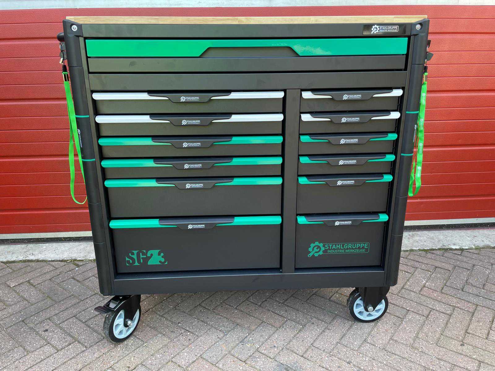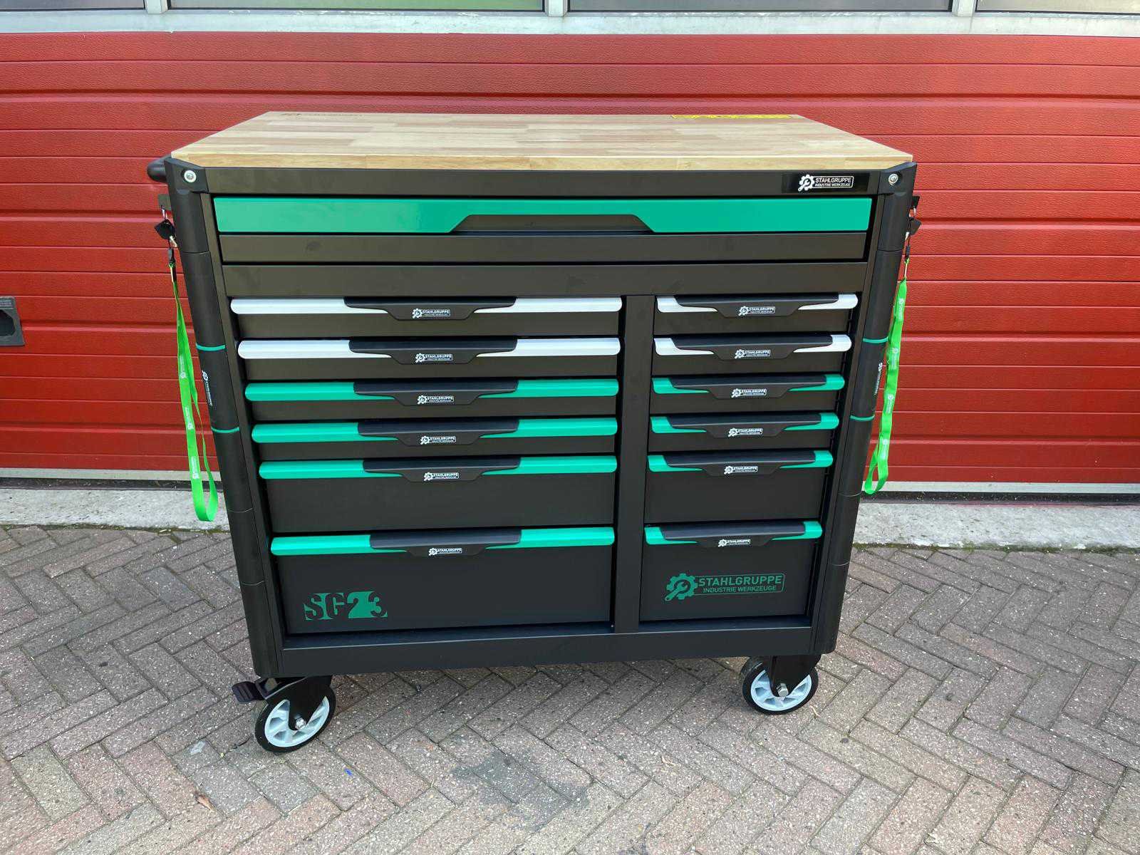 Voorzien van 11 gevulde laden; Gereedschap: chrome vanadium; Inhoud: 2 dopsleutel sets, momentsleutel, ringsteeksleutel set 6-32, ringratelsleutel 8-19, inbussleutel set, ringsleutel set 6-32, torx sleutel set T8-T70, schroevendraaier set (21 stuks), tangen set (9 stuks), beitel en doorslagen set (18 stuks), vijlen set (5 stuks), T-greep dopsleutel set 6-14, T-greep torx sleuel set T15-T45, hamers (3 stuks), VDE gereedschap (3 tangen en 7 schroevendraaiers), kabelschoentang set, enzovoort; Ongebruikt in doos Merk: Stahlgruppe Type: Jumbo GR Bouwjaar: 2024 Aantal laden: 13 Met inhoud: true Eigen gewicht: 138kg Totale afmeting L: 1100mm Totale afmeting Breedte: 620mm Totale afmeting Hoogte: 1120mm