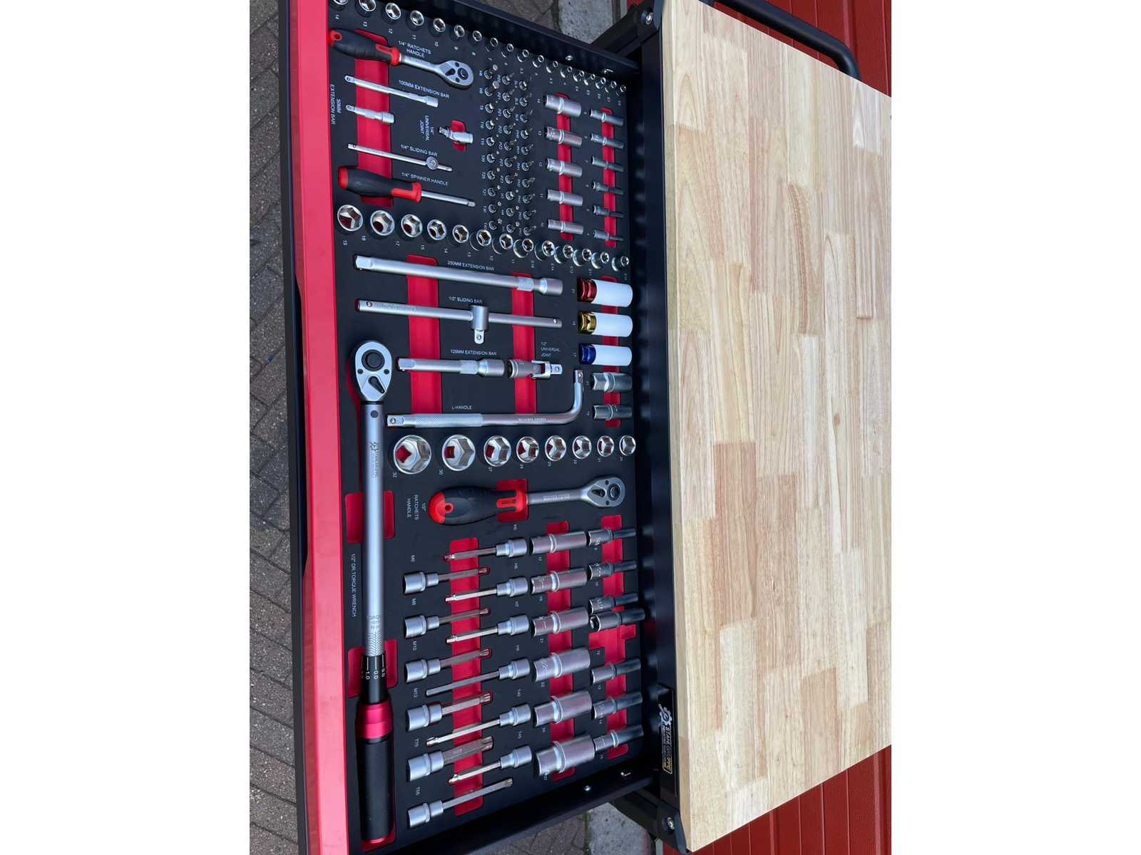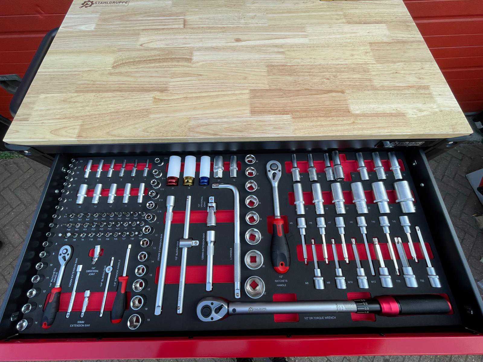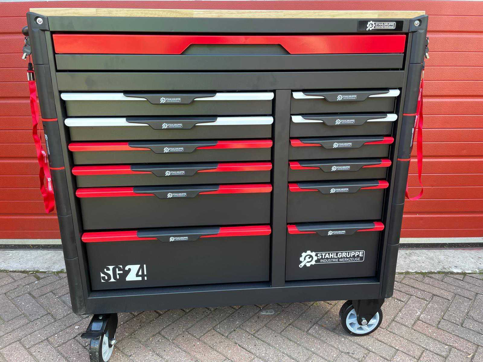 Gevulde gereedschapswagen; aantal gevulde laden: 11 gevulde laden; gereedschap: chrome vanadium; inhoud: 2 dopsleutel sets, momentsleutel, ringsteeksleutel set 6-32, ringratelsleutel 8-19, inbussleutel set, ringsleutel set 6-32, torx sleutel set T8-T70, schroevendraaier set (21 stuks), tangen set (9 stuks), beitel en doorslagen set (18 stuks), vijlen set (5 stuks), T-greep dopsleutel set 6-14, T-greep torx sleuel set T15-T45, hamers (3 stuks), VDE gereedschap (3 tangen en 7 schroevendraaiers), kabelschoentang set, enzovoort; staat: ongebruikt in doos Merk: Stahlgruppe Type: Jumbo R Bouwjaar: 2024 Aantal laden: 13 Met inhoud: true Eigen gewicht: 138kg Totale afmeting L: 1100mm Totale afmeting Breedte: 620mm Totale afmeting Hoogte: 1120mm