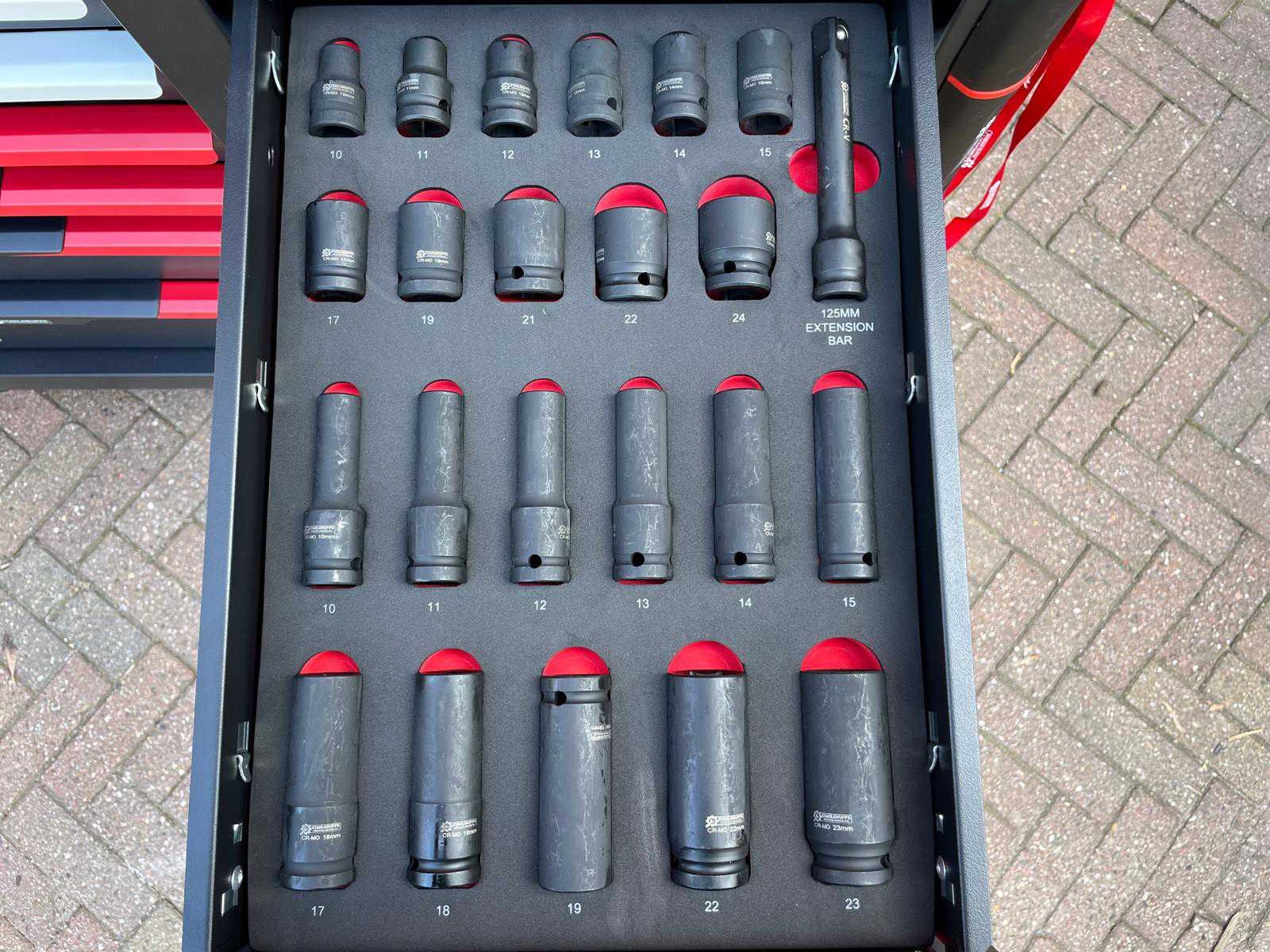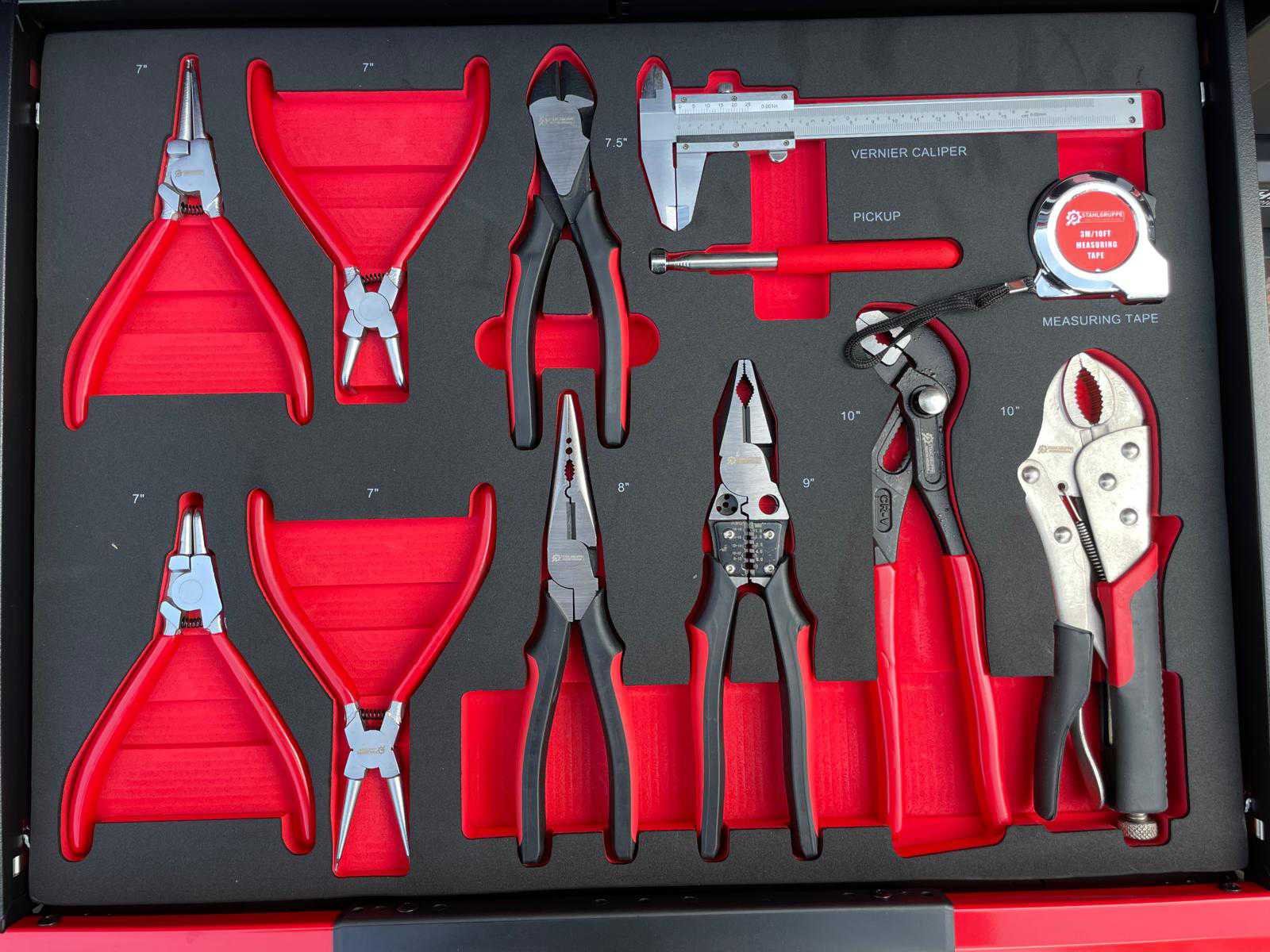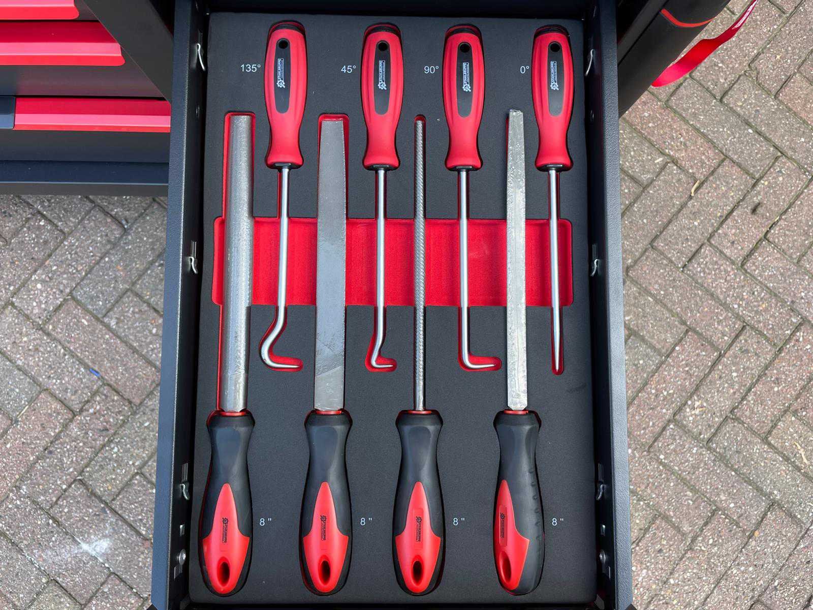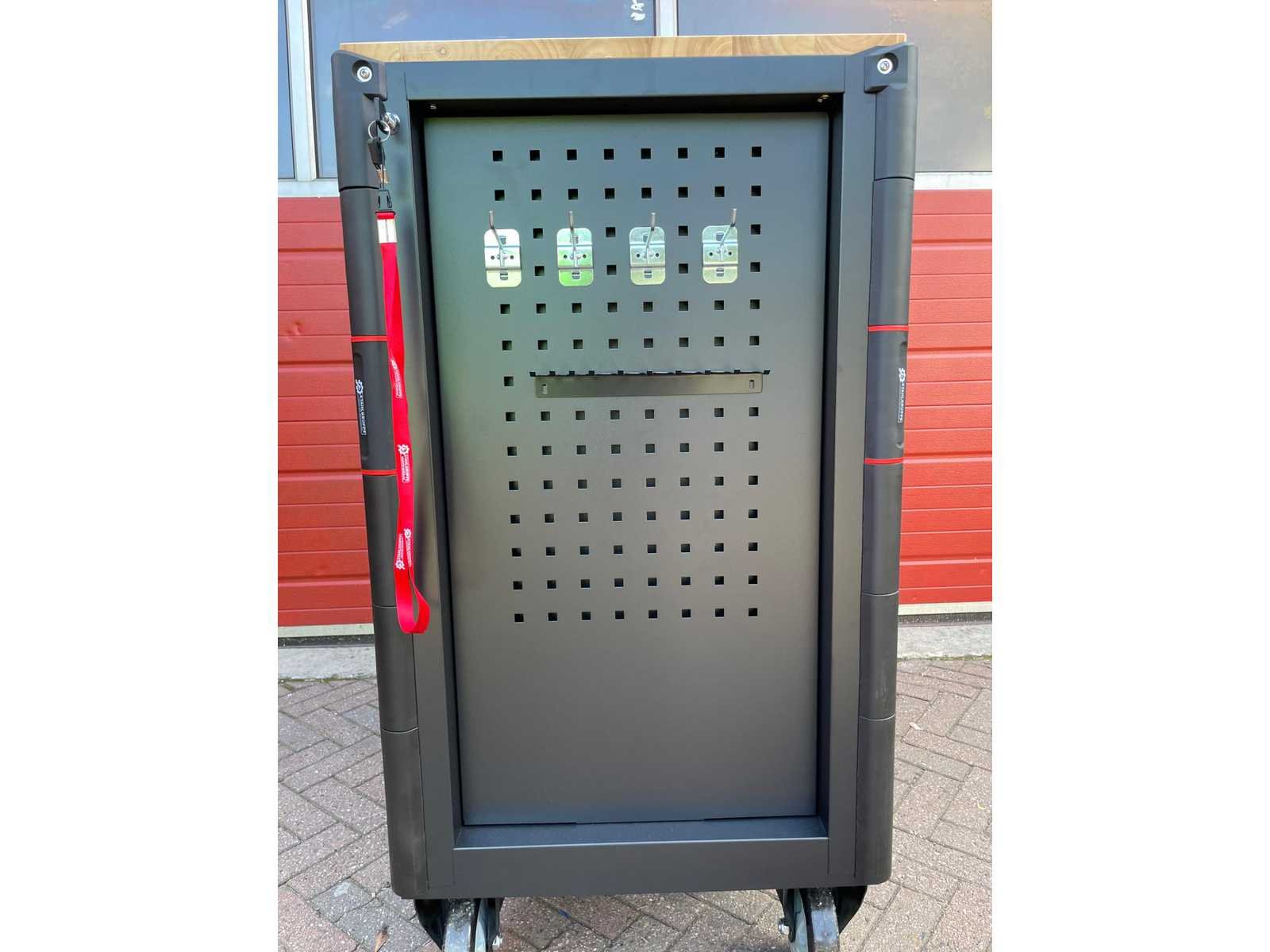 Gevulde gereedschapswagen; aantal gevulde laden: 11 gevulde laden; gereedschap: chrome vanadium; inhoud: 2 dopsleutel sets, momentsleutel, ringsteeksleutel set 6-32, ringratelsleutel 8-19, inbussleutel set, ringsleutel set 6-32, torx sleutel set T8-T70, schroevendraaier set (21 stuks), tangen set (9 stuks), beitel en doorslagen set (18 stuks), vijlen set (5 stuks), T-greep dopsleutel set 6-14, T-greep torx sleuel set T15-T45, hamers (3 stuks), VDE gereedschap (3 tangen en 7 schroevendraaiers), kabelschoentang set, enzovoort; staat: ongebruikt in doos Merk: Stahlgruppe Type: Jumbo R Bouwjaar: 2024 Aantal laden: 13 Met inhoud: true Eigen gewicht: 138kg Totale afmeting L: 1100mm Totale afmeting Breedte: 620mm Totale afmeting Hoogte: 1120mm