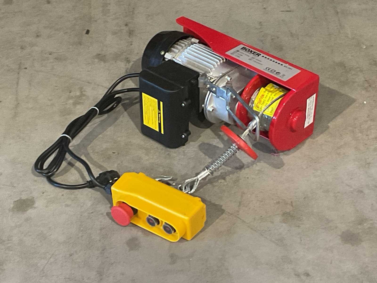 Voorzien van katrol; Motorvermogen: 1500 W; Maximale Laadcapaciteit (enkel / dubbel-kabel): ca. 125kg / 250kg; Maximale Hefhoogte (125kg / 250kg): 12m / 6m; Gem. hijssnelheid: 10 m/min;Aansluiting: 230V; 1 x elektrische lier; 1 x katrol met haak; 1 x montagebeugels; 1 x Bekabelde afstandbediening 1,45; Ongebruikt in doos (Afmeting transport verpakking 355x190x235 mm lxbxh, gewicht 11.36 kg) Merk: Boxer Type: BX-561 250kg Bouwjaar: 2025 Capaciteit.: 1000kg Hijshoogte: 12m Afstandsbediening: true Aansluiting: 220V Totale afmeting L: 355mm Totale afmeting Breedte: 190mm Totale afmeting Hoogte: 235mm Eigen gewicht: 11.36kg