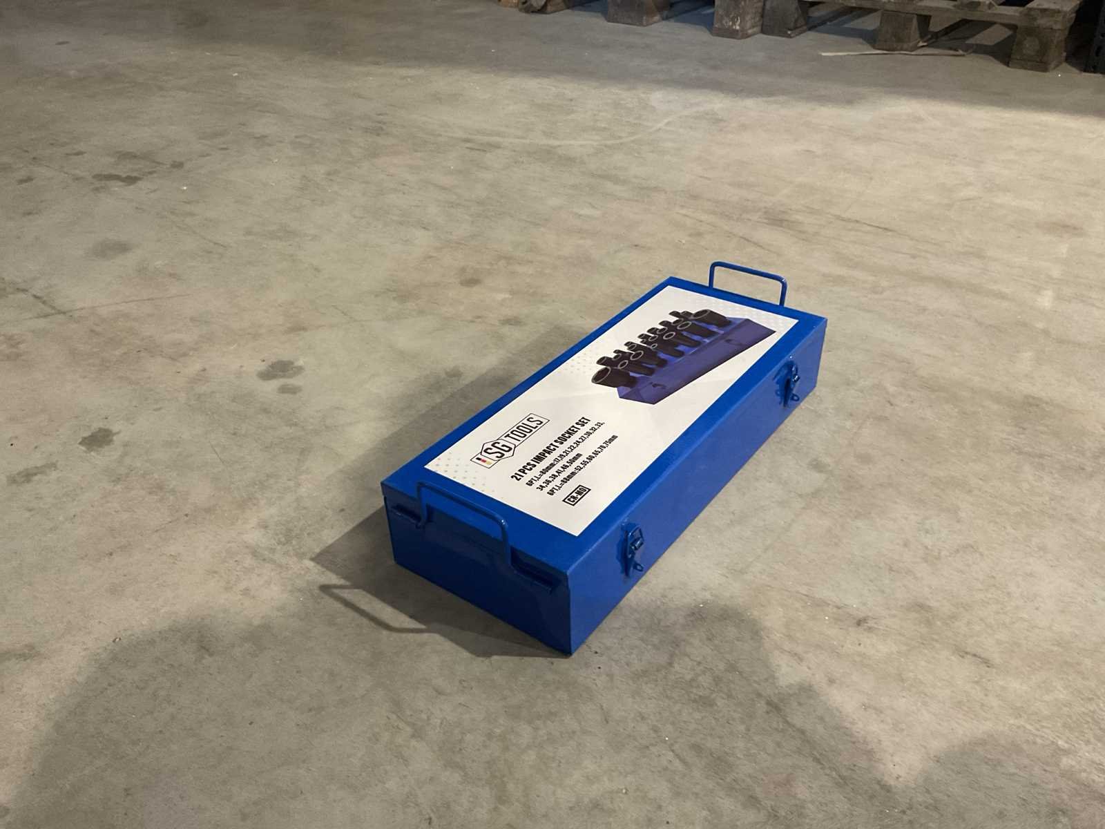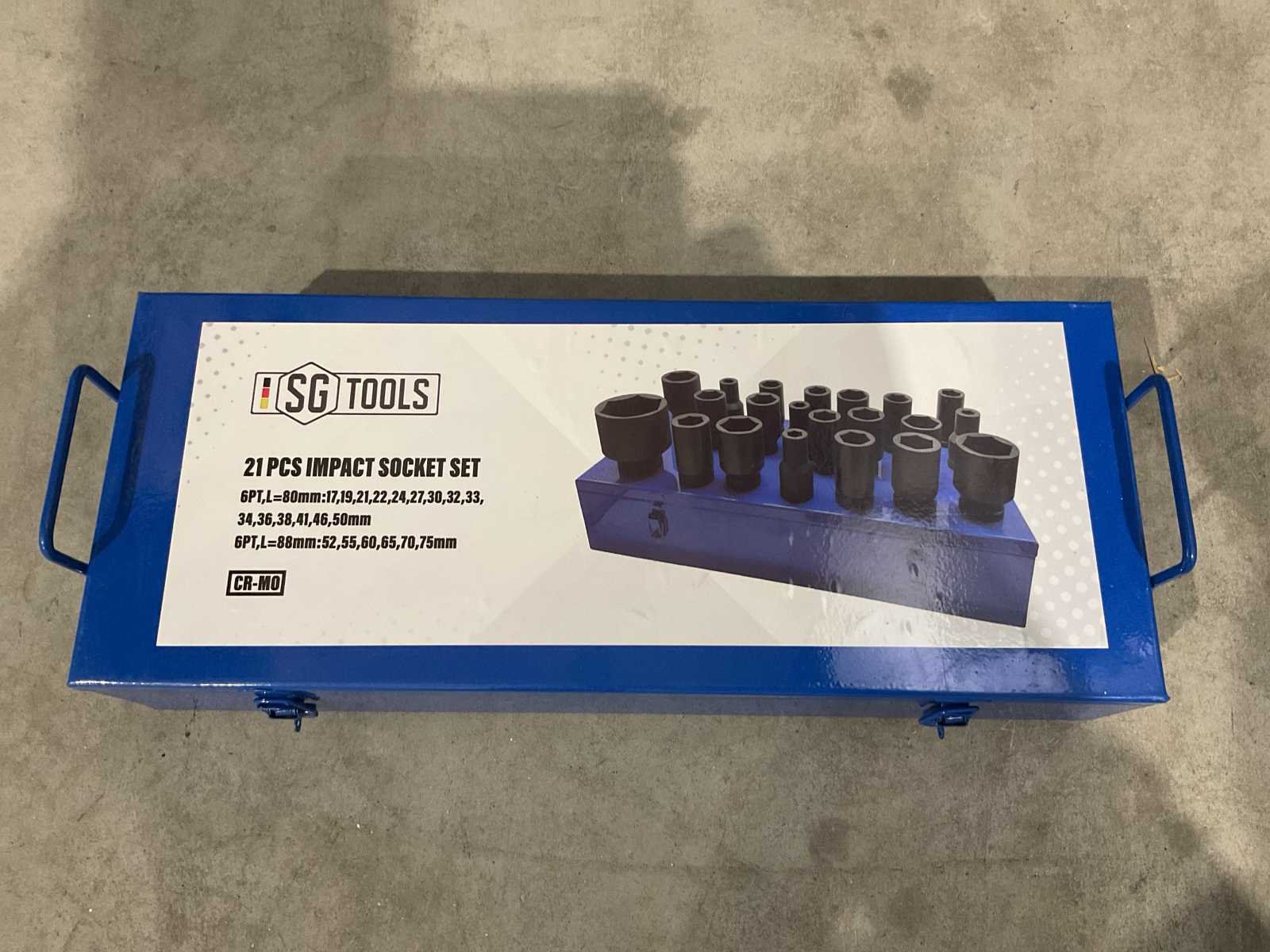 Voorzien van Krachtdoppenset; 3/4" maten: 17, 19, 21, 22, 24, 27, 30, 32, 33, 34, 36, 38, 41, 46, 50 mm; 1" doppen: 52, 55, 60, 65, 70, 75 mm; Ongebruikt in doos (gewicht inclusief verpakking 22,90 kg) Merk: SG Tools Delig: 21 Krachtdop uitvoering: true Type: 21 PCS impact Socket Set1 Bouwjaar: 2025