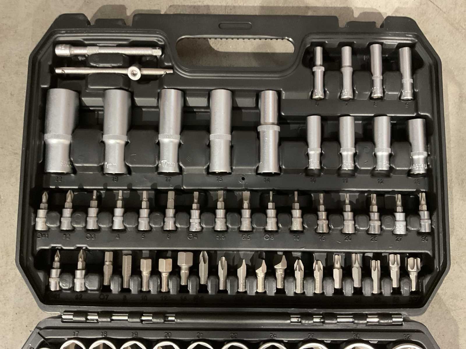 Voorzien van 1/4" Doppen 4-4.5-5-5.5-6-7-8-9-10-11-12-13-14mm; 1/4" Lange doppen 6-7-8-9-10-11-12-13mm; 1/4" Torx doppen E4-E5-E6-E7-E8; 1/4" Inbus op dop 3-4-5-6mm; 1/4" Philips op dop PH.1-PH.2; 1/4" Pozidriv op dop PZ.1-PZ.2 1/4" Platte bit op dop 4-5.5-6.5mm; 1/4" Torx op dop T8-T10-T15-T20-T25-T27-T30; 1/4" Ratel 72 tanden Quick release; 1/4" Verlengstukken 50-100mm; 1/4" Kniegewricht; 1/4'' T Hendel; 1/4" Spinner; 1/2" Doppen 10-11-12-13-14-15-16-17-18-19-20-21-22-24-27-30-32mm; 1/2" Lange doppen 14-15-17-19-22mm; 1/2" Torx doppen E10-E11-E12-E14-E16-E18-E20-E24; 1/2" Inbus bitten 7-8-10-12-14mm; 1/2" Philips bitten PH.3-PH.4; 1/2" Pozidriv bitten PZ.3-PZ.4; 1/2" Platte bitten 8-10-12mm; 1/2" Torx bitten T40-T45-T50-T55-T60; 1/2" Bit houder; 1/2" Ratel 72 tanden Quick release; 1/2" Verlengstukken 125-250mm; 1/2" Bougiedoppen 16-21mm; 1/2" Kniegewricht; Inbus L-sleutels 1.5-2-2.5mm; Ongebruikt in doos (Transport Afmeting 380 x 80 x 290, Gewicht 6.52kg) Merk: Metallo Met koffer: true Delig: 108 Type: META-108W Bouwjaar: 2025