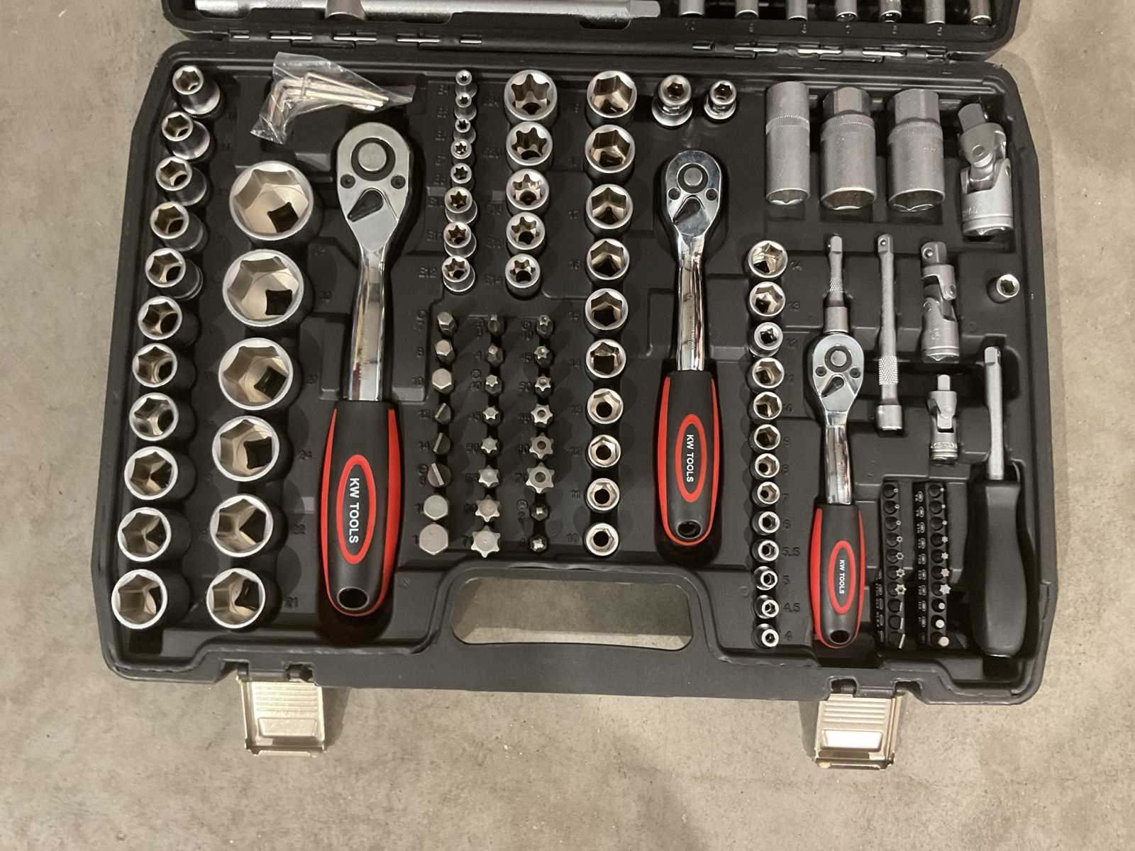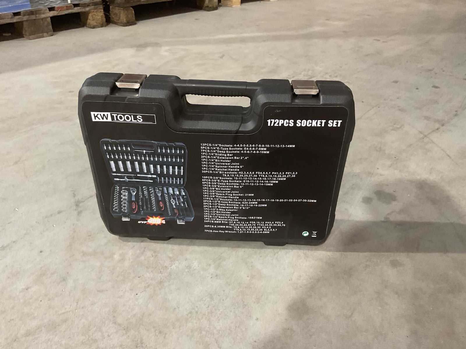 13 stuks 1/4 " Socket: 4,4,5,5,5,5,6,7,8,9,10,11,12,13,14 mm; 7 stuks 1/4 " diepe wandcontactdoos 4,5,6,7,8,9,10 mm; 5 stuks 1/4 " E-doppen E4, E5, E6, E7, E8; 2 stuks 1/4 " verlengstang 2 'en 4"; 1 stuk 1/4 " Sliding T-Bar; 1 stuk 1/4 " universele koppeling; 1 stuk 1/4 " koppeling; 1 stuk 1/4 " Quick Release ratelhendel; 30 stuks 1/4 " Bit-doppen; 10 stuks 3/8 " Doppen 10,11,12,13,14,15,16,17,18,19mm; 6 stuks 3/8 " Sockets 10,11,12,13,14,15; 5 stuks 3/8 " E-doppen E10, E11, E12, E14, E16, E18; 1 stuk 3/8 " Extention Bar 5"; 1 stuk 3/8 " koppeling ;1 stuk 3/8 " Bougie Dop 18 mm; 1 stuk 3/8 " Quick Release Ratchet Hanlde;18 stuks 1/2 " Sockets 10,11,12,13,14,15,16,17,18,19,20,21,22,23,24,27,30,32mm; 5 stuks 1/2 " diepe doppen 16,17,18,19,22 mm; 3 stuks 1/2 " E-doppen E20, E24; 2 stuks 1/2 " Extension Bar 5" & 10 "(met driewegadapter); 1 stuk 1/2 " universele verbinding; 1 stuk 1/2 " koppeling; 2 stuks 1/2 " Bougie Dop 16 mm en 21 mm; 1 stuk 1/2 " Quick Release ratelhendel; 1 stuk Inbussleutel Set 1,1.5,2,2.5,3,4,5mm; 20 stuks 25mm bits in bits houder; 24 stuks 30mm bits; 1 stuk spinnerhandvat; Ongebruikt in doos (Transport afmeting 460 x 95 x 350, Gewicht 8.68 KG) Merk: KW Tools Met koffer: true Delig: 172 Type: 172PCS Socket Set Bouwjaar: 2025