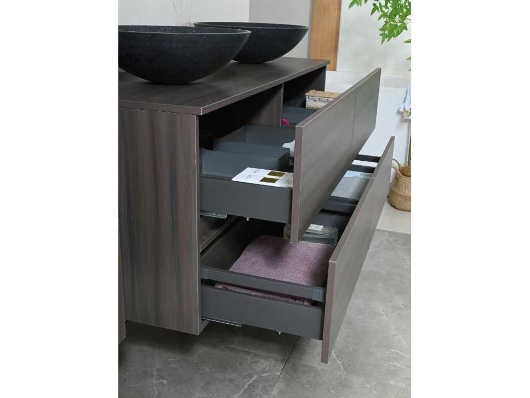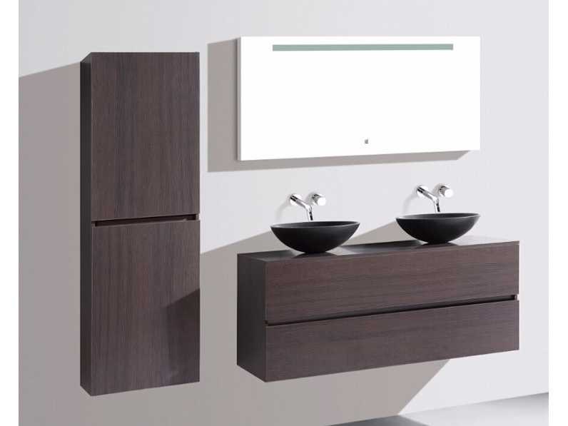 Type: 9010. Afmeting: 3-delige set: 1 * Wastafelmeubel - 1300x470x550mm, 1 * Zijkast - 1500x350x350mm, 1 * Spiegel- 1300x600mm. Voorzien van: Muurkranen inclusief pop-up afvoer – 4 stevige metalen lades - Softclose lade systeem – Stenen waskommen - LED spiegel - Voorgemonteerde zijkast en wastafelmeubel. Bezorgtermijn 14 dagen Merk: Vonato Model: Modena 130 Product type: 2-persoons 130 cm Hoogte: 55cm Lengte: 47cm Materiaal: Melamine, stenen waskommen Kleur: Donker hout decor Kraan: Inclusief 2 muurkranen Wastafel: 0 Waskom: 2 Spiegelkast: Nee Spiegel: Ja Spiegel met verlichting: Ja Verlichting: Ja Onderkast: Ja Lades: 4 Bevestigingsmateriaal: Ja