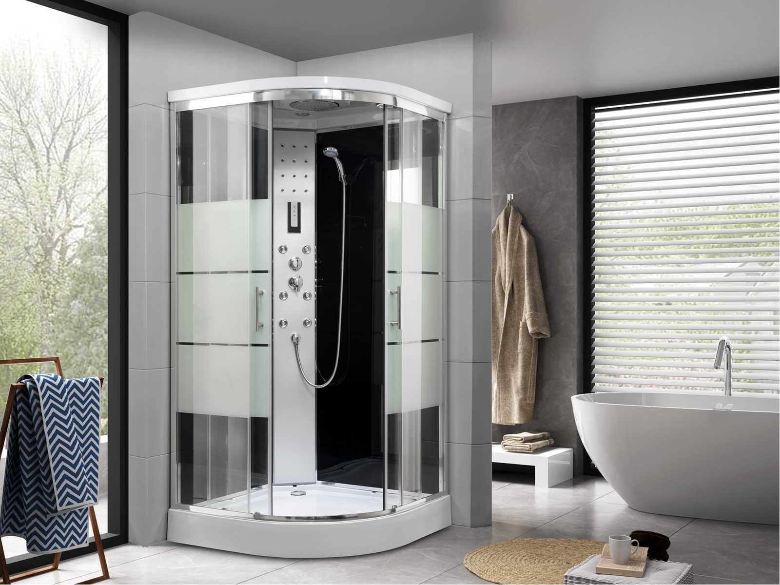 Type: 704A-01. Waterjets: 6 Waterjets zorgen voor een aangename rugmassage. Voorzien van: Regendouche - Handdouche - Bedieningspaneel - LED-verlichting (12 stuks) - Schuifdeuren met rolmechanisme en afsluitstrips - Gehard veiligheidsglas. Bezorgtermijn 14 dagen Merk: Vonato Model: Massage Retreat Product type: met schuifdeur Halfrond met massagejets Kleur: Zilverkleurig frame Lengte: 90cm Hoogte: 215cm Materiaal: Gehard veiligheidsglas