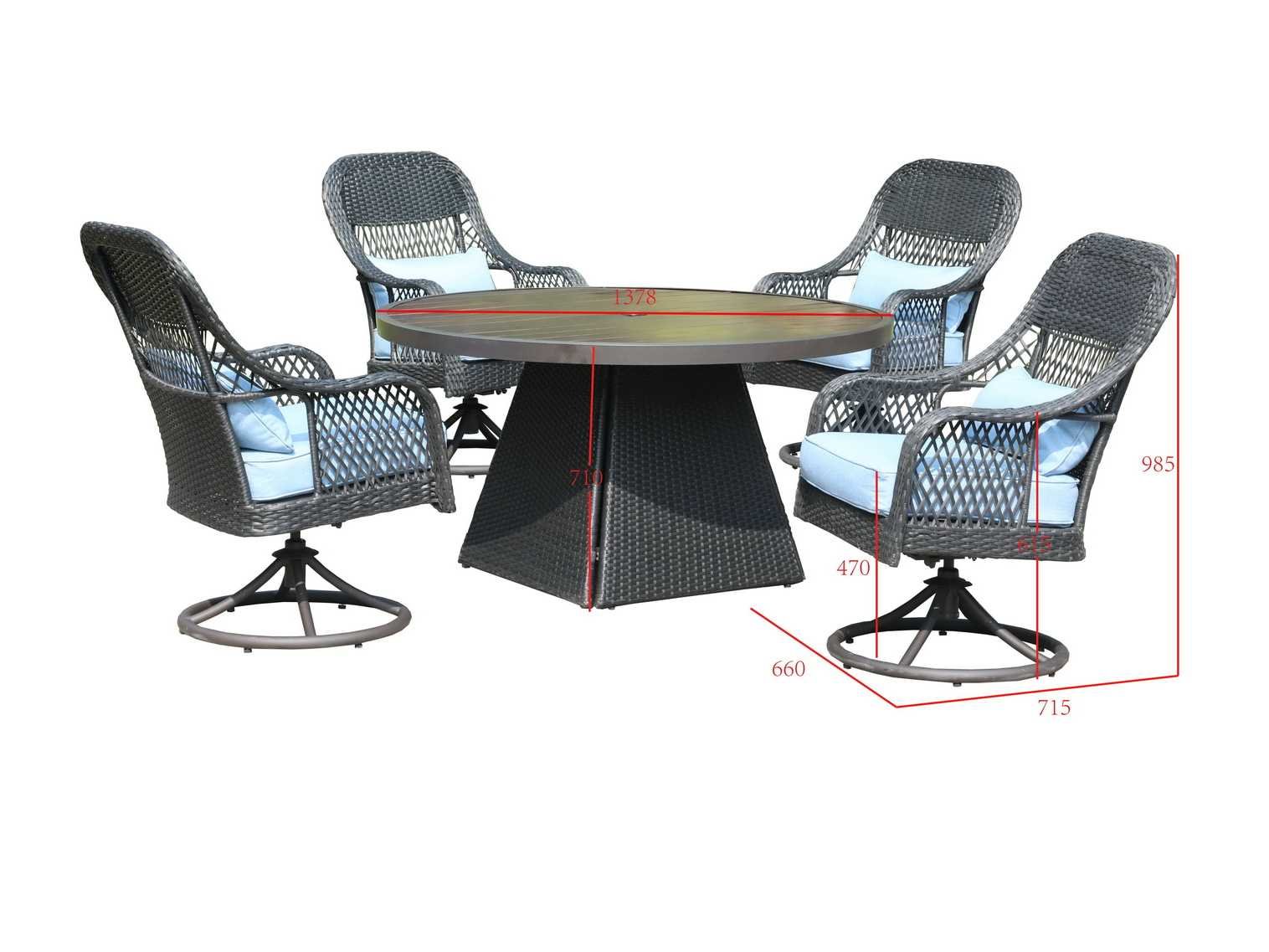 Type: REDONDA-BLUE. Afmetingen: 5-delige set: 4 * Losse draaistoelen: 66x71x98 cm , 1 * Ronde eettafel: Ø138 cm, hoogte: 71 cm. Zithoogte: 47 cm. Voorzien van: Waterafstotende kussens - Weerbestendig vlechtwerk - Gat voor parasol - Draaibare stoelen Bezorgtermijn 14 dagen Merk: VONATO Model: Solaro Blue Product type: 5-delig Kussens: Blauw Stapelbaar: Nee Verstelbaar: 0 Vorm: rond Stoelen: 4 Kleur: Antraciet Lengte: 0cm Hoogte: 71cm Materiaal: Gepoedercoat aluminium frame Diepte: 0 Zithoogte: 47