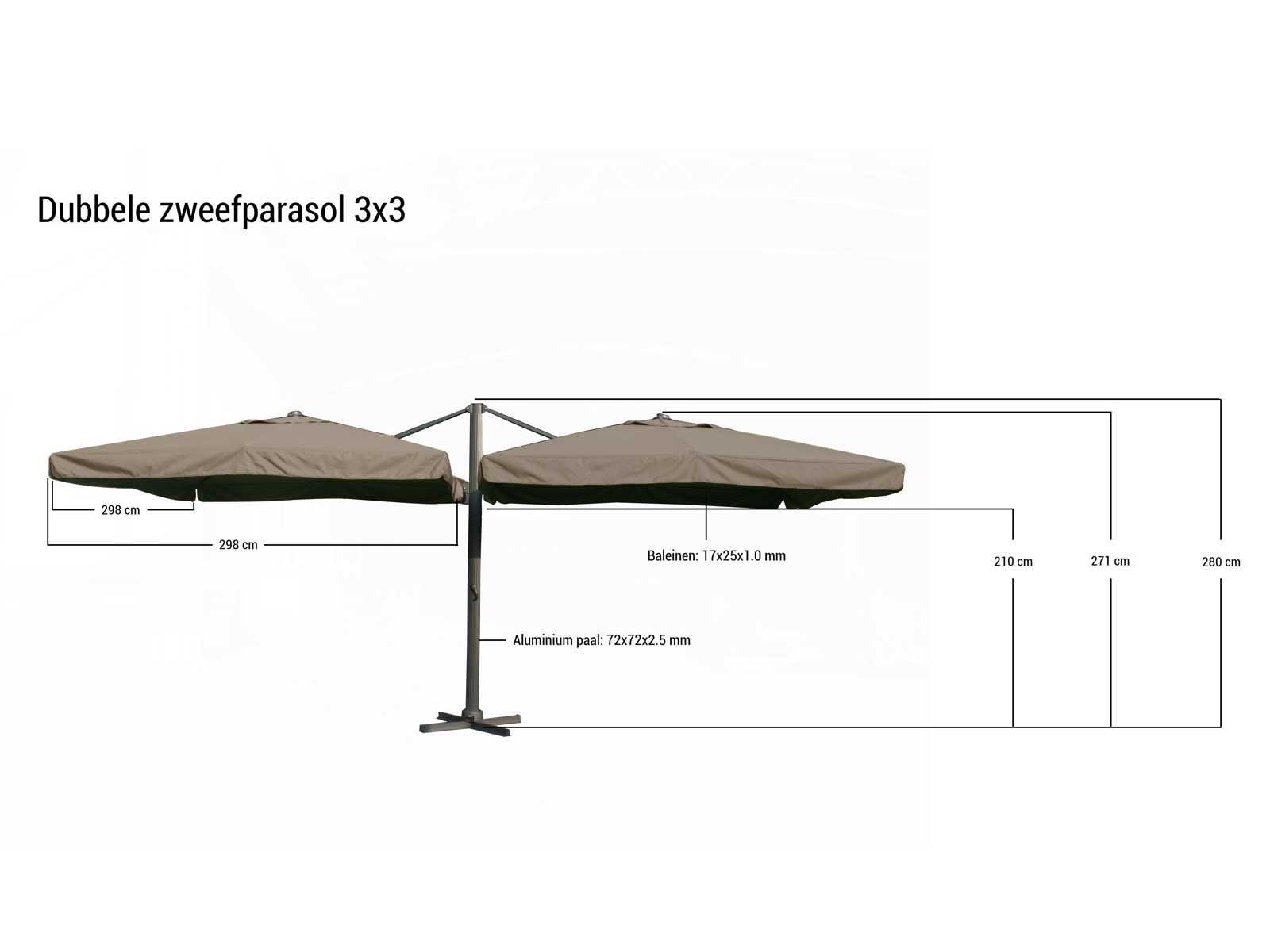 Type: U1073 DOUBLE 3X3 SANDY De parasol is ideaal voor gebruik in de tuin, terras en balkon. De grote parasol wordt geleverd met een parasolvoet. Deze moet wel worden verzwaard met behulp van bijvoorbeeld terrastegels. Houd hiervoor minimaal een gewicht van 100 kilo aan. Voorzien van: Groot parasoldoek met een afmeting van ø300 cm. - Sterk en stevig frame gemaakt van aluminium. - Eenvoudig startklaar te zetten voor gebruik. - Brandvertragend, dik doek voor een betere UV-bescherming. - De parasol houdt de warmte van de zon vast waardoor het ook ’s avonds nog lekker warm is wanneer de zon ondergaat. - De parasol kan 360 graden om zijn as draaien, zo kan de parasol makkelijk meedraaien met de zon en maak je optimaal gebruik van de parasol. Bezorgtermijn 14 dagen Merk: Paralux Model: Celiano Product type: 0 Vorm: Vierkant Parasolvoet: Incl. parasolvoet; zelf te verzwaren Verstelbaar: 360 graden Kleur: Zand Lengte: 300cm Hoogte: 280cm Materiaal: Aluminium frame, 200 grams brandvertragend doek