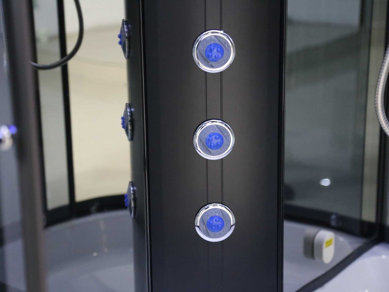 Type: SC2506. Model: Stoomcabine halfrond, schuifdeuren. Jets: 6 waterjets voor een aangename rugmassage. Voorzien van: Schuifdeuren, regendouche in het plafond, digitaal bedieningspaneel, in de hoek geplaatst douchepaneel, sfeerverlichting in de douchekolom, verlichting rond de regendouche, FM radio met speaker, mogelijkheid voor het aansluiten van een telefoon, CD-aansluiting, ozone-desinfectie, stelpoten, antislip bodem, ventilator, handdouche, stoeltje. Totaal gewicht 91,5 kg in vier kartons. Bezorgtermijn 14 dagen Merk: Vonato Model: Nevada Hydroplus Product type: met massagejets Kleur: Wit bad met zwart frame Lengte: 100cm Hoogte: 215cm Materiaal: Veiligheidsglas