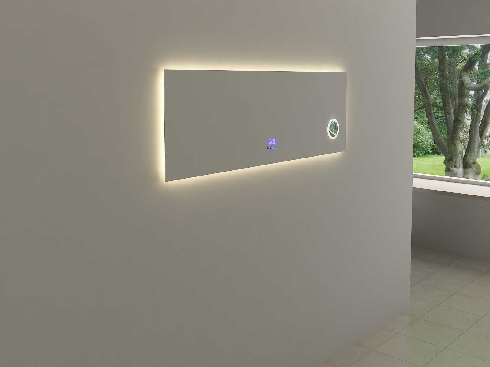Type: RALM-150 Voorzien van: Touch bediening via digitaal display – LED verlichting in 3 kleuren, dimbaar – Bluetooth & speakers – Digitale klok – Digitale temperatuurmeter – 220 volt aansluiting – Anti-fog technologie door verwarming in de spiegel – Vergrootglas (vergroot 3x) in de spiegel Ø10 cm - Kopervrije spiegel - 1,5mm explosieveilige laag aan de achterkant. Bezorgtermijn 14 dagen Merk: Vonato Model: Serenza Product type: met LED verlichting Kleur: LED verlichting in 3 kleuren; geel, blauw en wit Lengte: 0cm Hoogte: 50cm Materiaal: 0