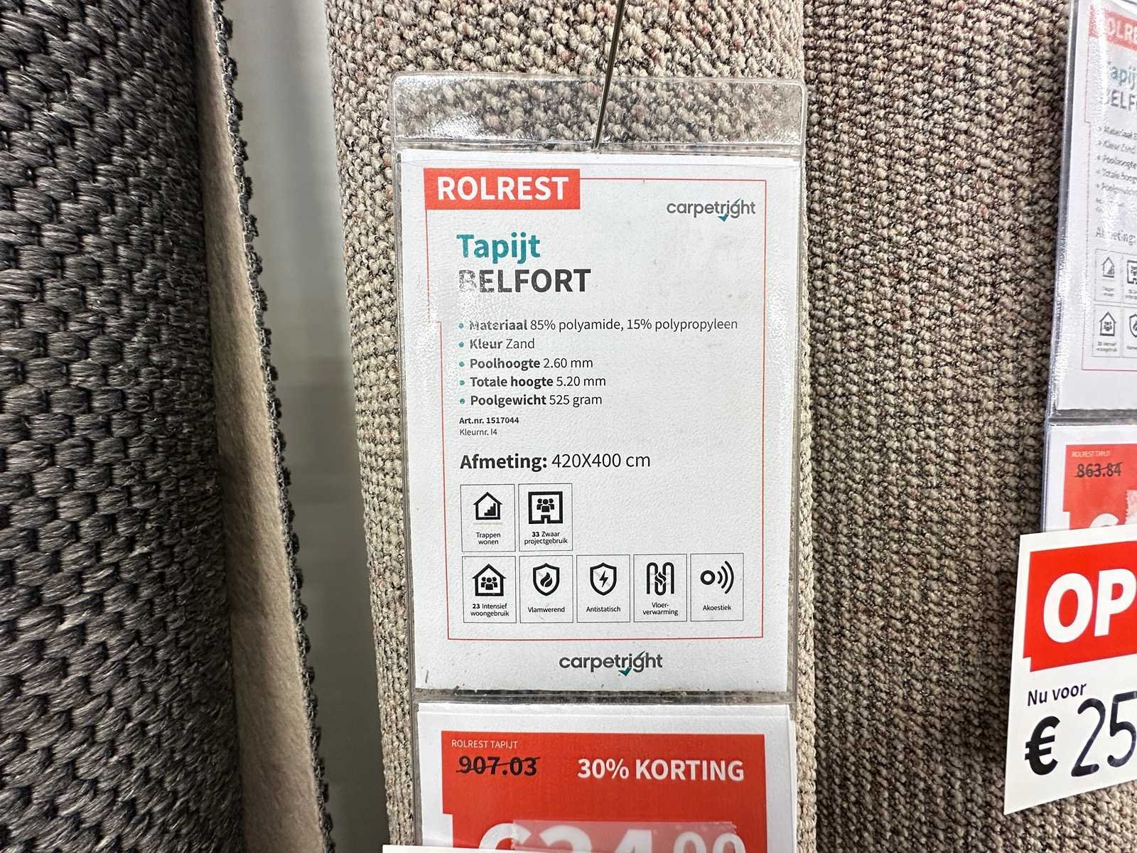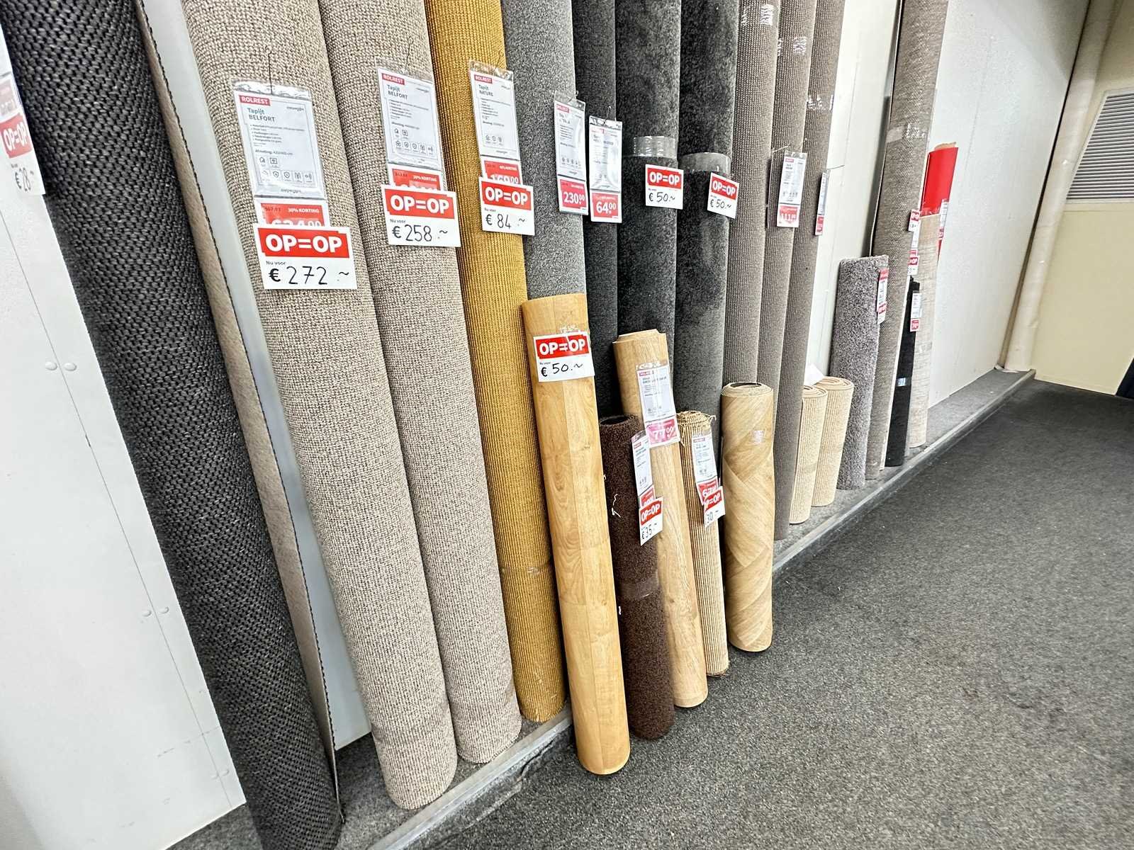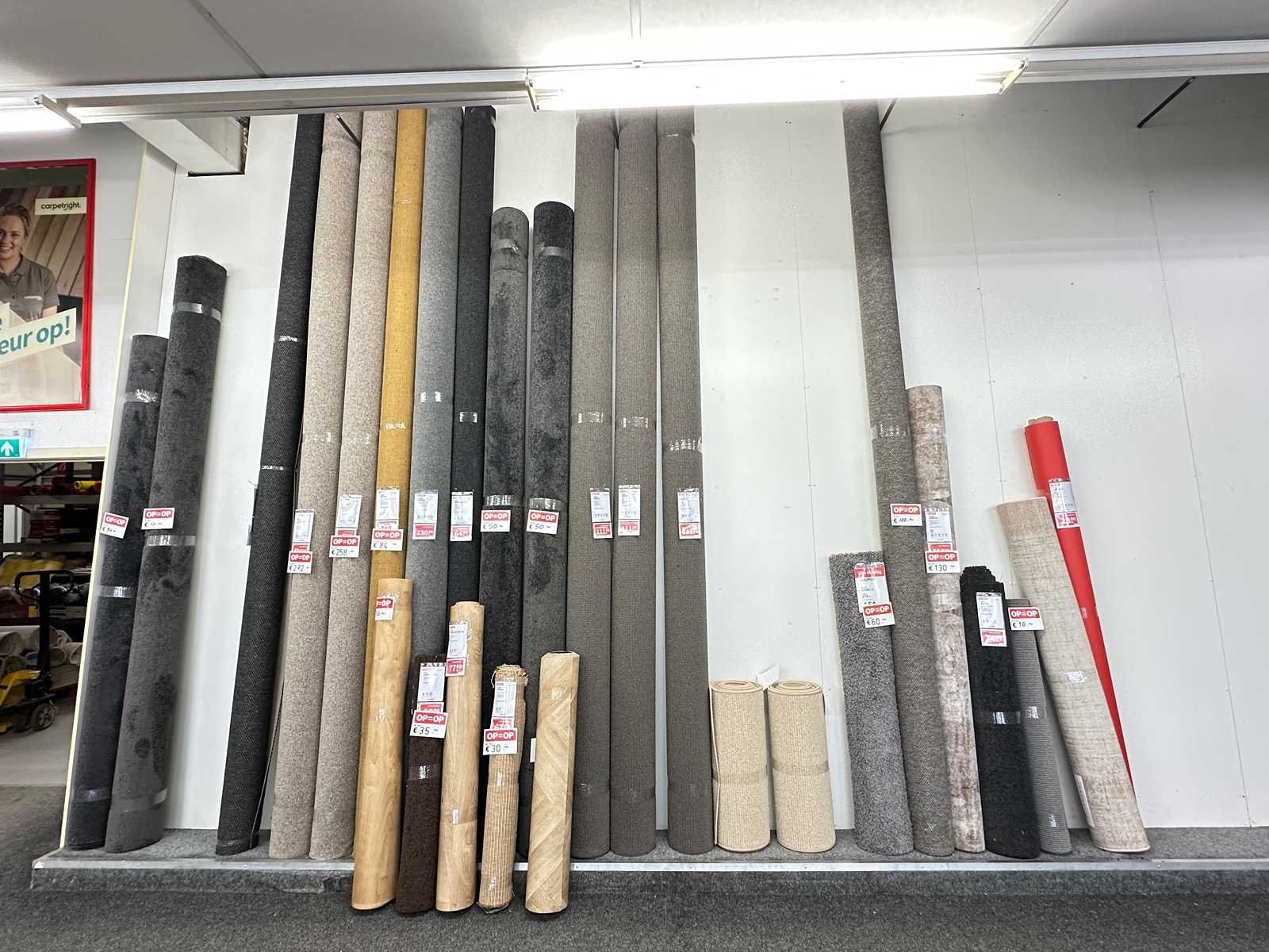 Deze partij bestaat uit 27 rollen verschillende tapijten met diverse afmetingen en kleuren.