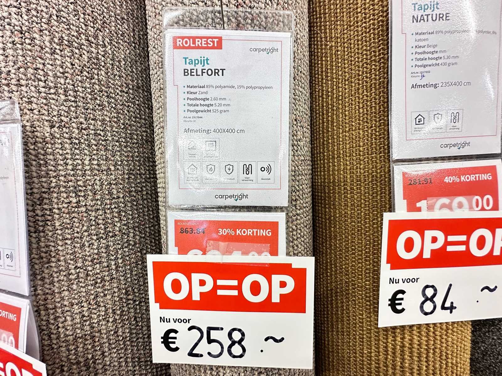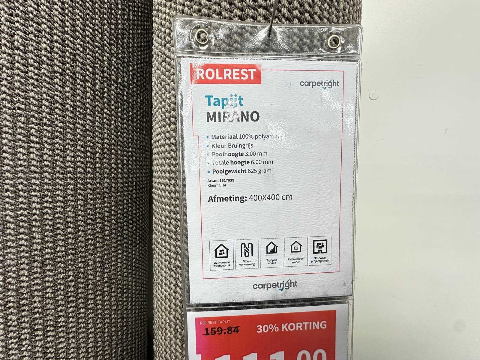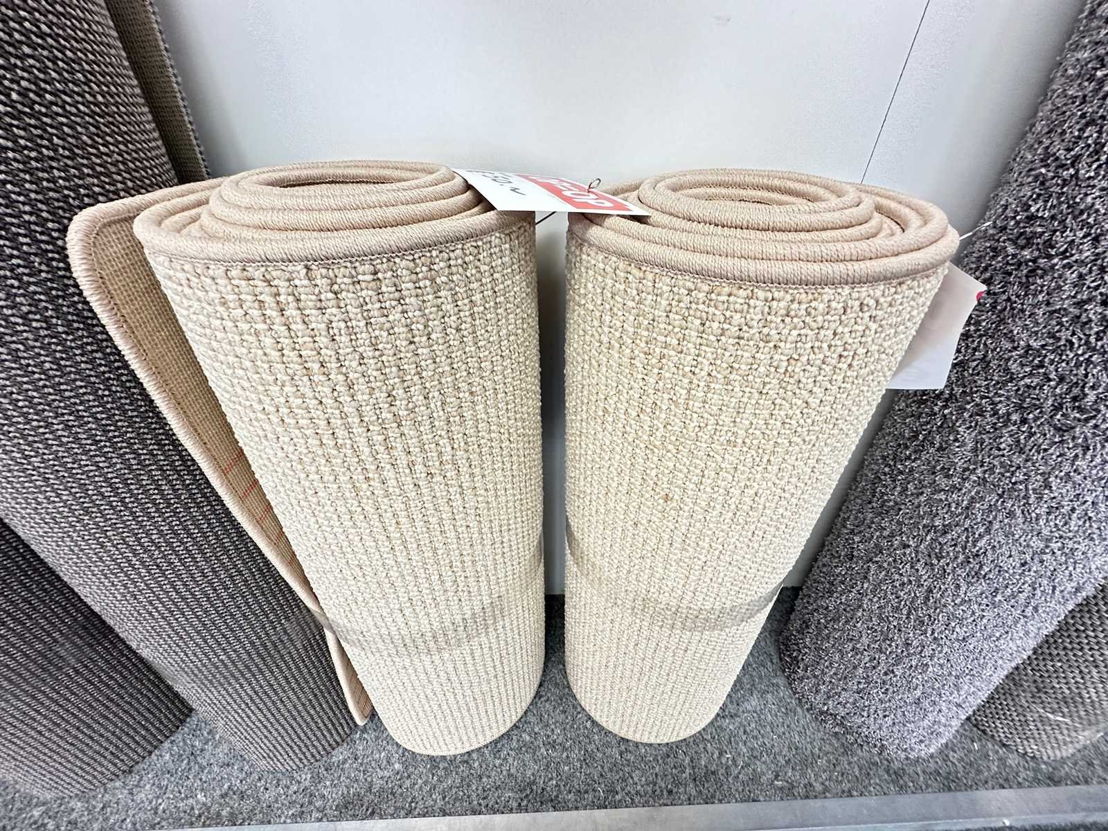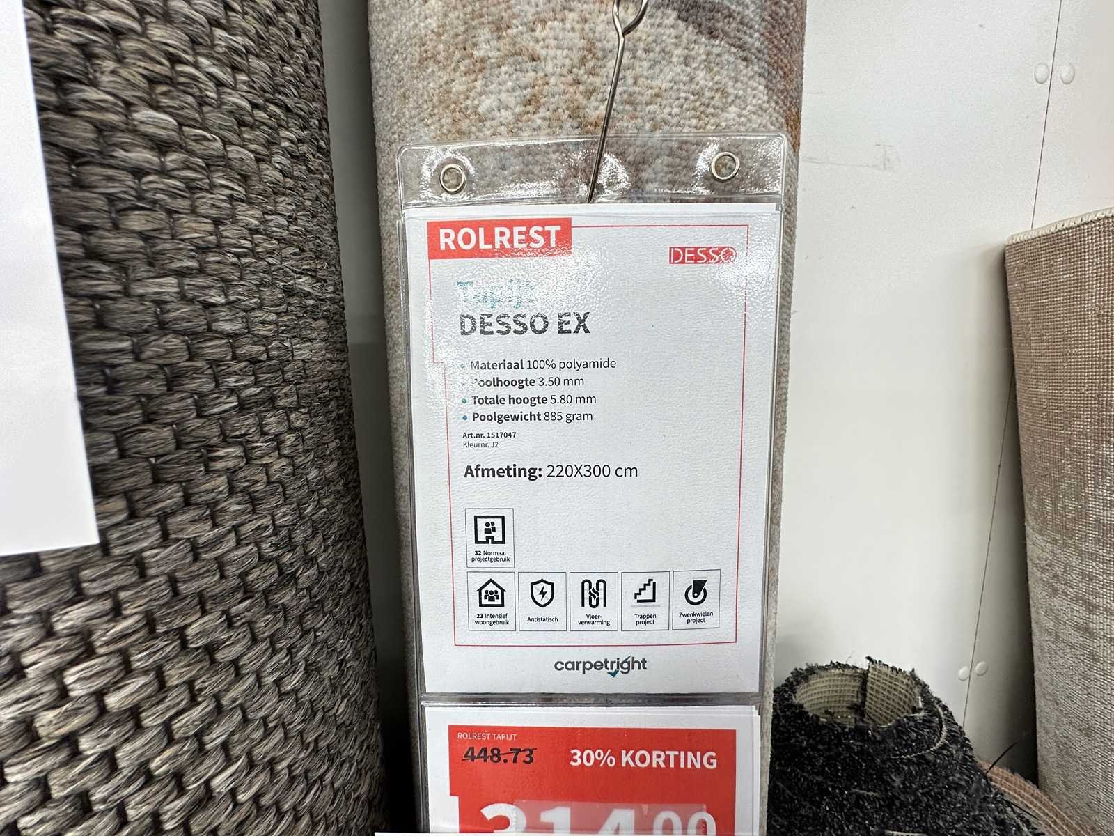 Deze partij bestaat uit 27 rollen verschillende tapijten met diverse afmetingen en kleuren.