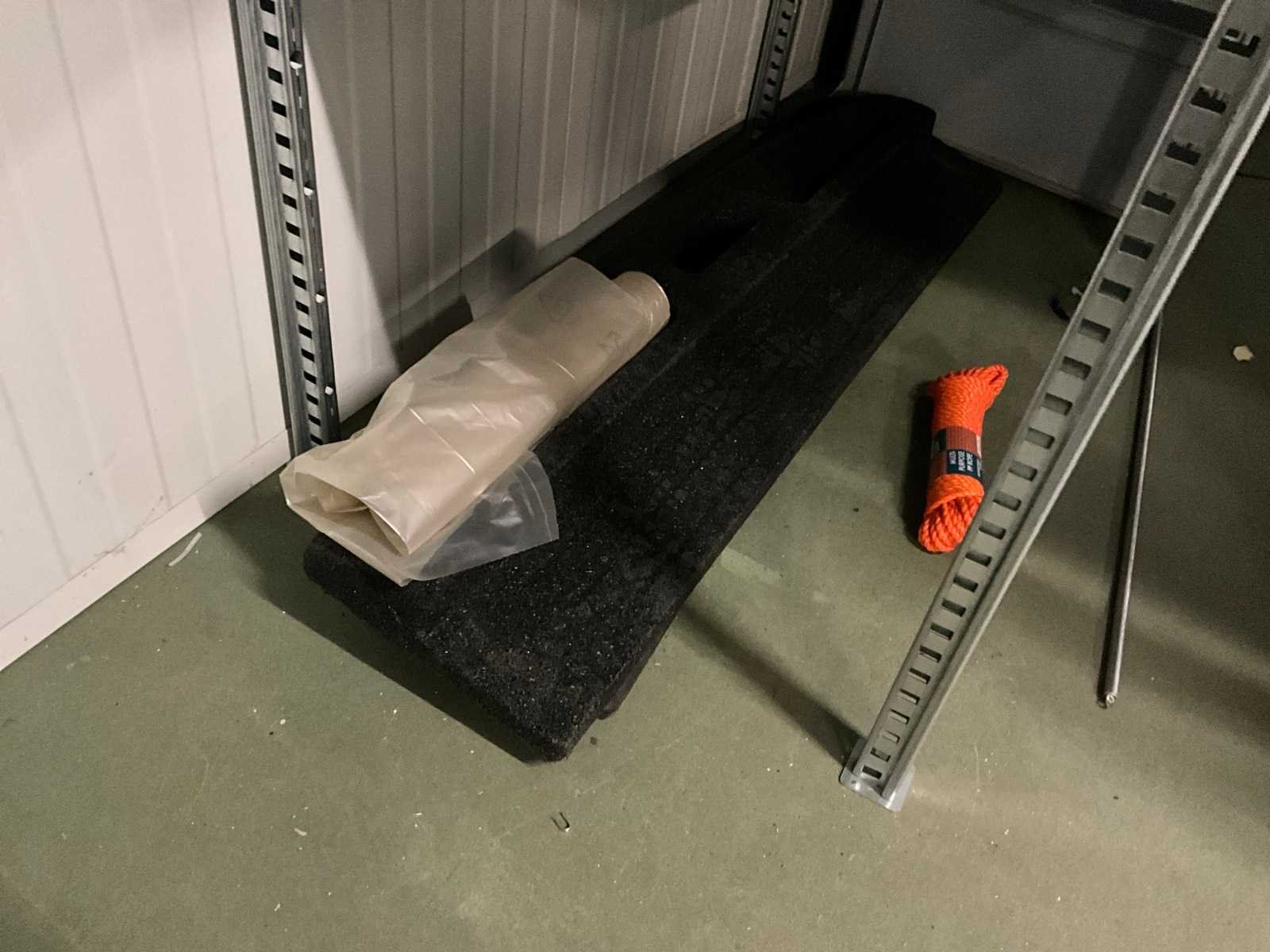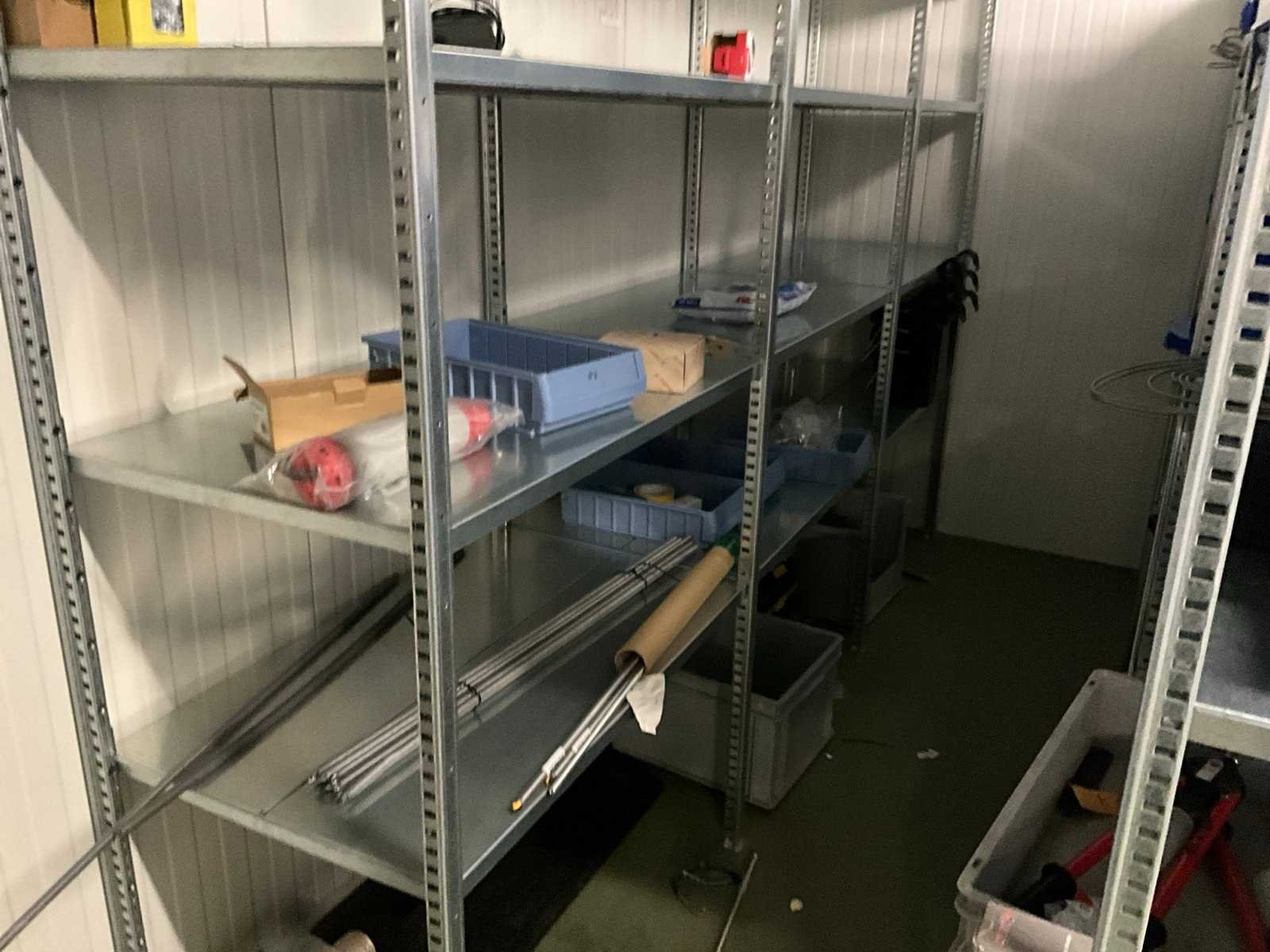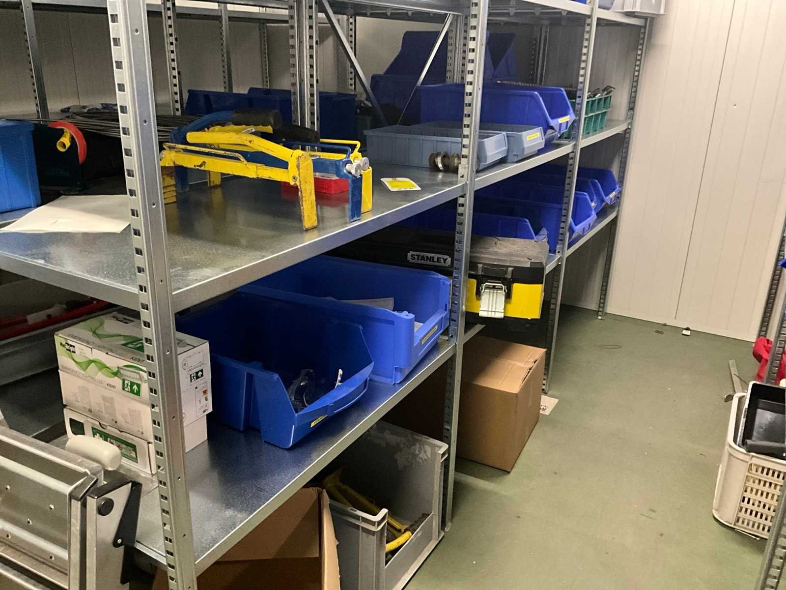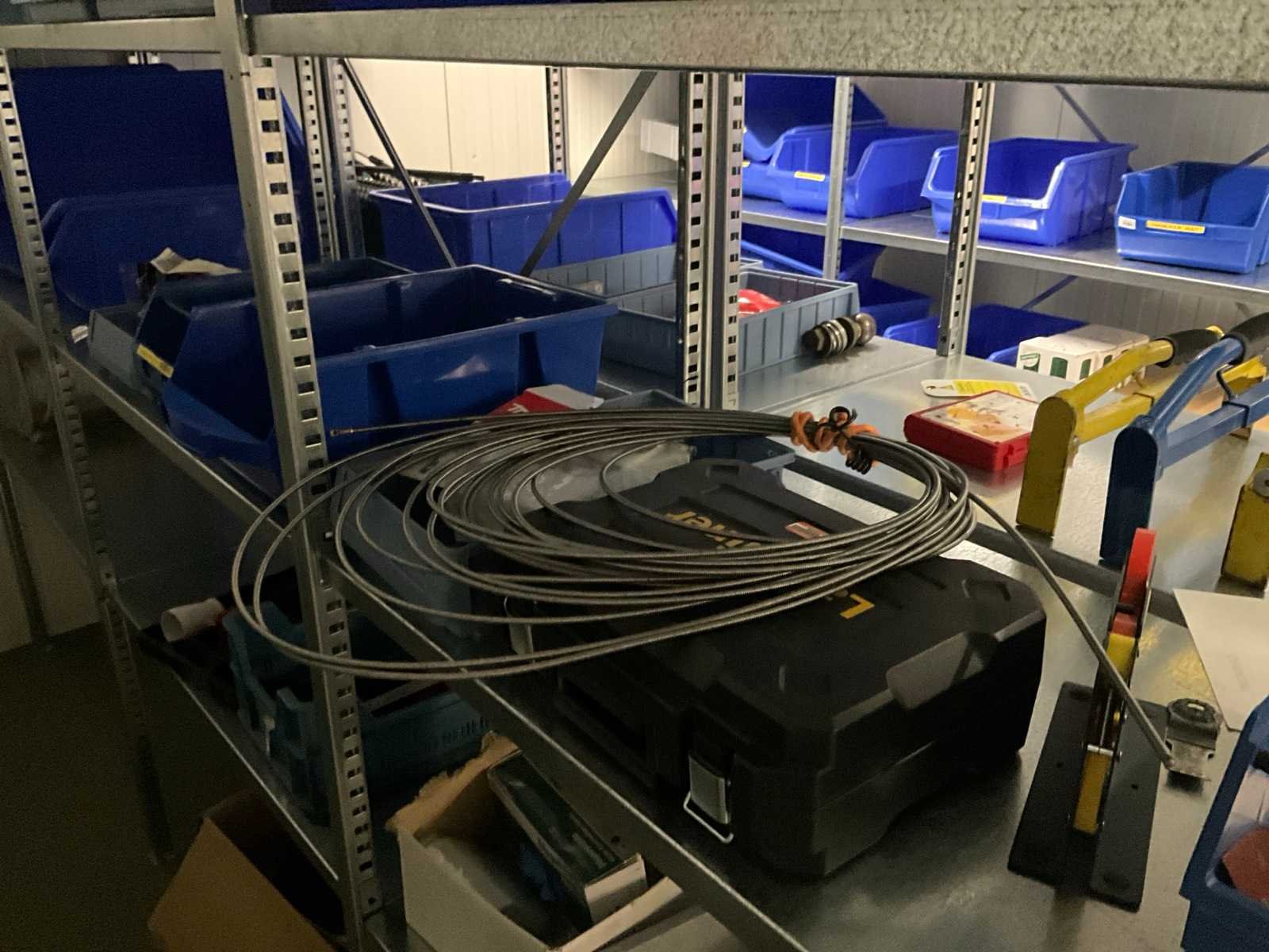 Bestaande uit circa 40 magazijn bakken groot (32x50x20cm) diverse gereedschappen waaronder 3x blindnagel tang, 2x ladder mat, 10x buisveer, 1x trekveer, boren, overige spullen in ruimte,