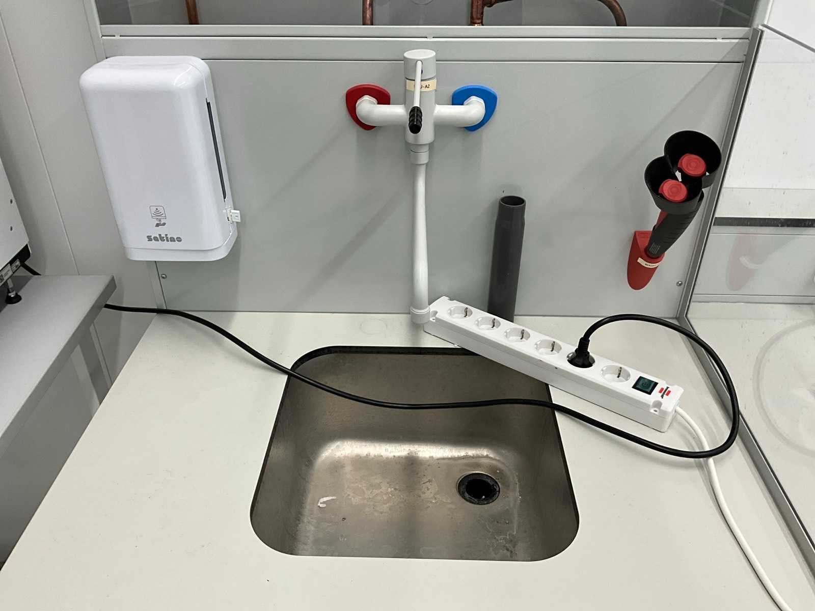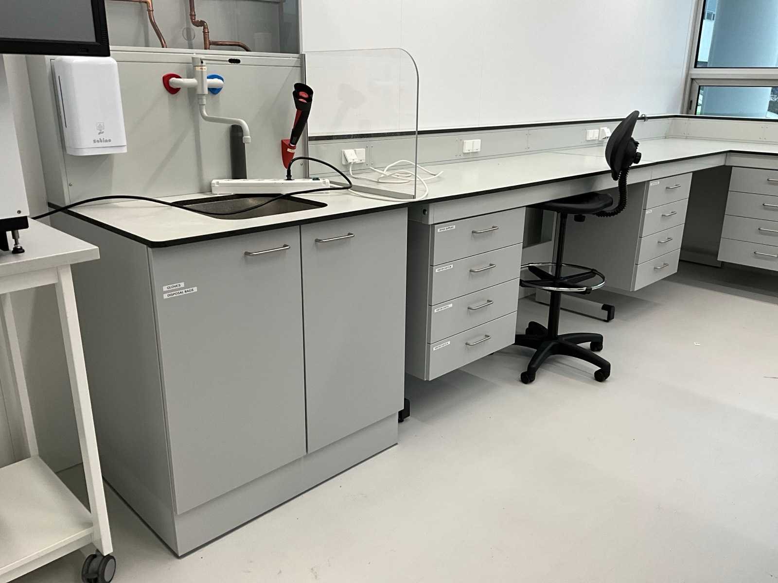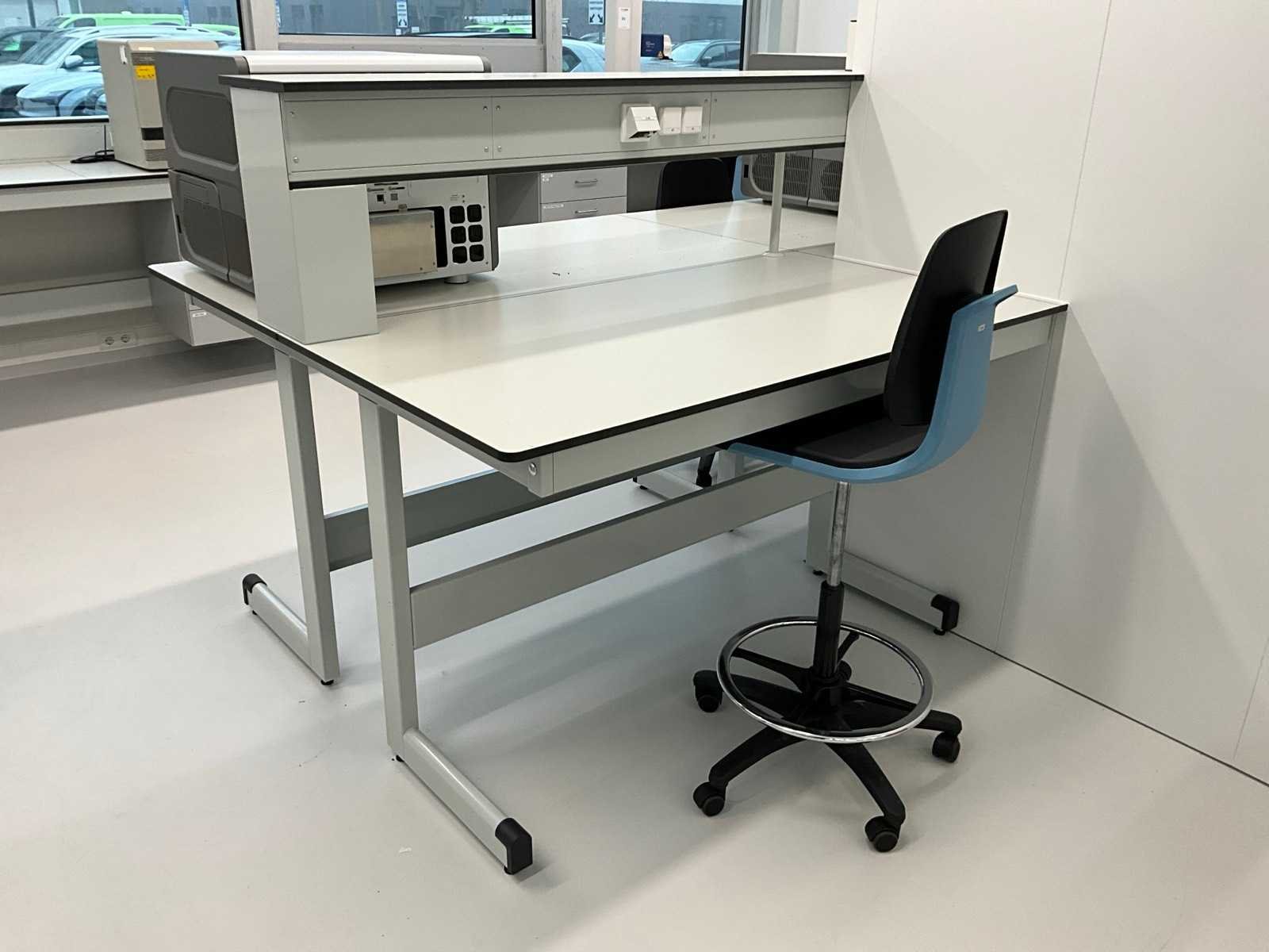 Bestaande uit hoekopstelling 695x450x75x110 cm (werkhoogte 94 cm) voorzien van stopcontacten en wastafel met mengkraan; werktafel 300x160x140 cm en diverse krukken
