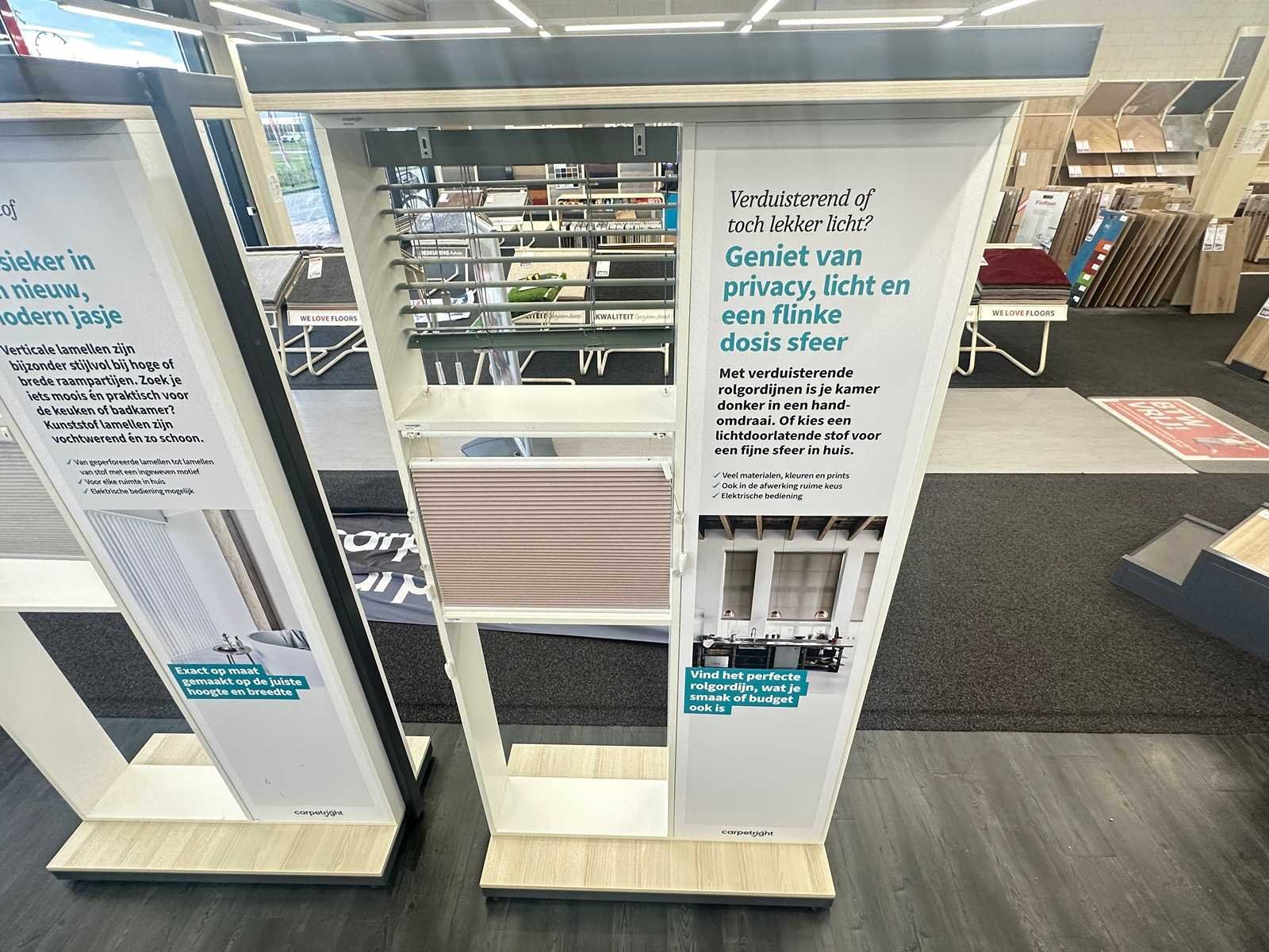 Een van de displays staat in het magazijn Lengte: 100cm Breedte: 45cm Hoogte: 200cm Materiaal: Staal en hout