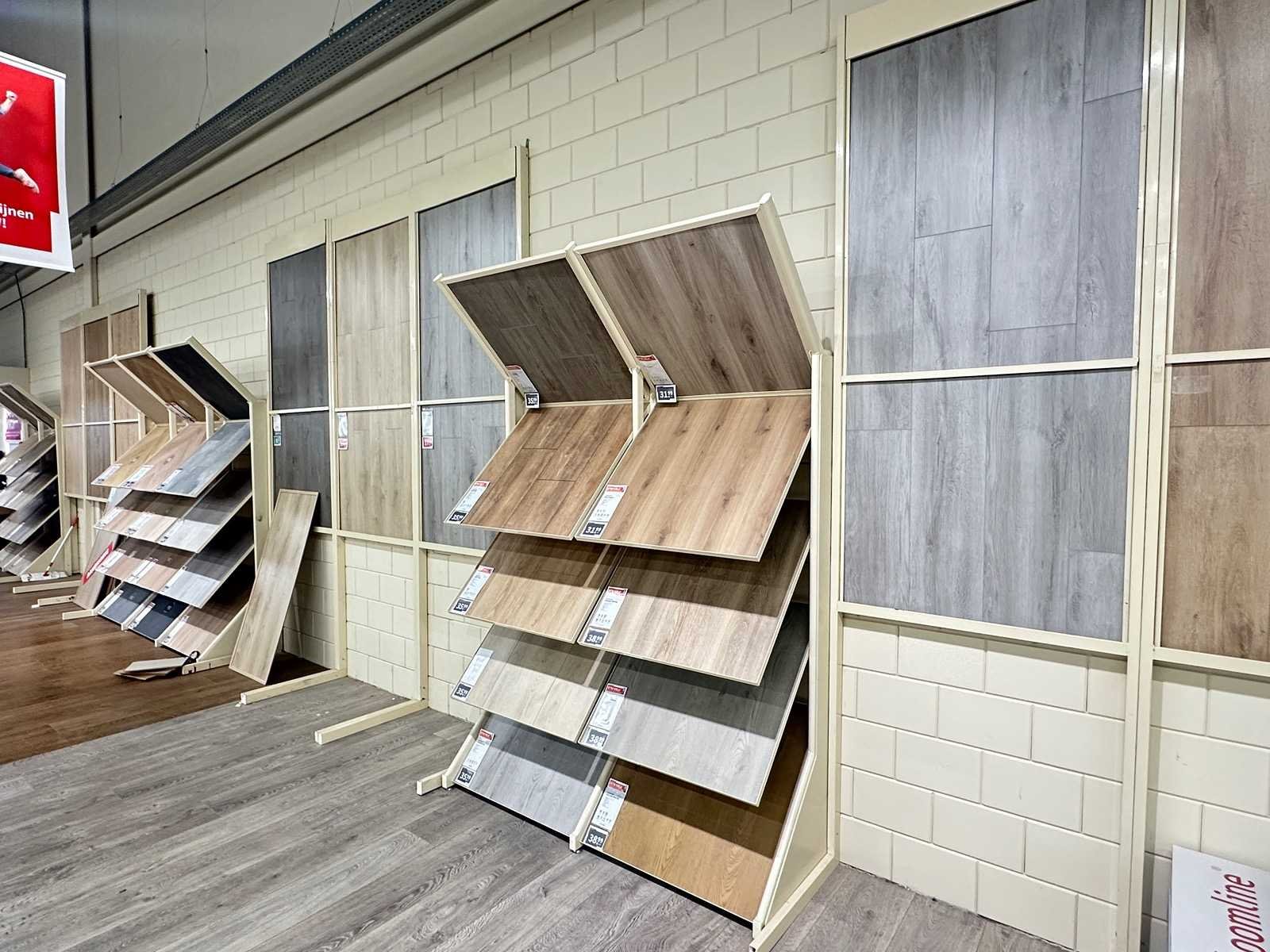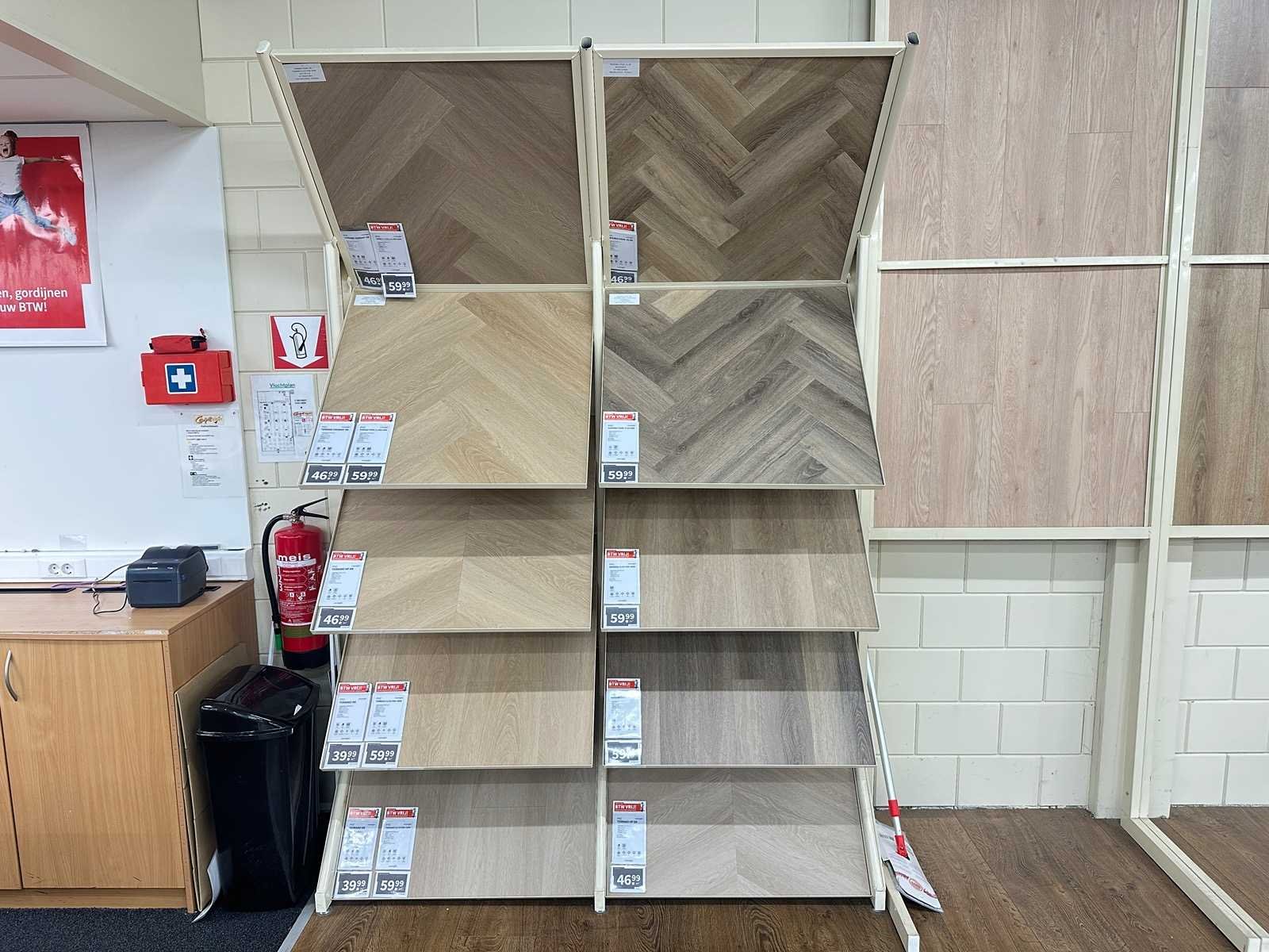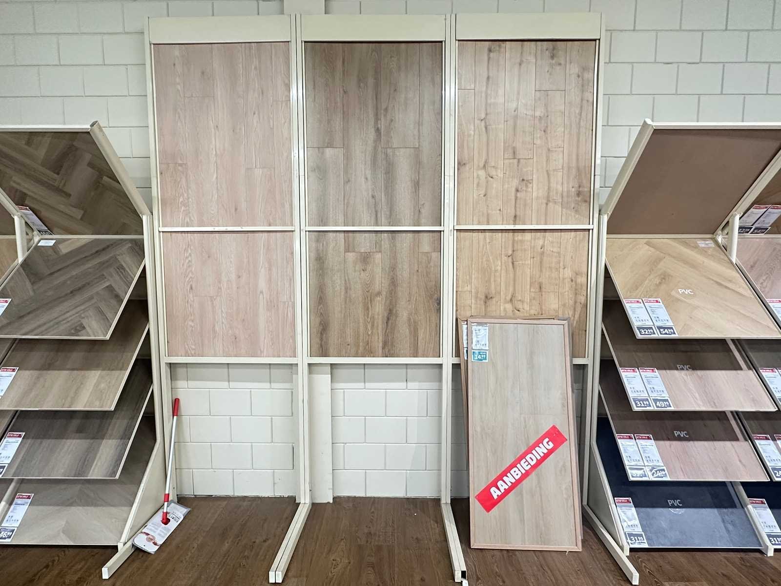 Diverse rekken met een totale lengte circa 16 meter. Inclusief samples. Materiaal: Staal en hout