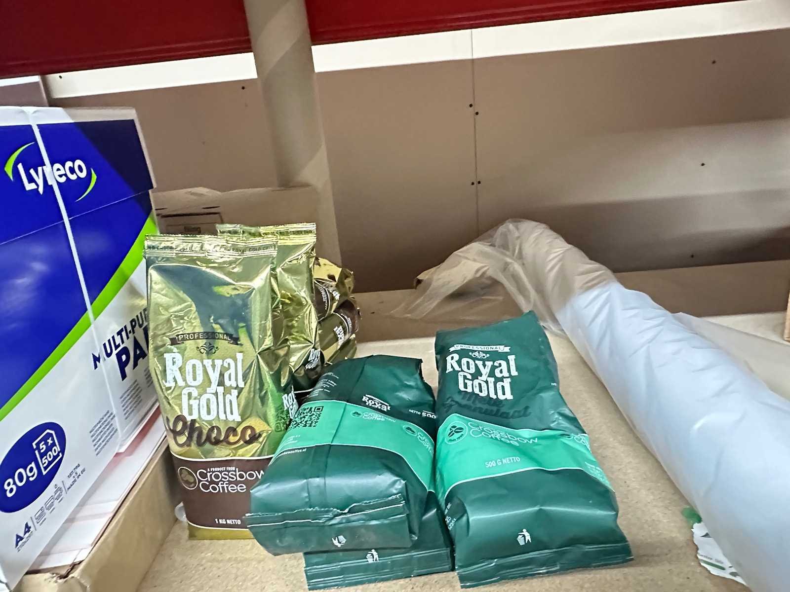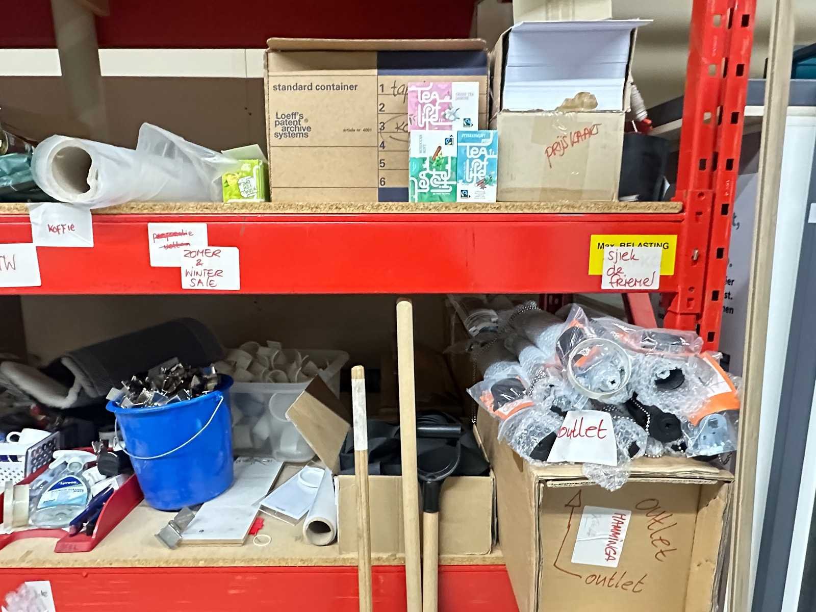 Afmeting staanders is 9-x350 cm (BxH), liggers 290 cm lang en legborden 280x90 cm (LxB) Inclusief inhoud. De inhoud bestaat uit schoonmaakartikelen, koffie, printpapier en kantoorgerief. Aantal staanders: 3 Aantal liggers: 8 Aantal legborden: 4 Demontabel: true