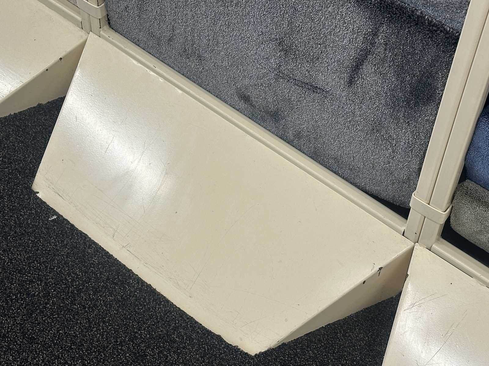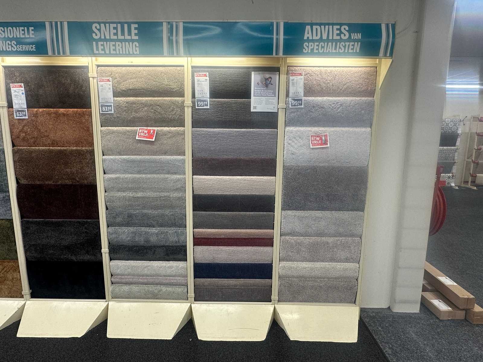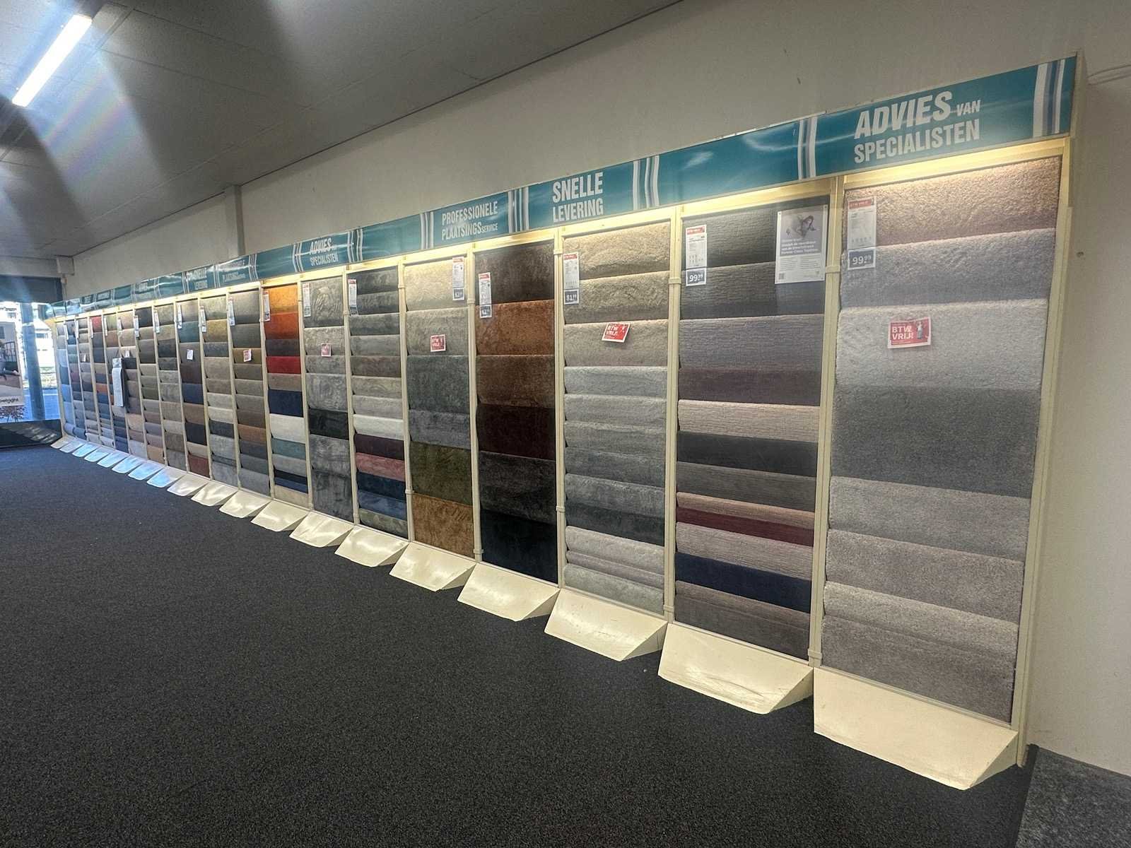 Deze opstelling van 15 meter lang bestaat uit 19 delen van een 75 cm en is voorzien van verlichting. Inclusief samples. Lengte: 1500cm Breedte: 46cm Hoogte: 240cm Materiaal: Metaal en hout.