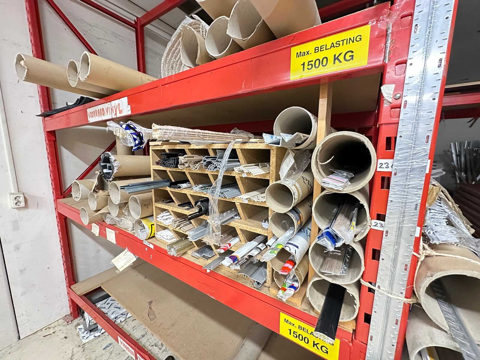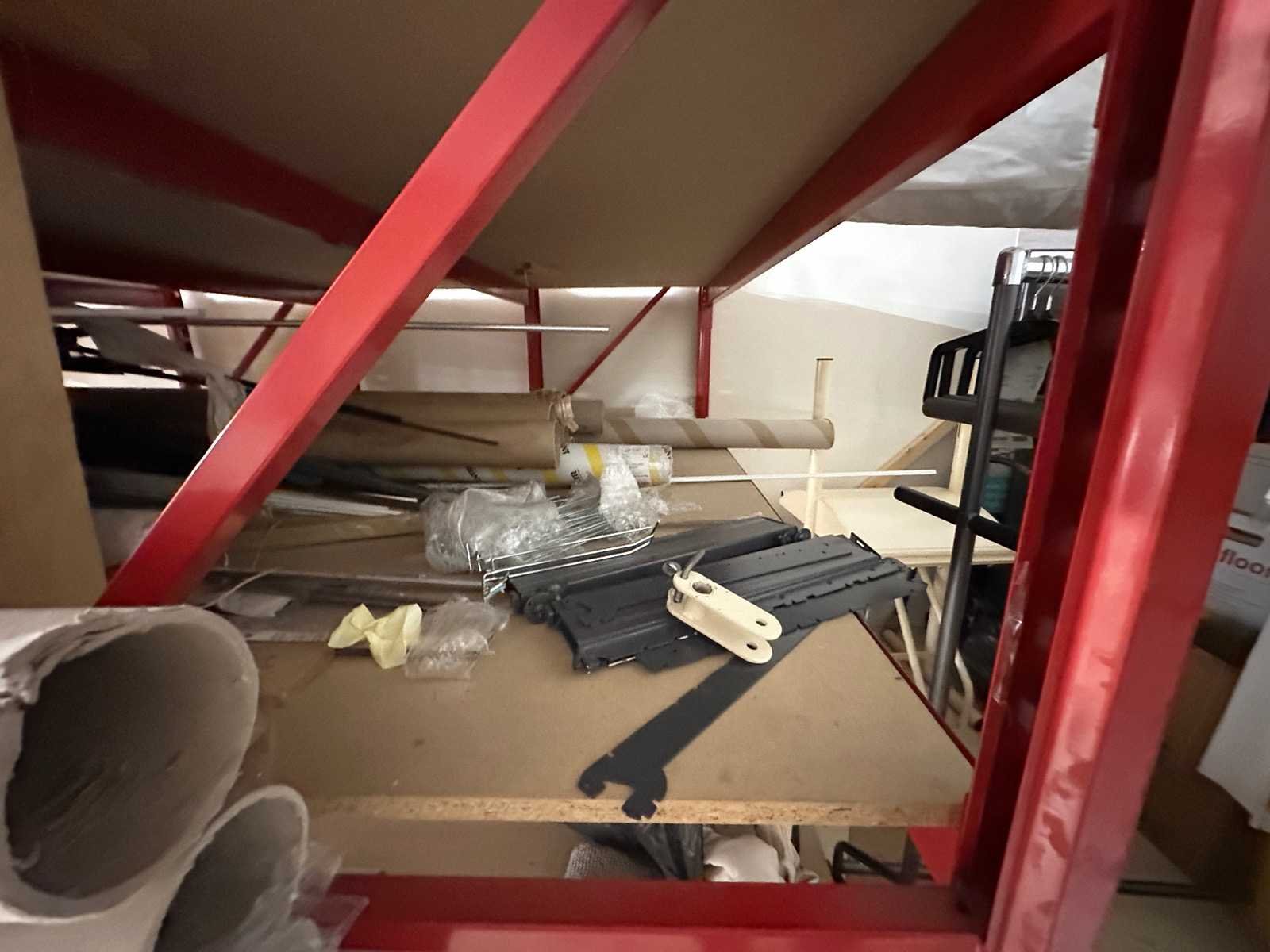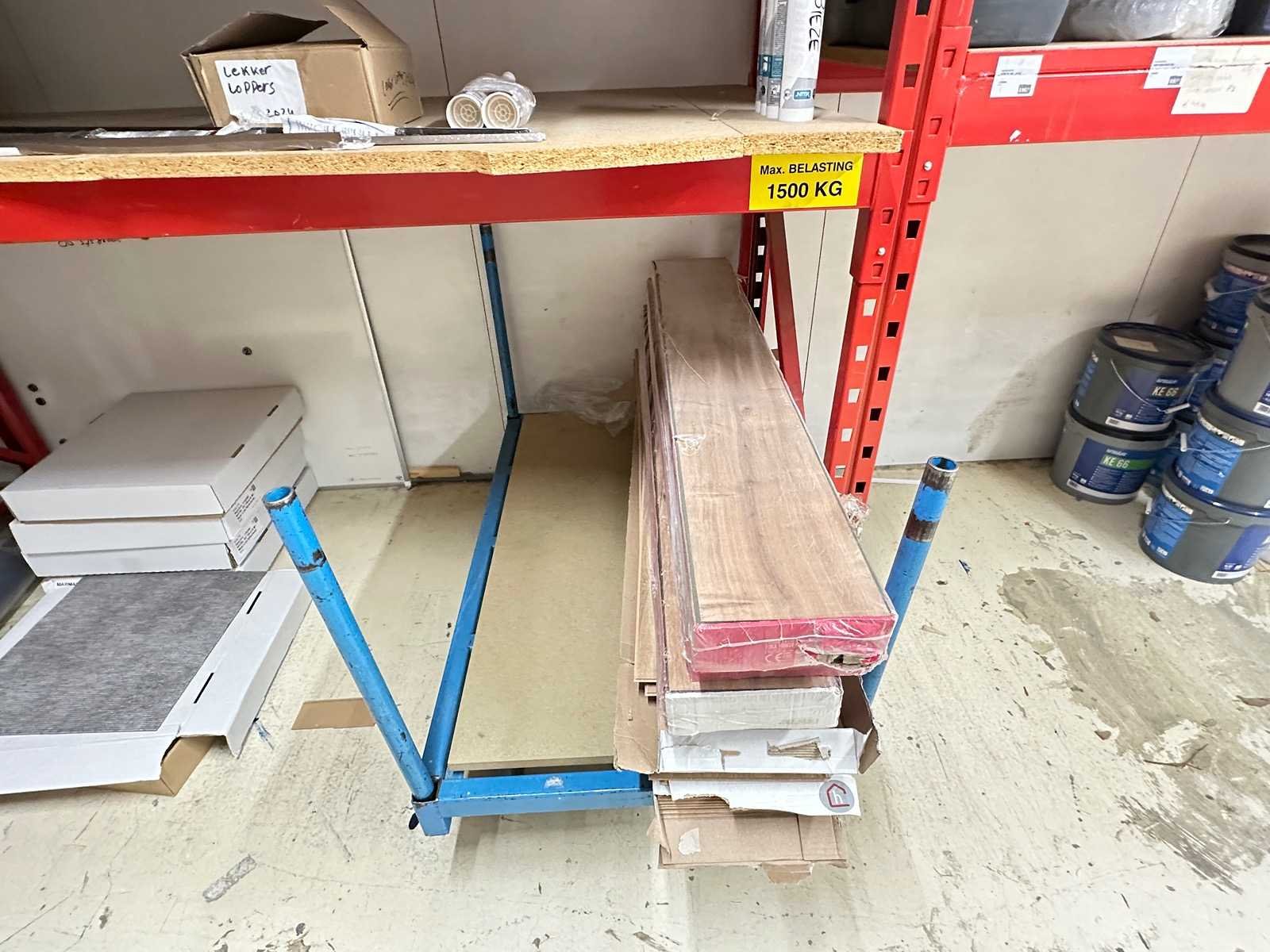 Exclusief magazijnstellingen. De inhoud bestaat onderandere uit een lockerkast, montagemateriaal, plinten, olifantenpoot, kledingrek, magazijnkar en vloerdelen.