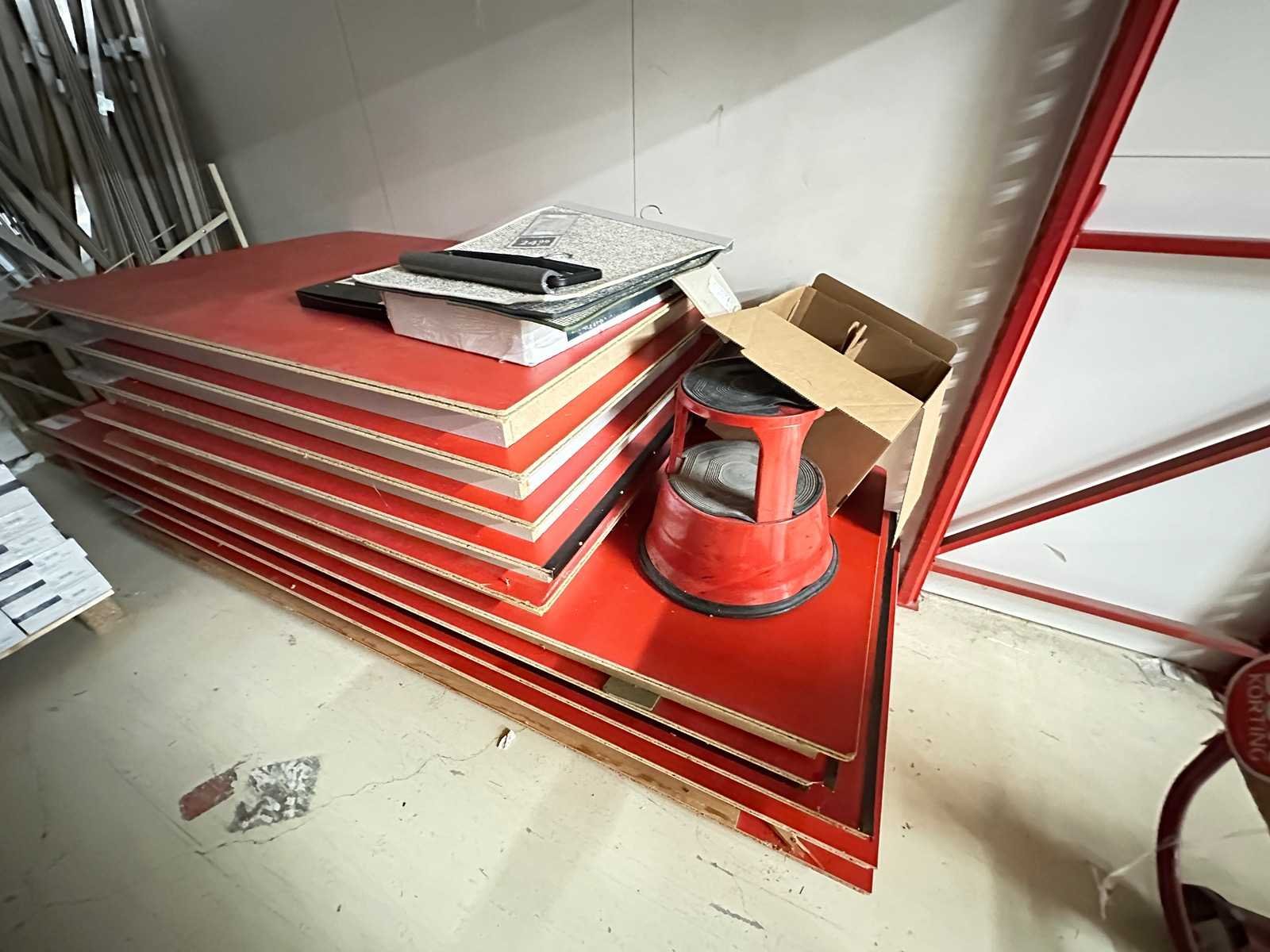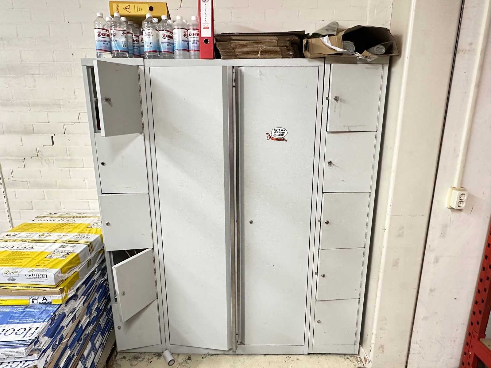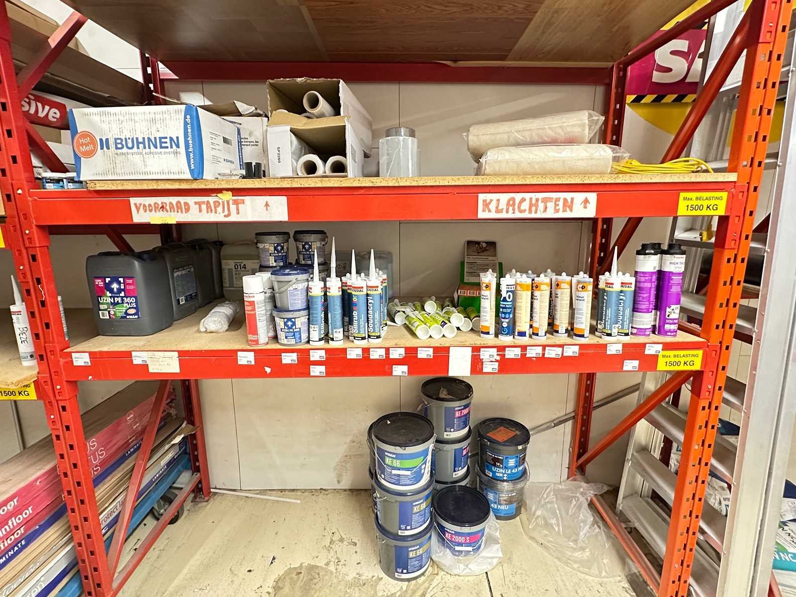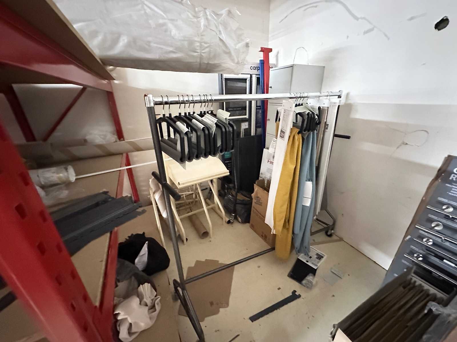 Exclusief magazijnstellingen. De inhoud bestaat onderandere uit een lockerkast, montagemateriaal, plinten, olifantenpoot, kledingrek, magazijnkar en vloerdelen.