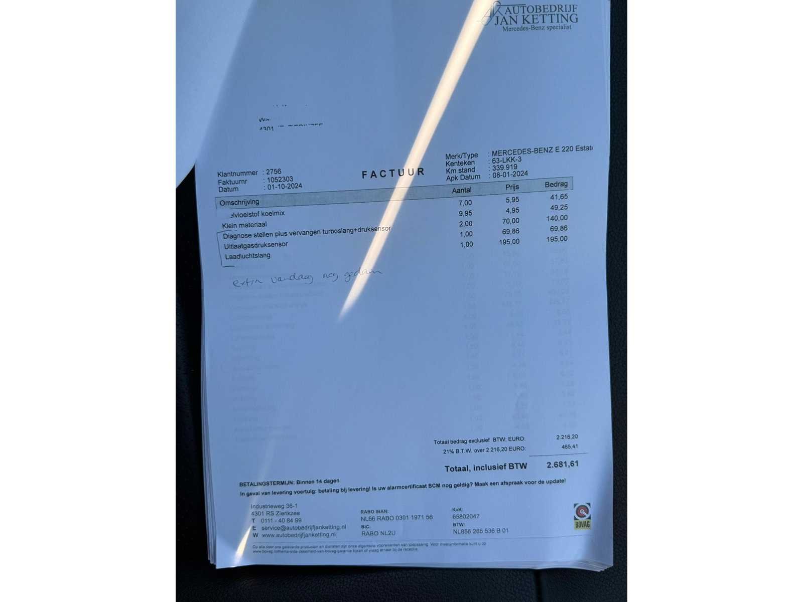 Kenteken: 63-LKK-3 Merk: Mercedes-Benz Model: E-klasse Estate Type: 220 CDI Avantgarde ORG NEDERLANDS NAP 63-LKK-3 Afgelezen kilometerstand: 370439km Cilinderinhoud: 2143cc Vermogen (kW): 125kW Brandstof: Diesel Chassisnummer: WDD2122021A2426632663 Laadvermogen: 0kg NAP status: Logisch Datum eerste toelating: 2010-05-11 Datum eerste toelating (NL): 2010-05-11 APK vervaldatum: 2026-01-08 Vermogen (pk): 170hp Energielabel: C Aandrijving: RWD Aantal zitplaatsen: 5 Maximaal trekgewicht ongeremd: 750kg Maximaal trekgewicht geremd: 2100kg Kleur: grijs Transmissie: Automaat Stuurwiel: links Emissieklasse: 5 Aantal deuren: 4 Ledig gewicht: 1745kg Bruto BPM (NL): 16474€ Rest BPM: 939€ Aantal cilinders: 4 Carrosserie: stationwagen CO2-uitstoot NEDC: 162 Onderhoudshistorie: Ja gedeeltelijk Carfax Link: https://was.carfax.eu/v0/api/ccdid/5100016408/svc/201/vinreg/63LKK3/checksum/eyJhbGciOiJIUzI1NiIsInR5cCI6IkpXVCJ9.eyJleHAiOjE3NjI2ODMyNDB9.uL2NFL1JrZhreoQHObNg0iPorfwfNfEjk7DJxlTpv9w startinformatie : Start en rijdt