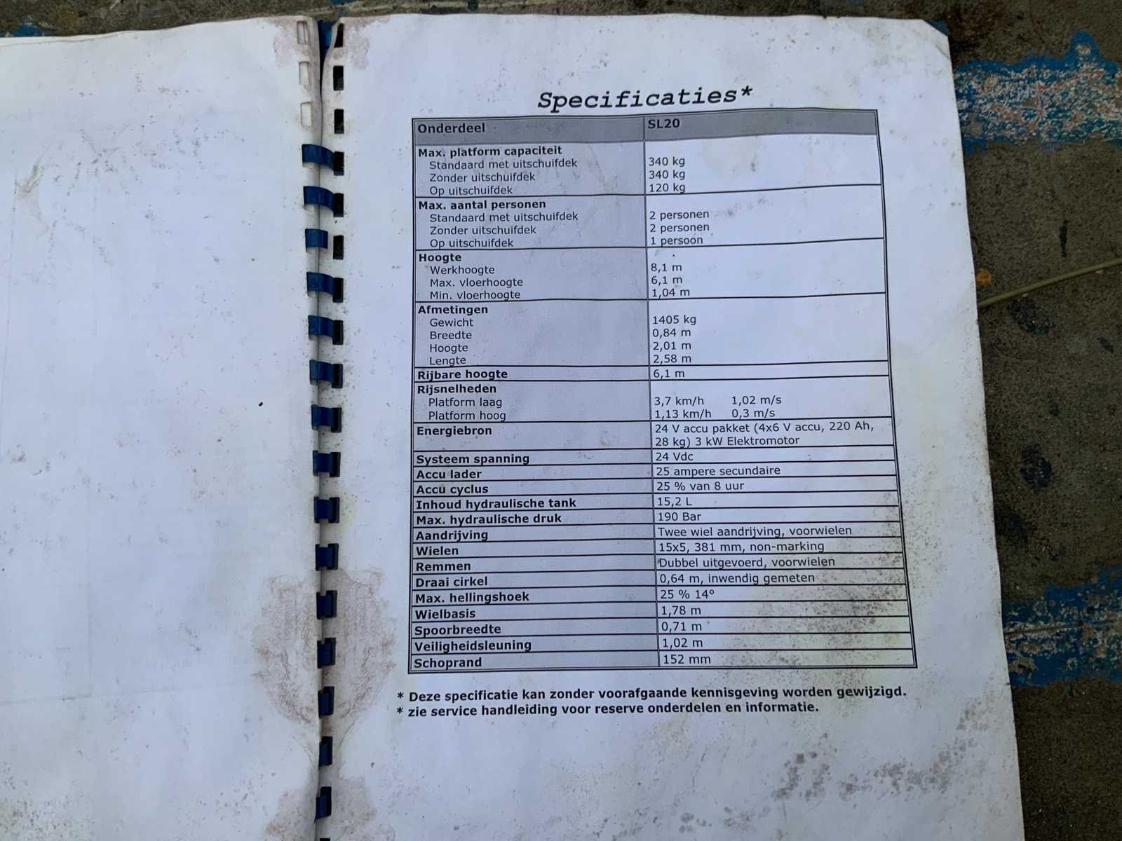 Met gebruikershandleiding, elektrisch issue. Merk: Upright Type: SL20 Bouwjaar: 1999 Serienummer: 8831 Elektrisch: true Werkhoogte: 8100mm Plateau afm. l: 3450mm Plateau afm. b: 850mm Platform capaciteit: 340kg Accu lader: true Eigen gewicht: 1405kg Totale afmeting L: 2700mm Totale afmeting Breedte: 850mm Totale afmeting Hoogte: 2100mm