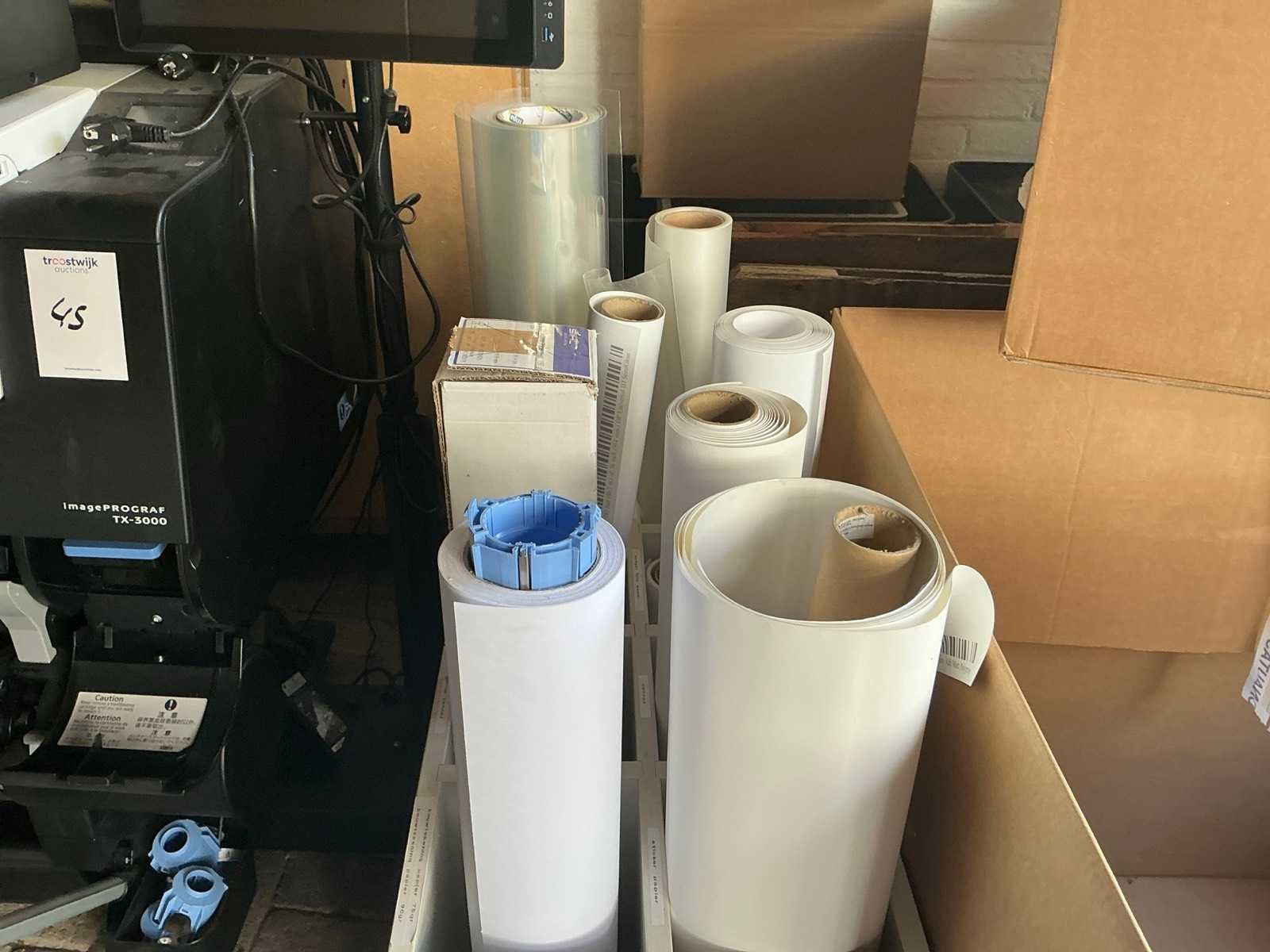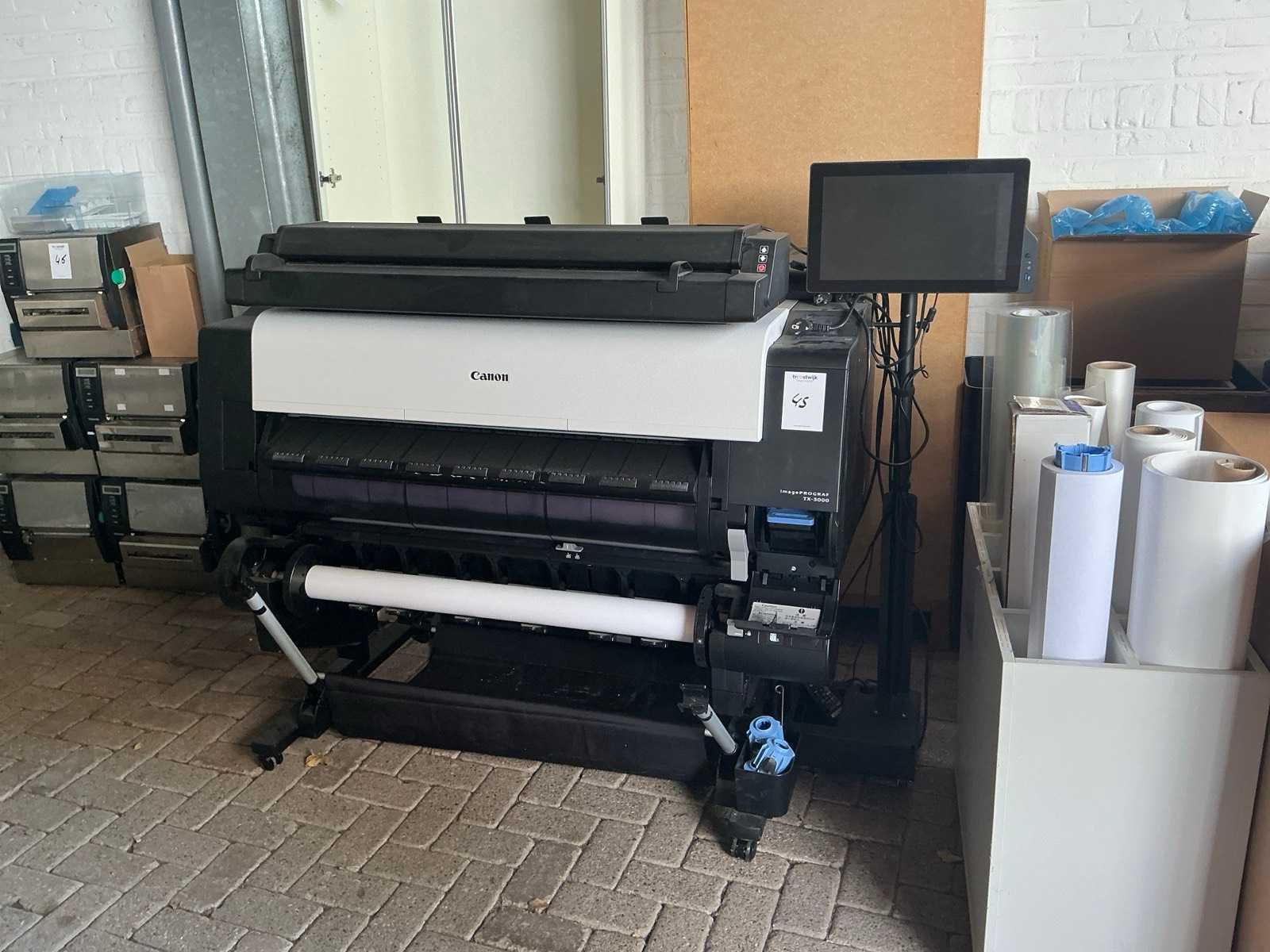 36 inch printer; met diverse rollen papier en kunststof folie Merk: Canon Type: ImagePrograf TX-3000 Lengte: 175cm Breedte: 90cm Hoogte: 136cm