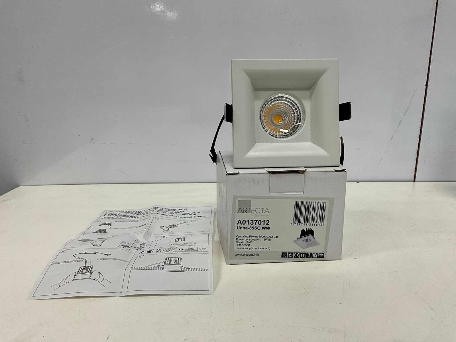 Zonder driver Merk: Artecta Model: Unna-85SQ WW Product type: Spot Lichtbron: Led Met lichtbron: true Kleurtemperatuur: Warm wit 3000k Energielabel: A+ Dimbaar: true Wattage: 13W Kleur: Wit Lengte: 10cm Breedte: 10cm Materiaal: Aluminium