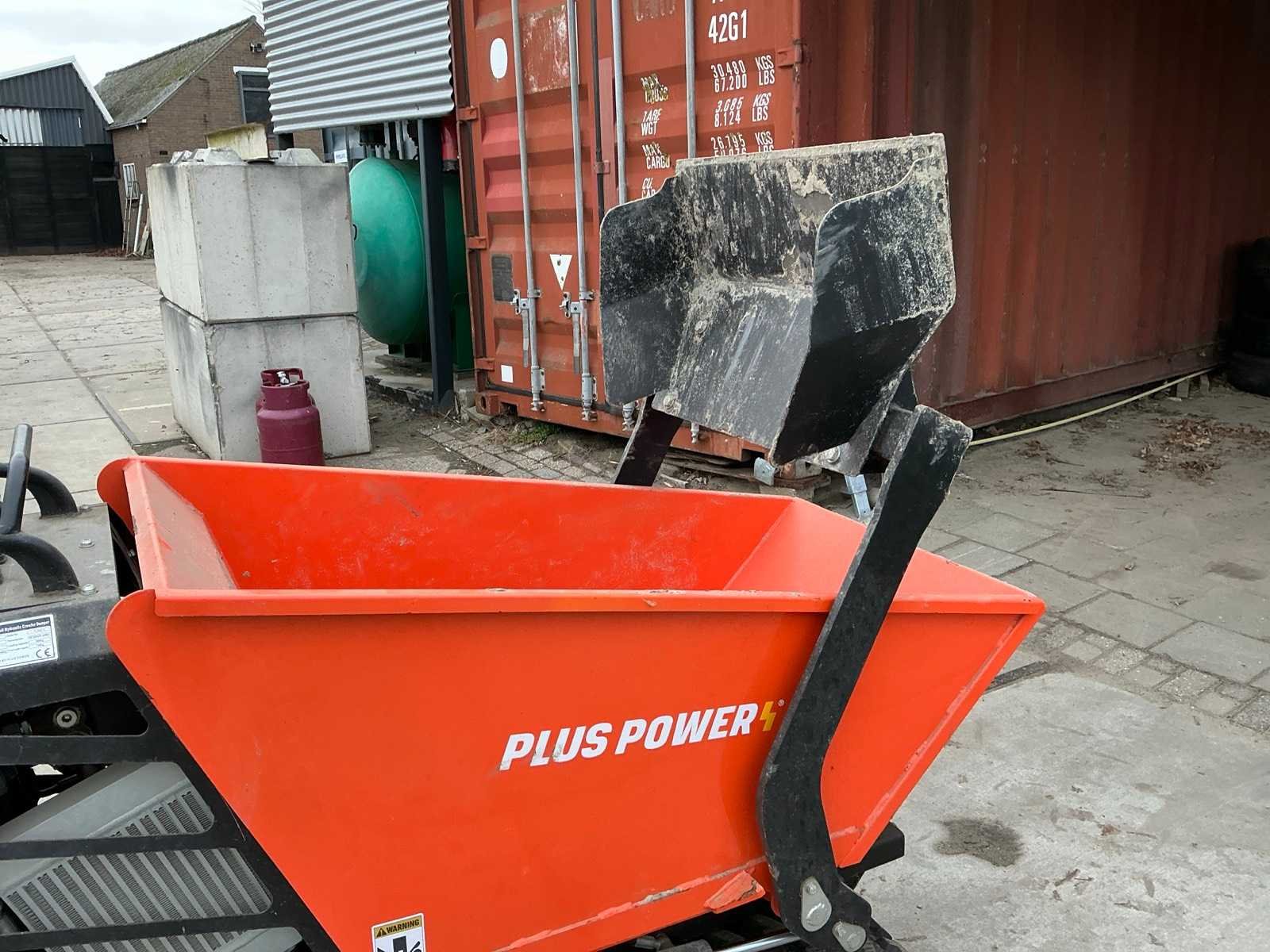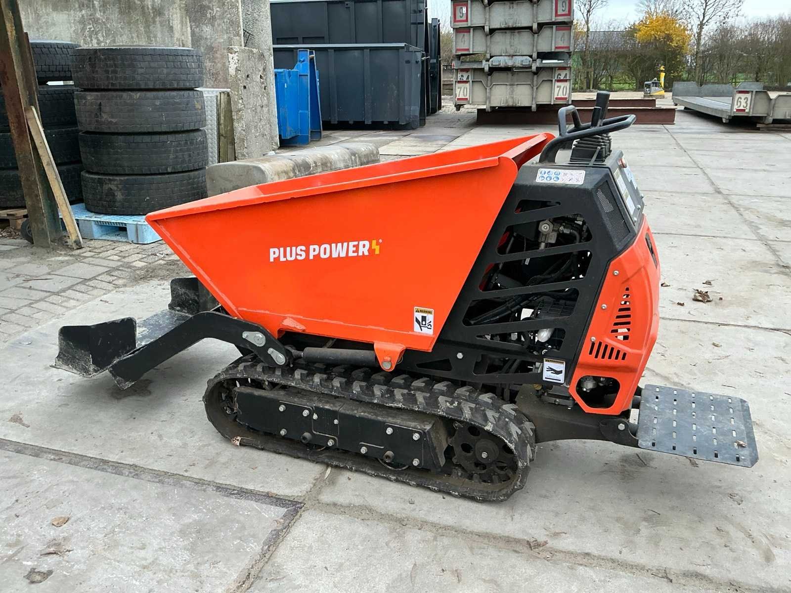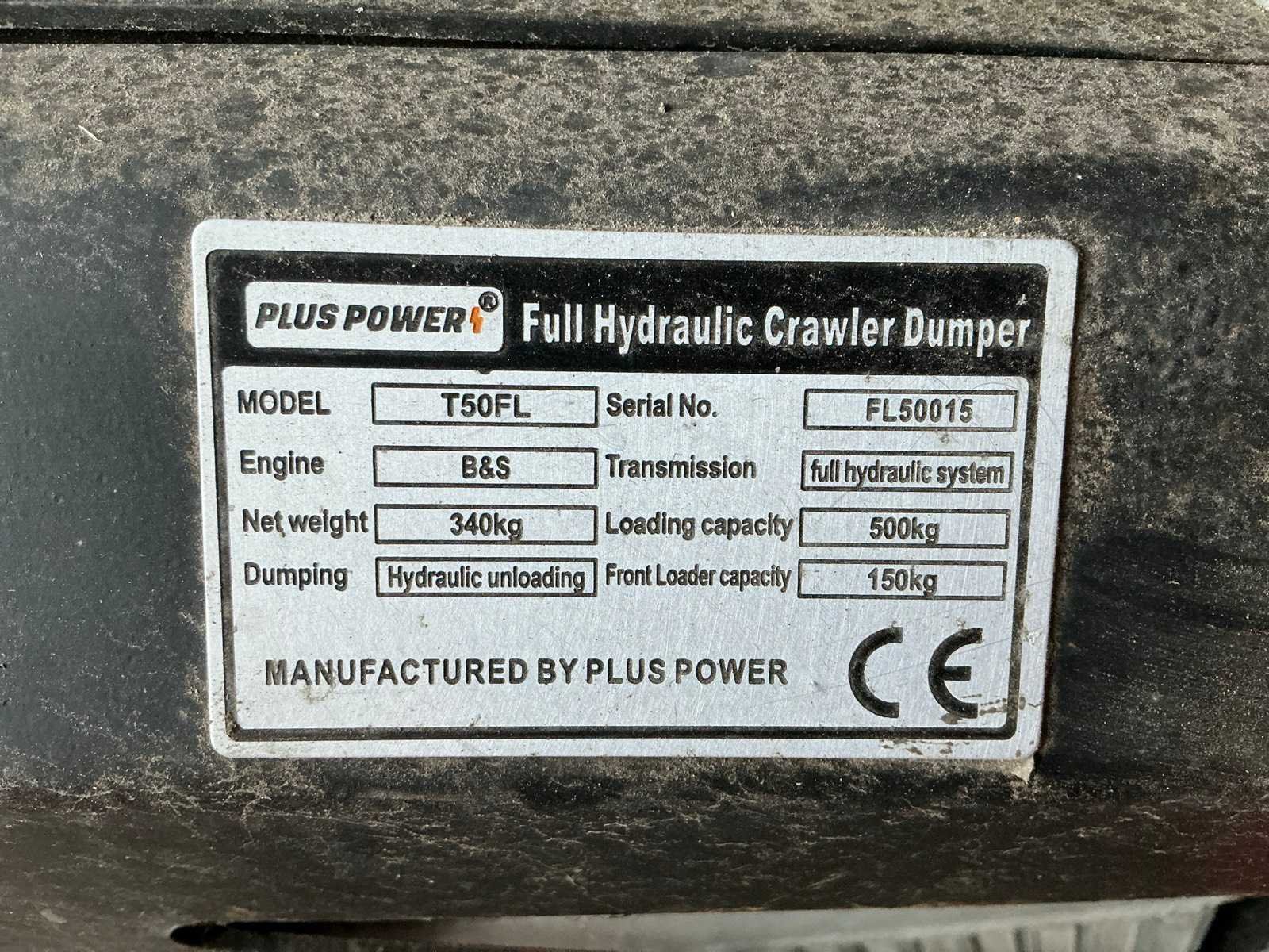 Hydraulische rups dumper met laadschep; afmeting bak (120x66x50cm); werkbreedte 86cm Merk: PLUS POWER Type: T50FL Serienummer: FFL50015 Bouwjaar: 2020 Merk motor: B&S Brandstof: Benzine Laadvermogen: 500kg Bandenmaat: Rups 110x18cm Eigen gewicht: 340kg Totale afmeting L: 1650mm Totale afmeting Breedte: 720mm Totale afmeting Hoogte: 1200mm