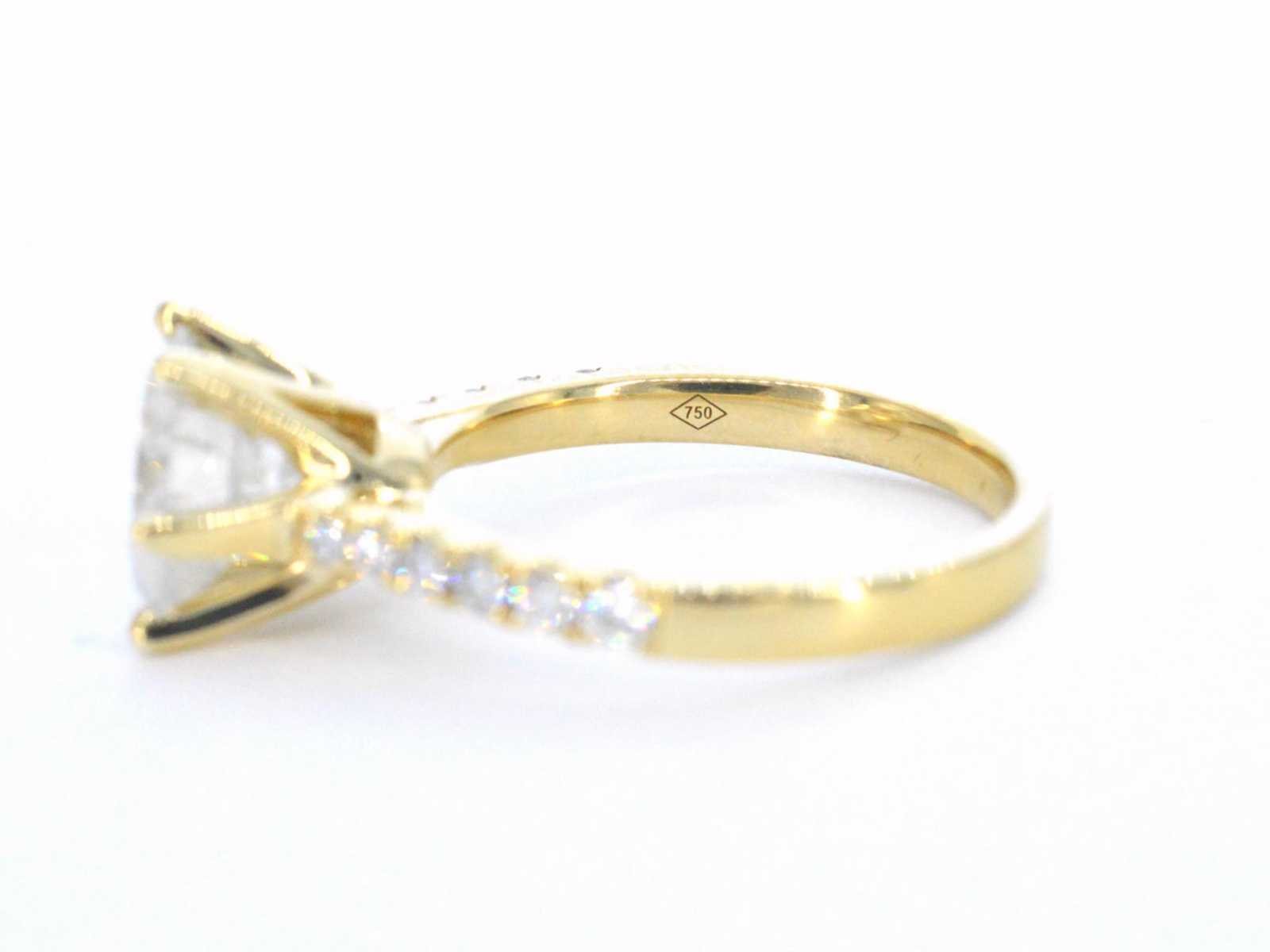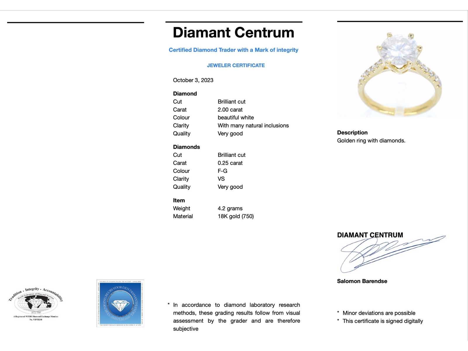 Samenvatting van gegevens Gouden ring met diamant Diamant: Natuurlijk; Aantal: 1 stuk; Slijpvorm: Briljant geslepen; Gewicht (carat): 2.00 carat; Kleur: Mooi wit; Zuiverheid: Met veel natuurlijke insluitsels; Slijpkwaliteit: Zeer mooi; Diamant (secundair): Diamanten; Aantal diamanten: 12 stuks; Slijpvorm: Briljant geslepen; Gewicht (carat): 0.25 carat; Kleur: F-G; Zuiverheid: VS; Slijpkwaliteit: Heel goed; Juweel: Ring; Gewicht: 4 gram; Ringmaat (op maat gemaakt*): 53 (17 mm); Materiaal: 18K goud (750); Conditie: Zo goed als nieuw; Verpakking: Luxe sieradendoos; Toelichting: De kwaliteit is overgenomen van het rapport behorend bij item. De waardebepaling is een beoordeling van een gecertificeerde diamantair, gebaseerd op consumentenprijzen.; Consumentenprijs: € 20.650,- Within 14 days Materiaal: Goud Voornaamste diamant: Natuurlijk Gewicht diamant: 2.00ct Totaal gewicht: 4g Keurmerk: 750 Kleur diamant: Mooi wit Slijpvorm diamant: Briljant geslepen Slijpkwaliteit diamant: Zeer mooi Zuiverheidsgraad diamant: Met veel natuurlijke insluitsels