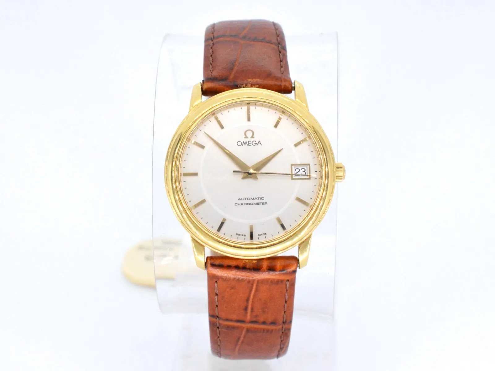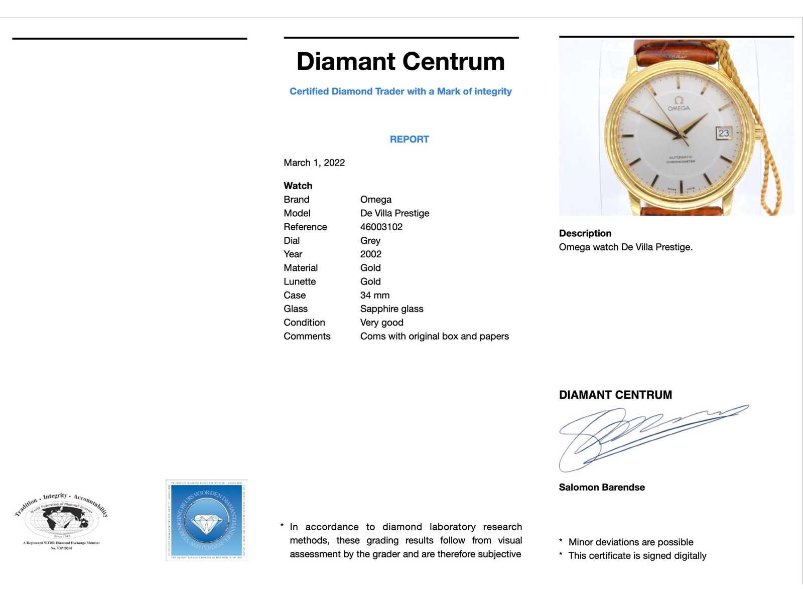 Samenvatting van gegevens Omega De Ville Prestige 34 mm automaat Horloge (Merk): Omega; Model: De Ville Prestige; Referentie: 46003102; Jaar: 2002; Wijzerplaat: grijs; Klok (type): Automaat; Kast doorsnede: 34 mm; Lunette: Goud; Glas: Saffierglas; Toebehoren: Orginele doos en papieren; Juweel: Horloge; Materiaal: goud; Conditie: Zeer mooi; Toelichting: De kwaliteit is overgenomen van het rapport behorend bij item.; Within 14 days