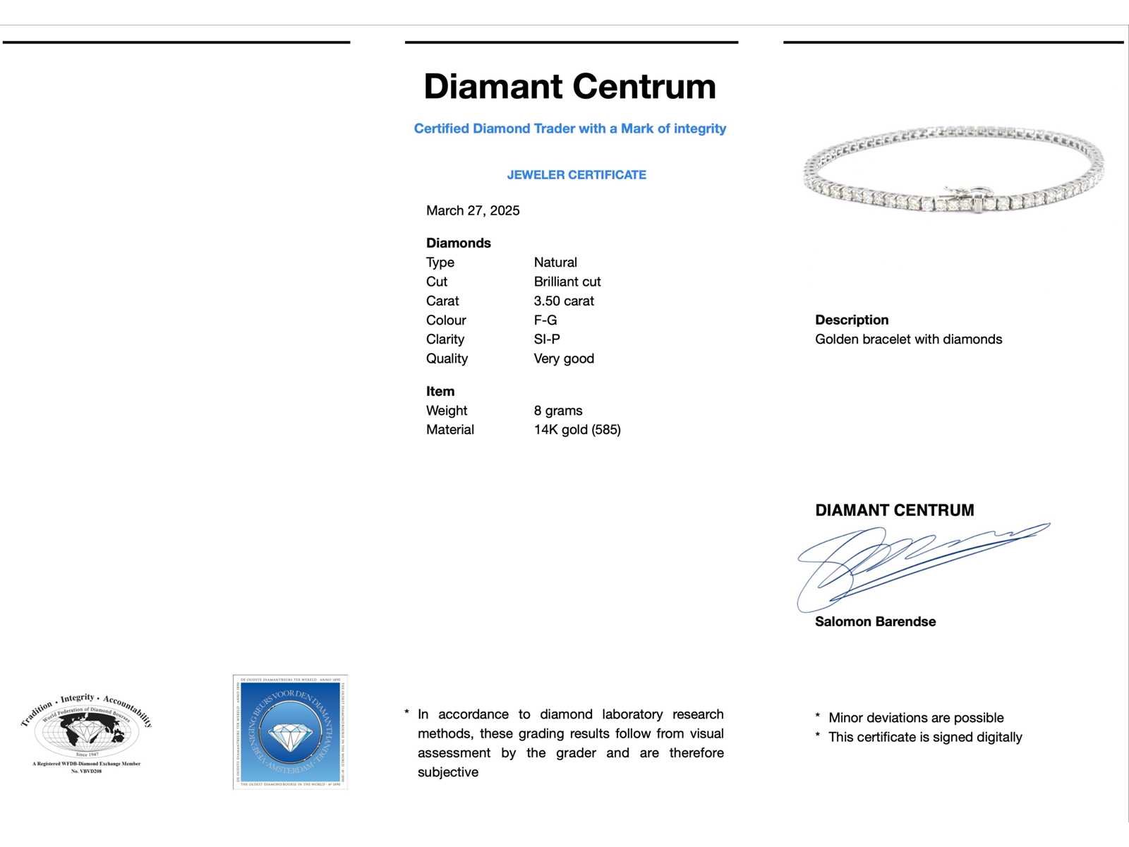 Samenvatting van gegevens Witgouden armband met diamanten 3.50 carat Diamant: Natuurlijk; Aantal: 72 stuks; Slijpvorm: Briljant geslepen; Gewicht (carat): 3.50 carat; Kleur: F-G; Zuiverheid: SI-P; Slijpkwaliteit: Zeer mooi; Juweel: Armband; Gewicht: 8 gram; Afmetingen/lengte: 18 cm; Materiaal: 14k goud (585); Conditie: Nieuw; Verpakking: Luxe sieradendoos; Toelichting: De kwaliteit is overgenomen van het rapport behorend bij item. De waardebepaling is een beoordeling van een gecertificeerde diamantair, gebaseerd op consumentenprijzen.; Consumentenprijs: € 8.435,- Within 14 days Materiaal: Goud Voornaamste diamant: Natuurlijk Kleur diamant: F-G Gewicht diamant: 3.50ct Slijpvorm diamant: Briljant geslepen Slijpkwaliteit diamant: Zeer mooi Zuiverheidsgraad diamant: SI-P Totaal gewicht: 8g Keurmerk: 585