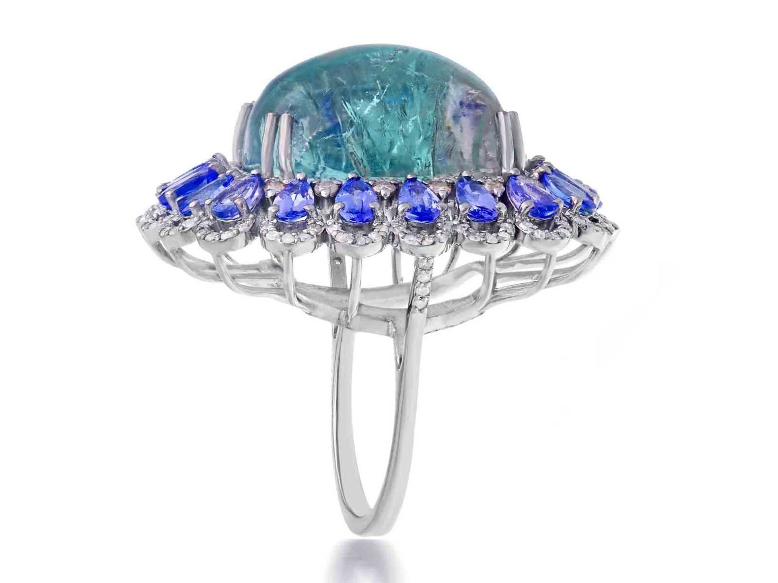 Samenvatting van gegevens Groot uitgevoerde art-deco ring met natuurlijke diamanten een grote tourmalijn en tanzanieten Diamant: Echte Natuurlijk diamanten; Gewicht (carat): 1.50 carat; Zuiverheid: Met natuurlijke insluitsels; Edelsteen: Natuurlijke Toermalijn; Slijpvorm: Cabochon; Gewicht (carat): 34.00 carat; Kleur: Turquoise getint; Zuiverheid: Mat natuurlijke insluitsels; Edelsteen (secundair): Natuurlijke Tanzanieten; Slijpvorm: Peer vorm; Gewicht (carat): 4.00 carat; Kleur: Paars; Zuiverheid: Met natuurlijke insluitsels; Juweel: Ring; Gewicht: 16 gram; Ringmaat (op maat gemaakt*): 56 (17.75 mm); Materiaal: Hoge kwaliteit zilver; Conditie: Vintage; Verpakking: Sieradendoos of fluwelen etui; Toelichting: De kwaliteit is overgenomen van het rapport behorend bij item. De waardebepaling is een beoordeling van een gecertificeerde diamantair, gebaseerd op consumentenprijzen.; Extra informatie: Dit is een met de hand vervaardigd sieraad.; Consumentenprijs: € 7.200,- Within 14 days Materiaal: Zilver Voornaamste diamant: Echte Natuurlijk diamanten Gewicht diamant: 1.50ct Edelsteen: Natuurlijke Toermalijn Totaal gewicht: 16g Zuiverheidsgraad diamant: Met natuurlijke insluitsels Kleur edelsteen: Turquoise getint Slijpvorm edelsteen: Cabochon Zuiverheidsgraad edelsteen: Mat natuurlijke insluitsels