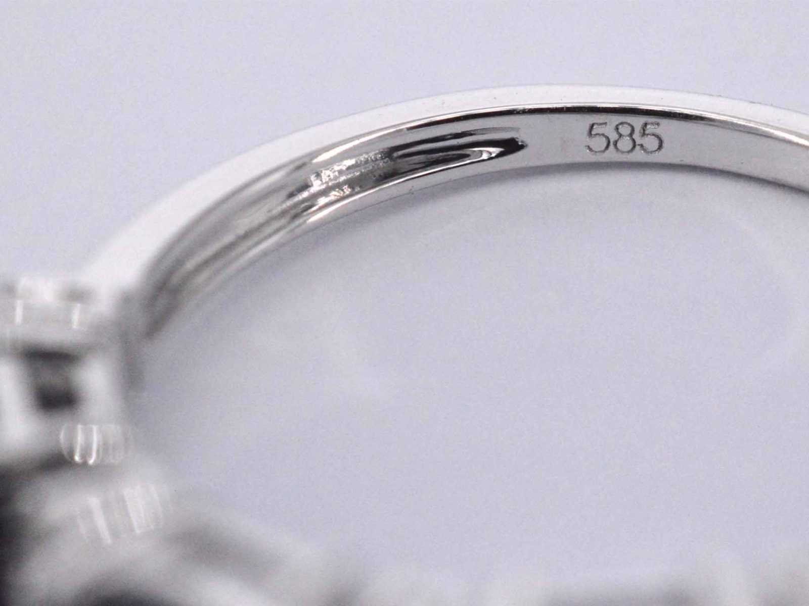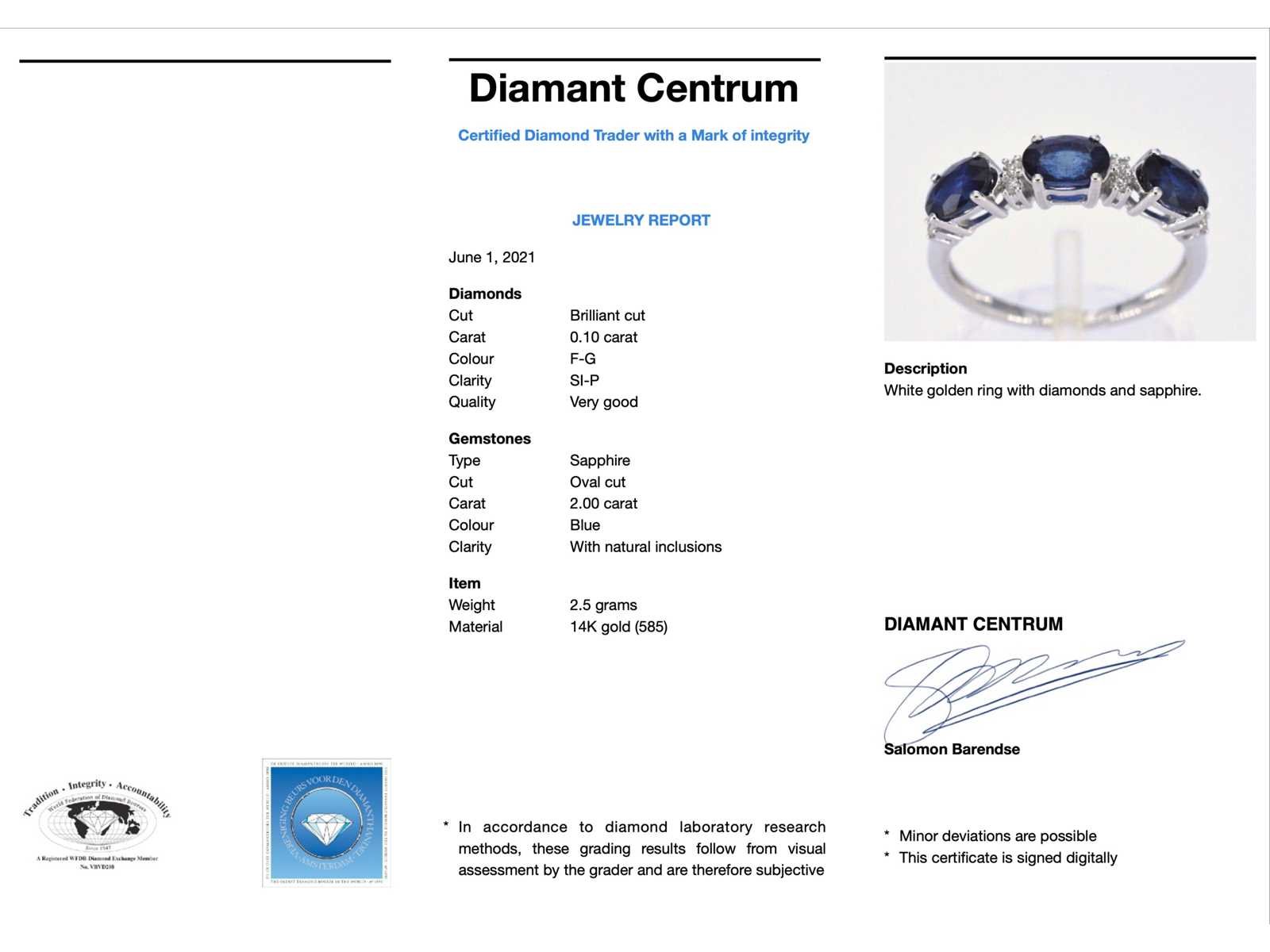 Samenvatting van gegevens Witgouden ring met diamanten en saffier Diamant: Natuurlijk; Slijpvorm: Briljant geslepen; Gewicht (carat): 0.10 carat; Kleur: F-G; Zuiverheid: SI-P; Slijpkwaliteit: Zeer mooi; Edelsteen: Saffier; Slijpvorm: Ovaal geslepen; Gewicht (carat): 2.00 carat; Juweel: Ring; Gewicht: 2.5 gram; Ringmaat (op maat gemaakt*): 54 (17.25 mm); Materiaal: 14k goud (585); Conditie: Nieuw; Verpakking: Luxe sieradendoos; Toelichting: De kwaliteit is overgenomen van het rapport behorend bij item. De waardebepaling is een beoordeling van een gecertificeerde diamantair, gebaseerd op consumentenprijzen.; Consumentenprijs: € 1.698,- Within 14 days Materiaal: Goud Voornaamste diamant: Natuurlijk Gewicht diamant: 0.10ct Edelsteen: Saffier Totaal gewicht: 2.5g Keurmerk: 585 Kleur diamant: F-G Slijpvorm diamant: Briljant geslepen Slijpkwaliteit diamant: Zeer mooi Zuiverheidsgraad diamant: SI-P Slijpvorm edelsteen: Ovaal geslepen