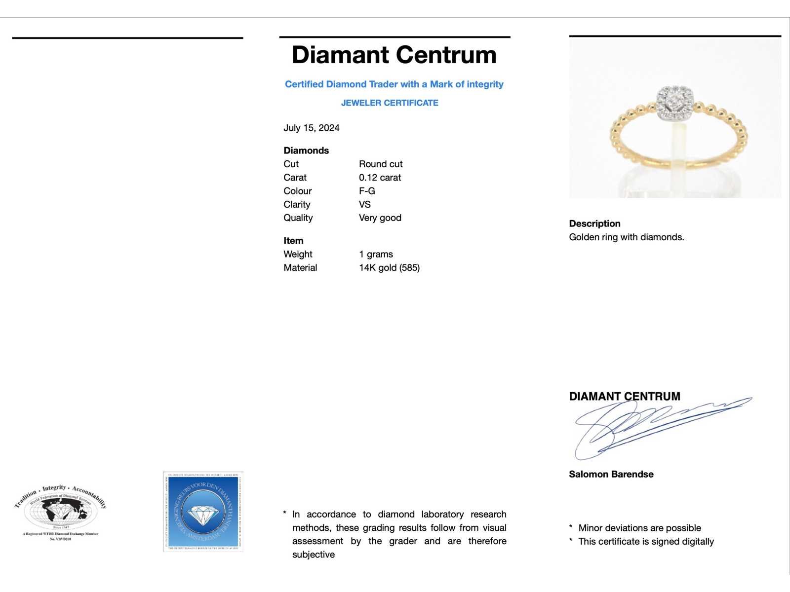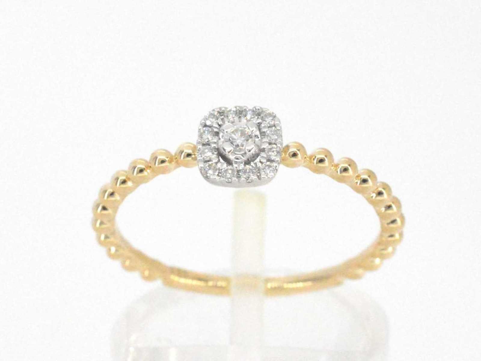 Samenvatting van gegevens Gouden ring met natuurlijke geslepen briljant diamanten Diamant: Natuurlijk; Aantal: 9 stuks; Slijpvorm: Rond geslepen; Gewicht (carat): 0.12 carat; Kleur: F-G; Zuiverheid: VS; Slijpkwaliteit: Zeer mooi; Juweel: Ring; Gewicht: 1 gram; Ringmaat (op maat gemaakt*): 54 (17.25 mm); Materiaal: 14k goud (585); Conditie: Nieuw; Verpakking: Luxe sieradendoos; Toelichting: De kwaliteit is overgenomen van het rapport behorend bij item. De waardebepaling is een beoordeling van een gecertificeerde diamantair, gebaseerd op consumentenprijzen.; Consumentenprijs: € 1.103,- Within 14 days Materiaal: Goud Voornaamste diamant: Natuurlijk Gewicht diamant: 0.12ct Totaal gewicht: 1g Keurmerk: 585 Kleur diamant: F-G Slijpvorm diamant: Rond geslepen Slijpkwaliteit diamant: Zeer mooi Zuiverheidsgraad diamant: VS