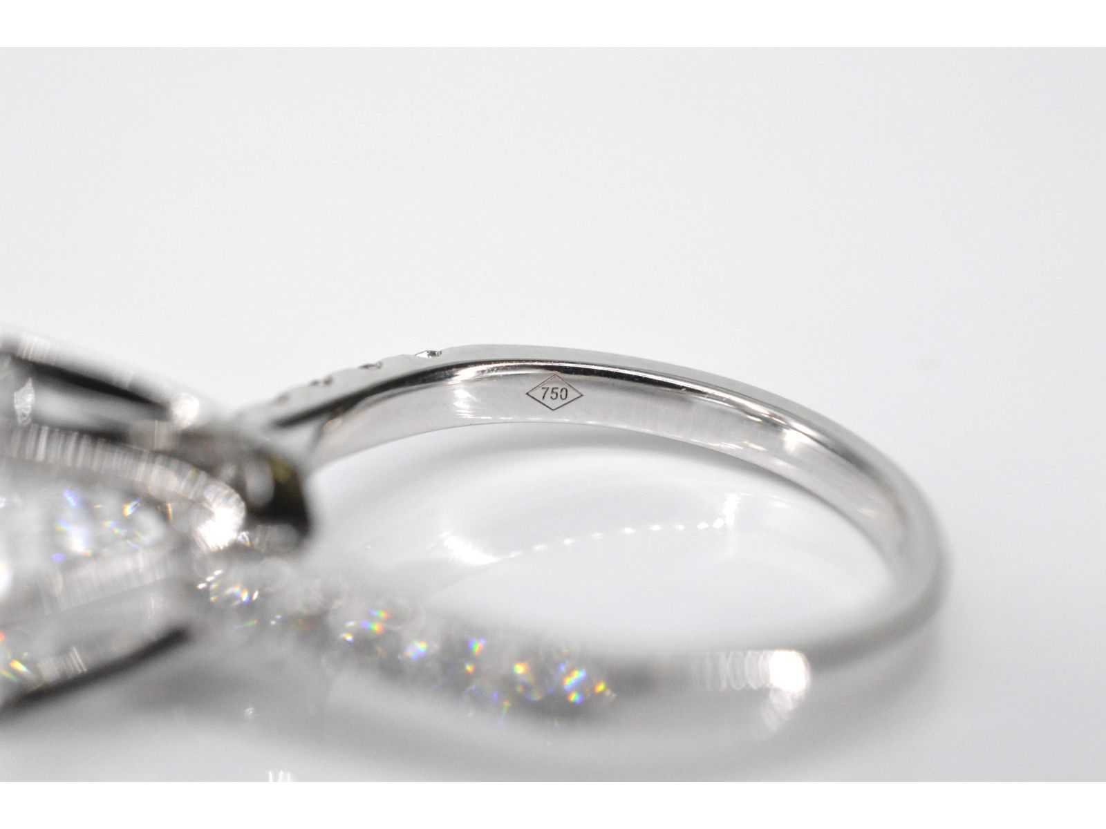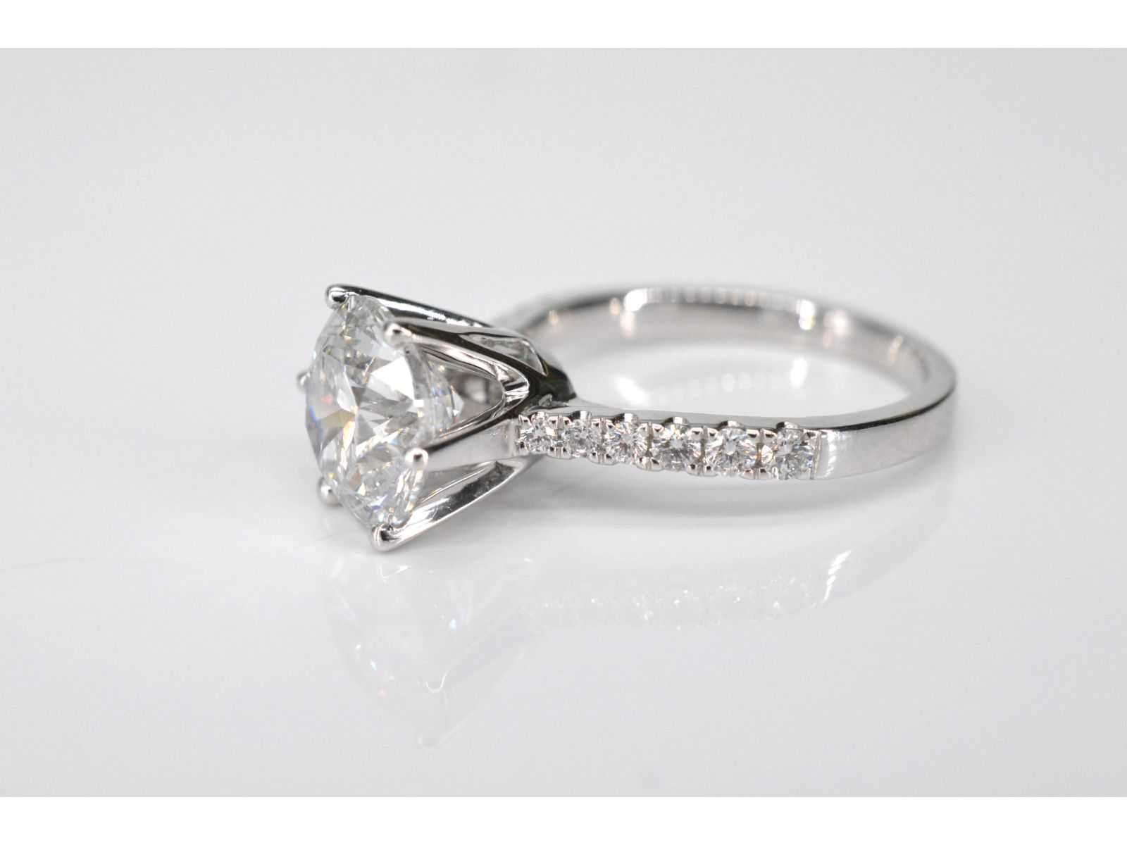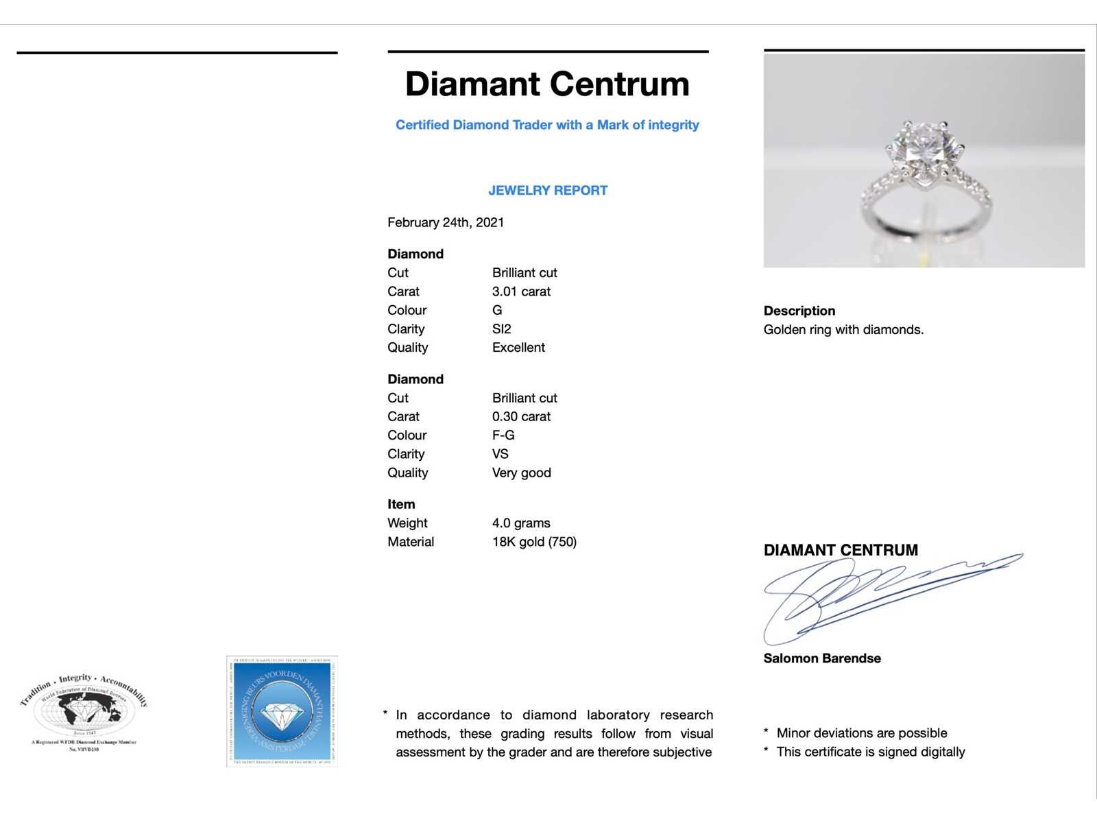 Samenvatting van gegevens Witgouden ring met een diamant van 3.01 carat Diamant: Natuurlijk; Aantal: 1 stuk; Slijpvorm: Briljant geslepen; Gewicht (carat): 3.01 carat; Kleur: G; Zuiverheid: SI2; Slijpkwaliteit: Excellent; Diamant (secundair): Kleine diamanten; Slijpvorm: Briljant geslepen; Gewicht (carat): 0.30 carat; Kleur: F-G; Zuiverheid: VS; Juweel: Ring; Gewicht: 4 gram; Ringmaat (op maat gemaakt*): 53 (17 mm); Materiaal: 18K goud (750); Conditie: Nieuw; Verpakking: Luxe sieradendoos; Toelichting: De kwaliteit is overgenomen van het rapport behorend bij item. De waardebepaling is een beoordeling van een gecertificeerde diamantair, gebaseerd op consumentenprijzen.; Consumentenprijs: € 99.250,- Within 14 days Materiaal: Goud Voornaamste diamant: Natuurlijk Gewicht diamant: 3.01ct Totaal gewicht: 4g Keurmerk: 750 Kleur diamant: G Slijpvorm diamant: Briljant geslepen Slijpkwaliteit diamant: Excellent Zuiverheidsgraad diamant: SI2
