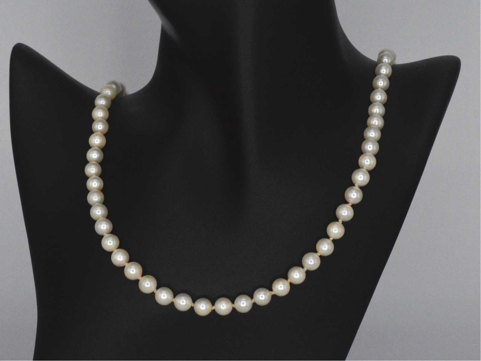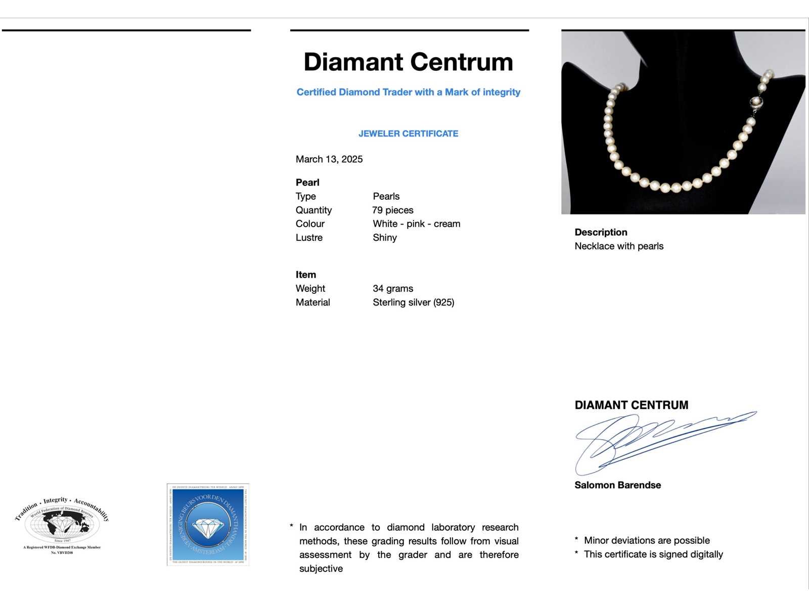 Samenvatting van gegevens Parelsnoer met silveren sluiting Parel: Parels; Aantal stuks: 79 stuks; Kleur: Wit - roze - creme; Afmeting: 6.5 - 7 mm; Luster: Glanzend; Juweel: Halsketting; Gewicht: 34 gram; Afmetingen/lengte: 49 cm; Materiaal: Sterling zilver (925); Conditie: Nieuw; Verpakking: Sieradendoos of fluwelen etui; Toelichting: De kwaliteit is overgenomen van het rapport behorend bij item. De waardebepaling is een beoordeling van een gecertificeerde diamantair, gebaseerd op consumentenprijzen.; Consumentenprijs: € 1.980,- Within 14 days Materiaal: Zilver Totaal gewicht: 34g Keurmerk: 925