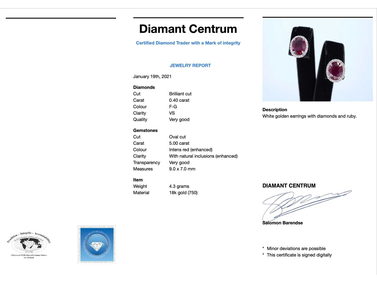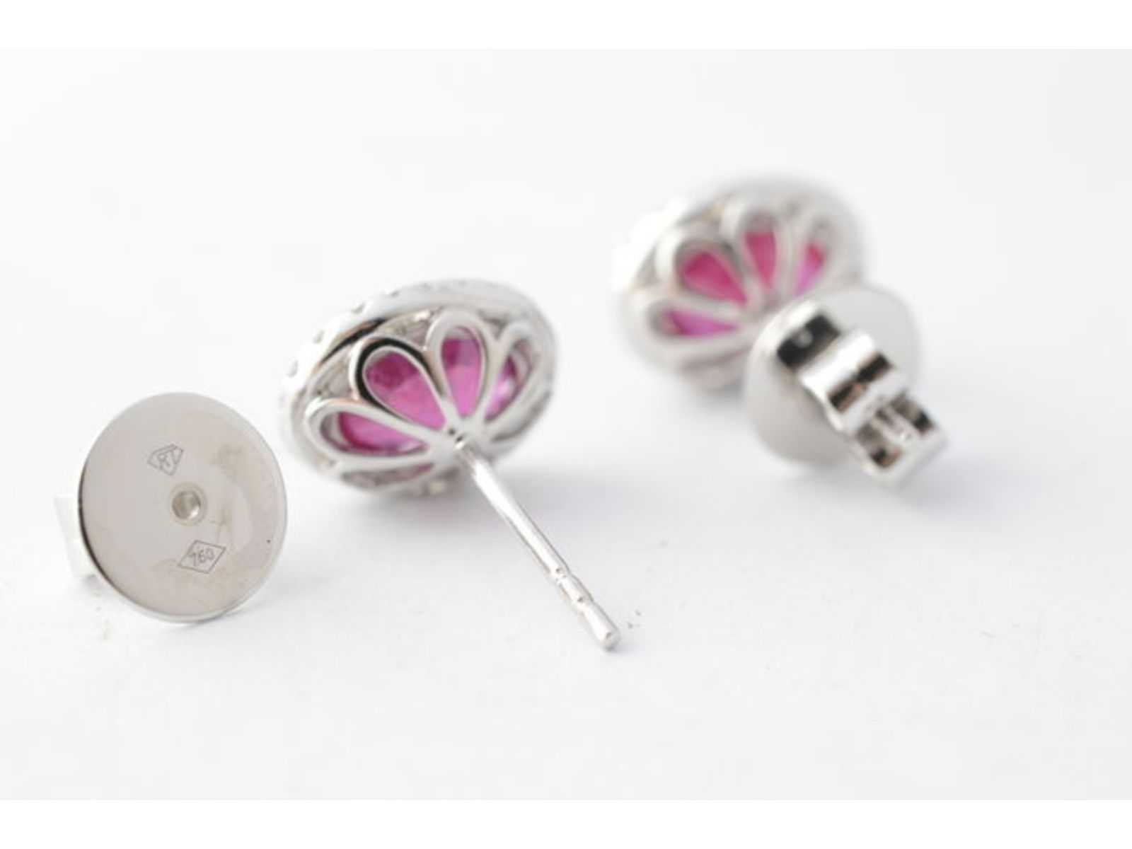 Samenvatting van gegevens Witgouden entourage oorbellen met diamanten en robijn Diamant: Natuurlijk; Slijpvorm: Briljant geslepen; Gewicht (carat): 0.40 carat; Kleur: F-G; Zuiverheid: VS; Slijpkwaliteit: Zeer mooi; Edelsteen: Robijn; Slijpvorm: Ovaal; Gewicht (carat): 5.00 carat; Kleur: Intense rood (enhanced); Zuiverheid: Met natuurlijke insluitsels (enhanced); Afmetingen: 9.0 x 7.0 cm; Juweel: Oorbellen; Gewicht: 4.3 gram; Afmetingen/lengte: 11 x 10 mm; Materiaal: 18K goud (750); Conditie: Nieuw; Verpakking: Luxe sieradendoos; Toelichting: De kwaliteit is overgenomen van het rapport behorend bij item. De waardebepaling is een beoordeling van een gecertificeerde diamantair, gebaseerd op consumentenprijzen.; Consumentenprijs: € 5.425,- Within 14 days Materiaal: Goud Voornaamste diamant: Natuurlijk Kleur diamant: F-G Gewicht diamant: 0.40ct Slijpvorm diamant: Briljant geslepen Slijpkwaliteit diamant: Zeer mooi Zuiverheidsgraad diamant: VS Edelsteen: Robijn Kleur edelsteen: Intense rood (enhanced) Slijpvorm edelsteen: Ovaal Zuiverheidsgraad edelsteen: Met natuurlijke insluitsels (enhanced) Totaal gewicht: 4.3g Keurmerk: 750