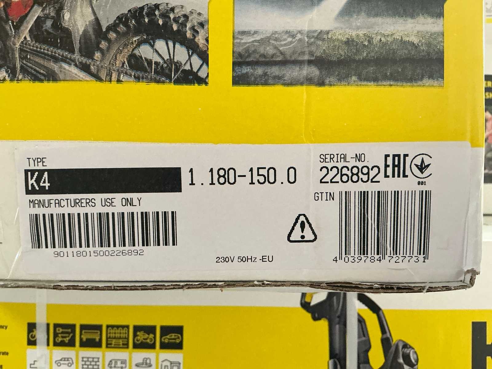 Product zit ongebruikt in de originele verpakking Merk: Kärcher Type: K4 power Serienummer: 4039784727731 Maximale werkdruk: 130bar Capaciteit.: 420l/hr