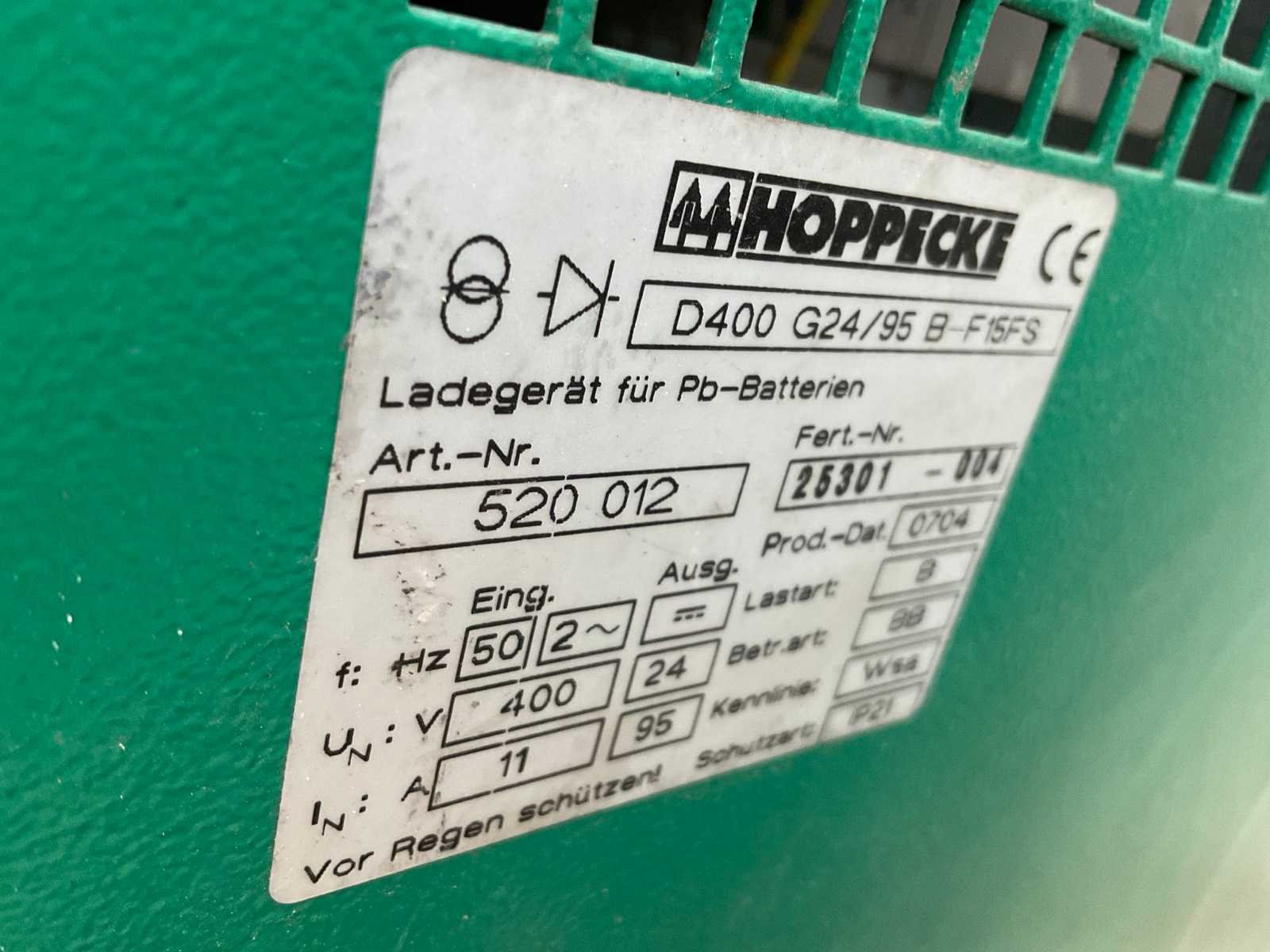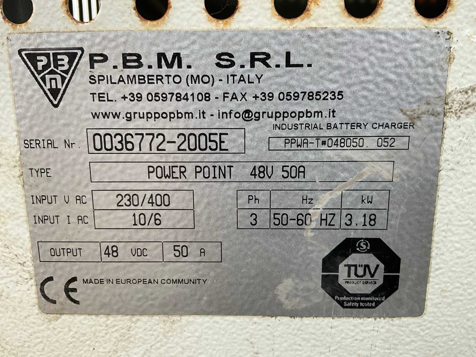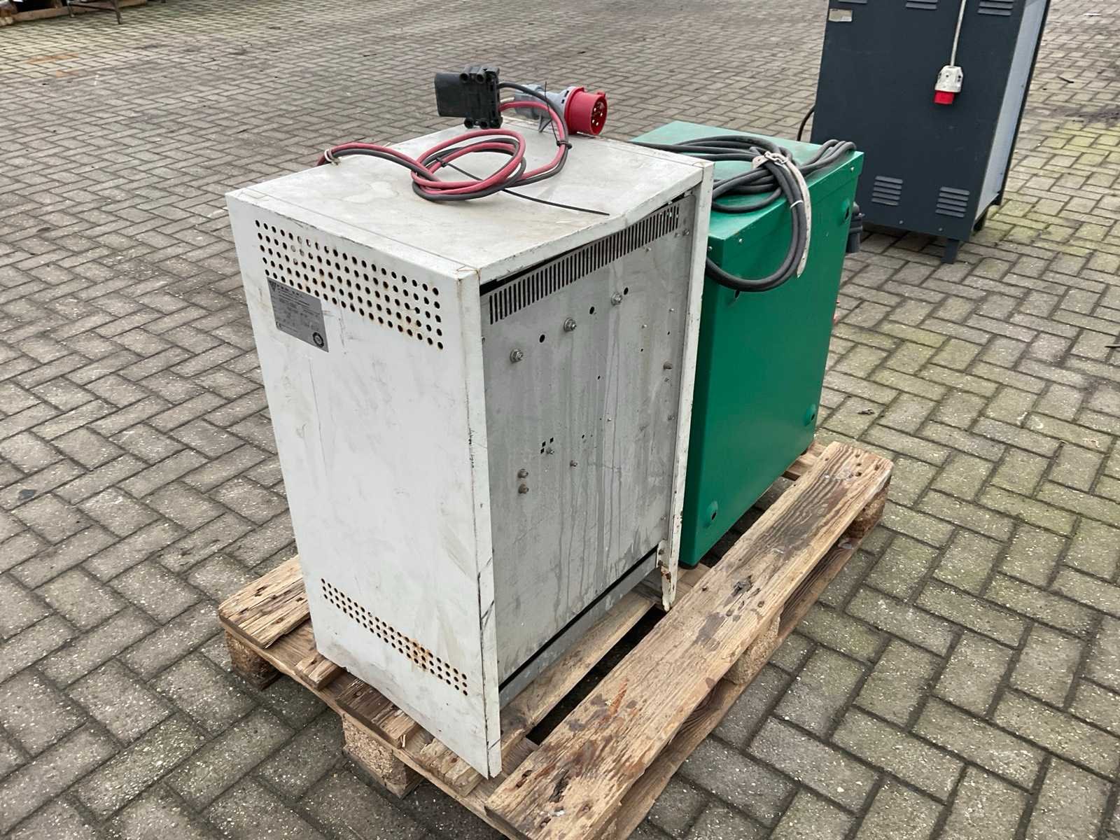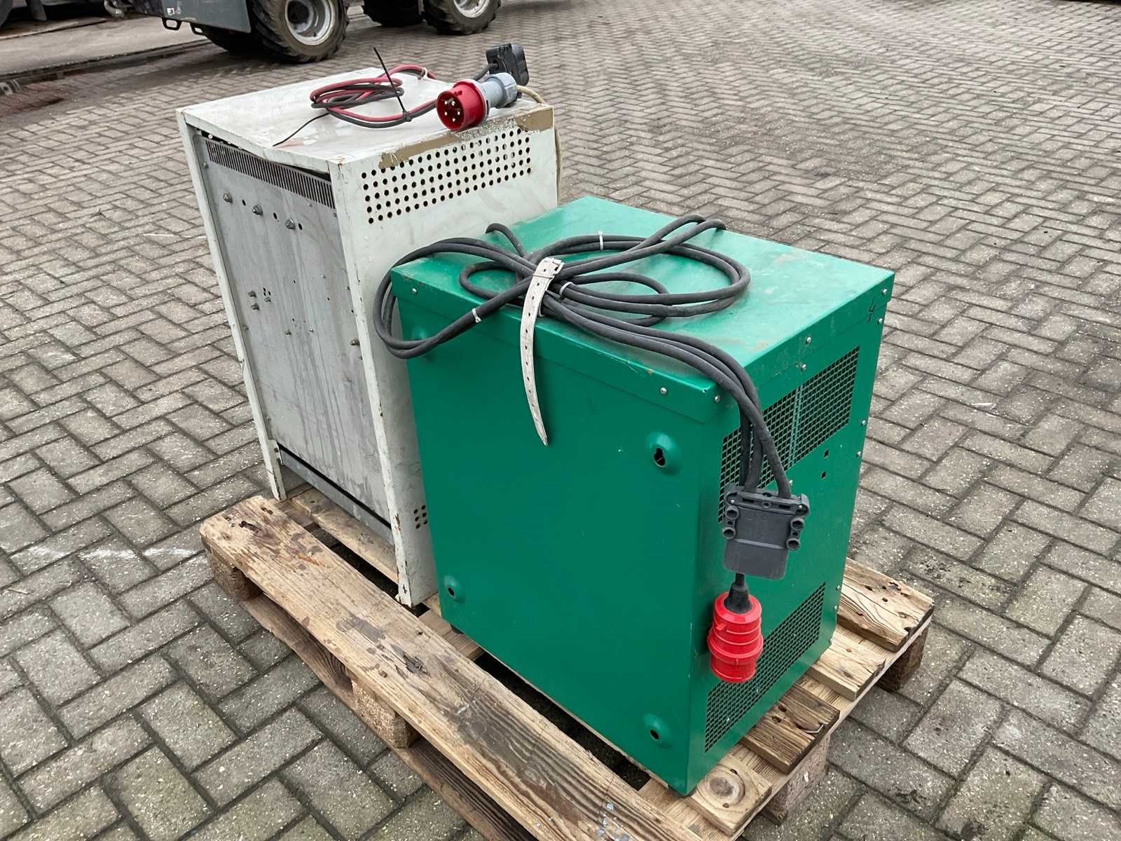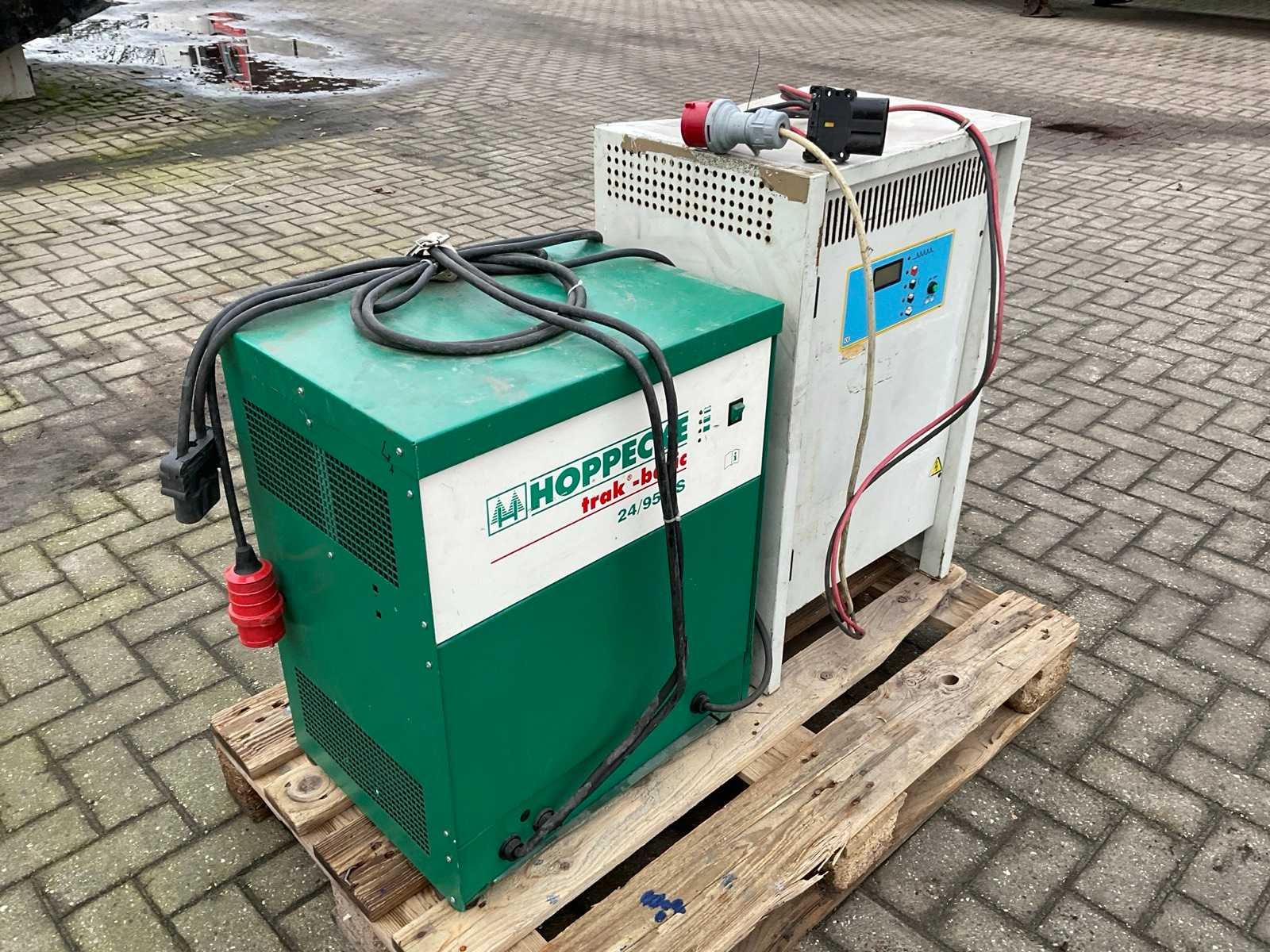 Bestaande uit: 1x Hoppecke Trak-basic 24/95 FS, 40x53x67 cm; 1x P.B.M. Power Point 48V 50 A, 40x50x80 cm.