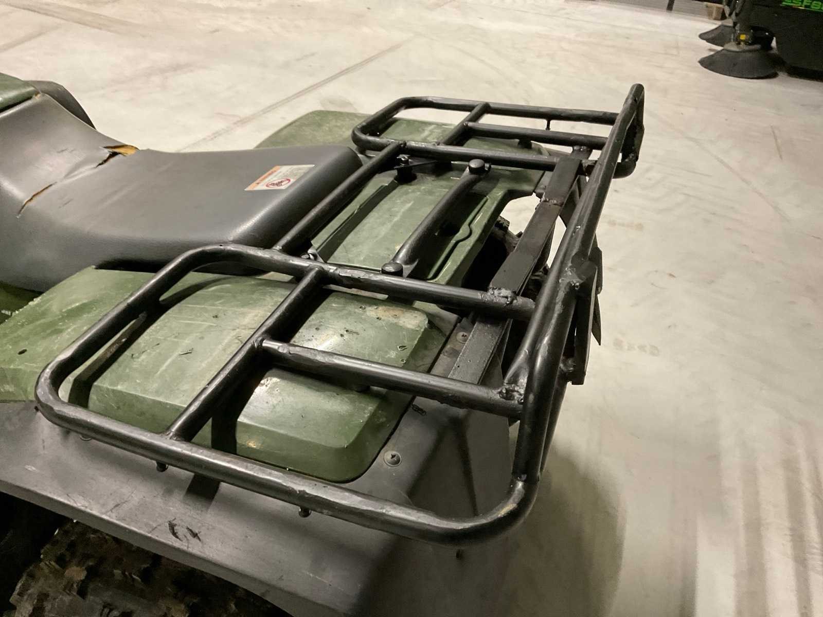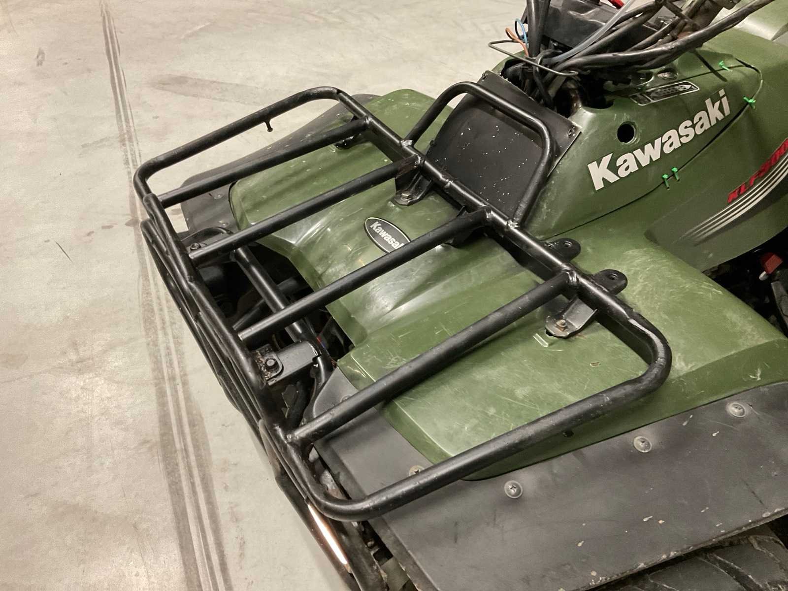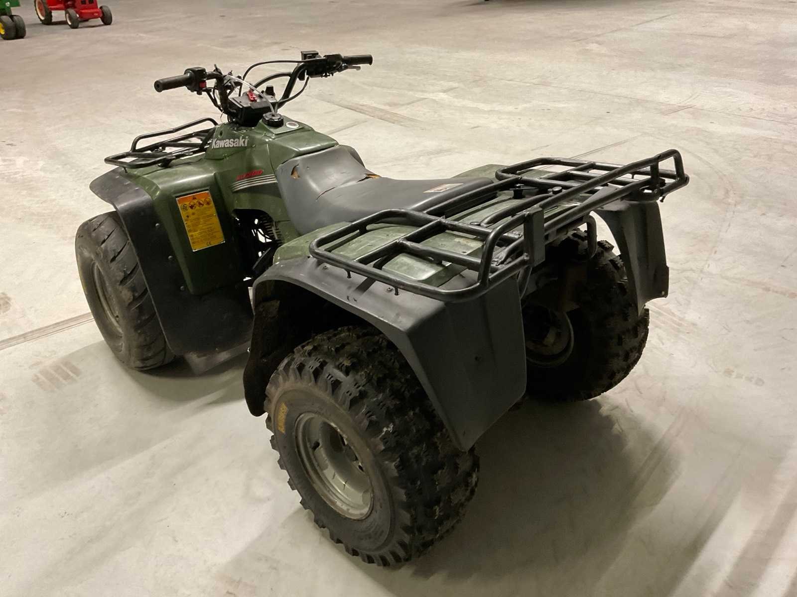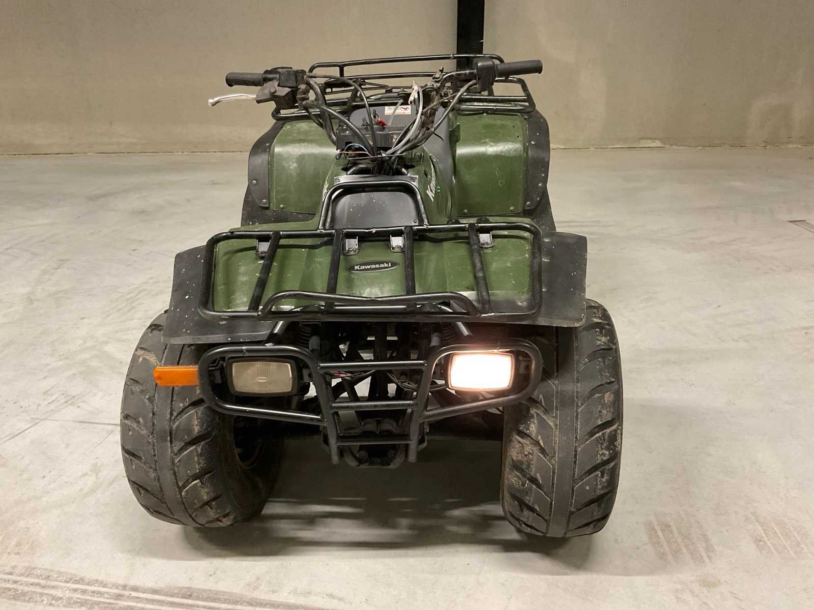 2x rek, eventueel handmatig te startten. Merk: Kawasaki Model: KLF300 Chassisnummer: JKALF300BBB6159527 Gewicht: 239kg Aantal zitplaatsen: 1 Aantal sleutels: 1 Transmissie: 5 versnellingen Vermogen (kW): 14.3kW Brandstof: Benzine Lengte: 190cm Breedte: 105cm Hoogte: 100cm